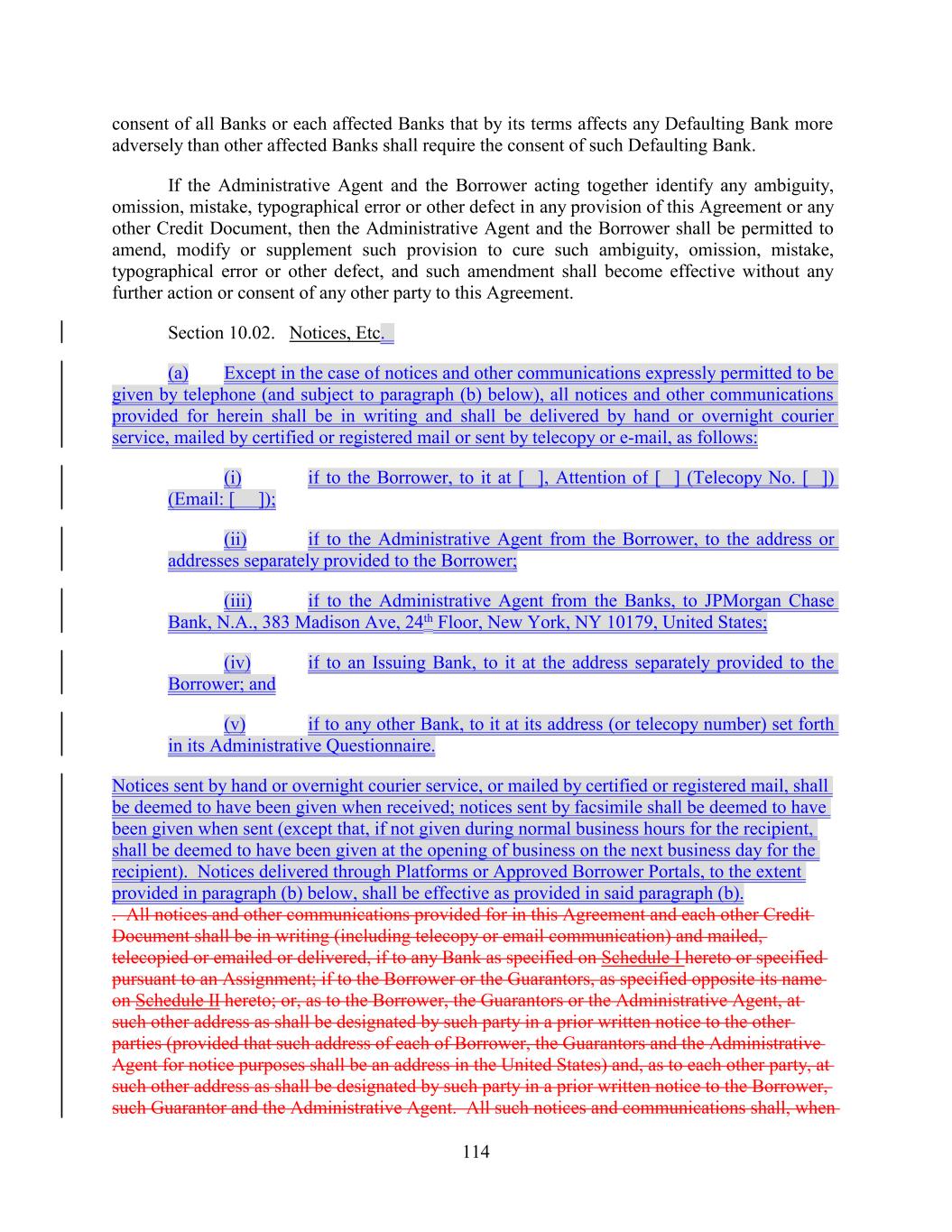 consent of all Banks or each affected Banks that by its terms affects any Defaulting Bank more adversely than other affected Banks shall require the consent of such Defaulting Bank. If the Administrative Agent and the Borrower acting together identify any ambiguity, omission, mistake, typographical error or other defect in any provision of this Agreement or any other Credit Document, then the Administrative Agent and the Borrower shall be permitted to amend, modify or supplement such provision to cure such ambiguity, omission, mistake, typographical error or other defect, and such amendment shall become effective without any further action or consent of any other party to this Agreement. Section 10.02. Notices, Etc. (a) Except in the case of notices and other communications expressly permitted to be given by telephone (and subject to paragraph (b) below), all notices and other communications provided for herein shall be in writing and shall be delivered by hand or overnight courier service, mailed by certified or registered mail or sent by telecopy or e-mail, as follows: (i) if to the Borrower, to it at [ ], Attention of [ ] (Telecopy No. [ ]) (Email: [ ]); (ii) if to the Administrative Agent from the Borrower, to the address or addresses separately provided to the Borrower; (iii) if to the Administrative Agent from the Banks, to JPMorgan Chase Bank, N.A., 383 Madison Ave, 24th Floor, New York, NY 10179, United States; (iv) if to an Issuing Bank, to it at the address separately provided to the Borrower; and (v) if to any other Bank, to it at its address (or telecopy number) set forth in its Administrative Questionnaire. Notices sent by hand or overnight courier service, or mailed by certified or registered mail, shall be deemed to have been given when received; notices sent by facsimile shall be deemed to have been given when sent (except that, if not given during normal business hours for the recipient, shall be deemed to have been given at the opening of business on the next business day for the recipient). Notices delivered through Platforms or Approved Borrower Portals, to the extent provided in paragraph (b) below, shall be effective as provided in said paragraph (b). . All notices and other communications provided for in this Agreement and each other Credit Document shall be in writing (including telecopy or email communication) and mailed, telecopied or emailed or delivered, if to any Bank as specified on Schedule I hereto or specified pursuant to an Assignment; if to the Borrower or the Guarantors, as specified opposite its name on Schedule II hereto; or, as to the Borrower, the Guarantors or the Administrative Agent, at such other address as shall be designated by such party in a prior written notice to the other parties (provided that such address of each of Borrower, the Guarantors and the Administrative Agent for notice purposes shall be an address in the United States) and, as to each other party, at such other address as shall be designated by such party in a prior written notice to the Borrower, such Guarantor and the Administrative Agent. All such notices and communications shall, when 114
