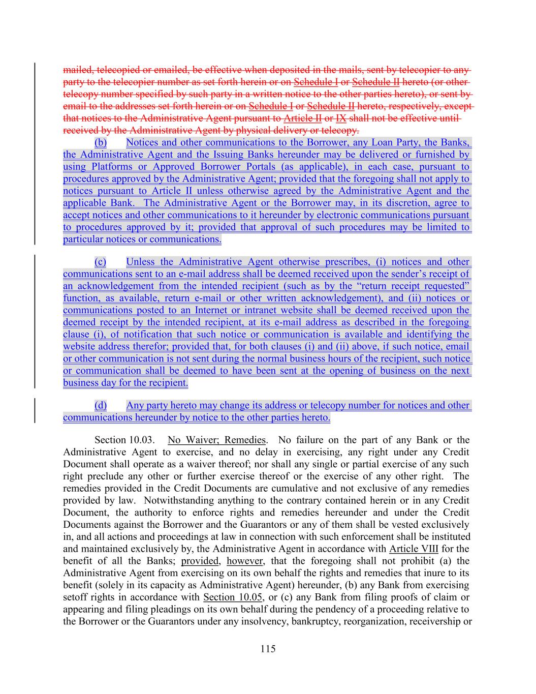 mailed, telecopied or emailed, be effective when deposited in the mails, sent by telecopier to any party to the telecopier number as set forth herein or on Schedule I or Schedule II hereto (or other telecopy number specified by such party in a written notice to the other parties hereto), or sent by email to the addresses set forth herein or on Schedule I or Schedule II hereto, respectively, except that notices to the Administrative Agent pursuant to Article II or IX shall not be effective until received by the Administrative Agent by physical delivery or telecopy. (b) Notices and other communications to the Borrower, any Loan Party, the Banks, the Administrative Agent and the Issuing Banks hereunder may be delivered or furnished by using Platforms or Approved Borrower Portals (as applicable), in each case, pursuant to procedures approved by the Administrative Agent; provided that the foregoing shall not apply to notices pursuant to Article II unless otherwise agreed by the Administrative Agent and the applicable Bank. The Administrative Agent or the Borrower may, in its discretion, agree to accept notices and other communications to it hereunder by electronic communications pursuant to procedures approved by it; provided that approval of such procedures may be limited to particular notices or communications. (c) Unless the Administrative Agent otherwise prescribes, (i) notices and other communications sent to an e-mail address shall be deemed received upon the sender’s receipt of an acknowledgement from the intended recipient (such as by the “return receipt requested” function, as available, return e-mail or other written acknowledgement), and (ii) notices or communications posted to an Internet or intranet website shall be deemed received upon the deemed receipt by the intended recipient, at its e-mail address as described in the foregoing clause (i), of notification that such notice or communication is available and identifying the website address therefor; provided that, for both clauses (i) and (ii) above, if such notice, email or other communication is not sent during the normal business hours of the recipient, such notice or communication shall be deemed to have been sent at the opening of business on the next business day for the recipient. (d) Any party hereto may change its address or telecopy number for notices and other communications hereunder by notice to the other parties hereto. Section 10.03. No Waiver; Remedies. No failure on the part of any Bank or the Administrative Agent to exercise, and no delay in exercising, any right under any Credit Document shall operate as a waiver thereof; nor shall any single or partial exercise of any such right preclude any other or further exercise thereof or the exercise of any other right. The remedies provided in the Credit Documents are cumulative and not exclusive of any remedies provided by law. Notwithstanding anything to the contrary contained herein or in any Credit Document, the authority to enforce rights and remedies hereunder and under the Credit Documents against the Borrower and the Guarantors or any of them shall be vested exclusively in, and all actions and proceedings at law in connection with such enforcement shall be instituted and maintained exclusively by, the Administrative Agent in accordance with Article VIII for the benefit of all the Banks; provided, however, that the foregoing shall not prohibit (a) the Administrative Agent from exercising on its own behalf the rights and remedies that inure to its benefit (solely in its capacity as Administrative Agent) hereunder, (b) any Bank from exercising setoff rights in accordance with Section 10.05, or (c) any Bank from filing proofs of claim or appearing and filing pleadings on its own behalf during the pendency of a proceeding relative to the Borrower or the Guarantors under any insolvency, bankruptcy, reorganization, receivership or 115