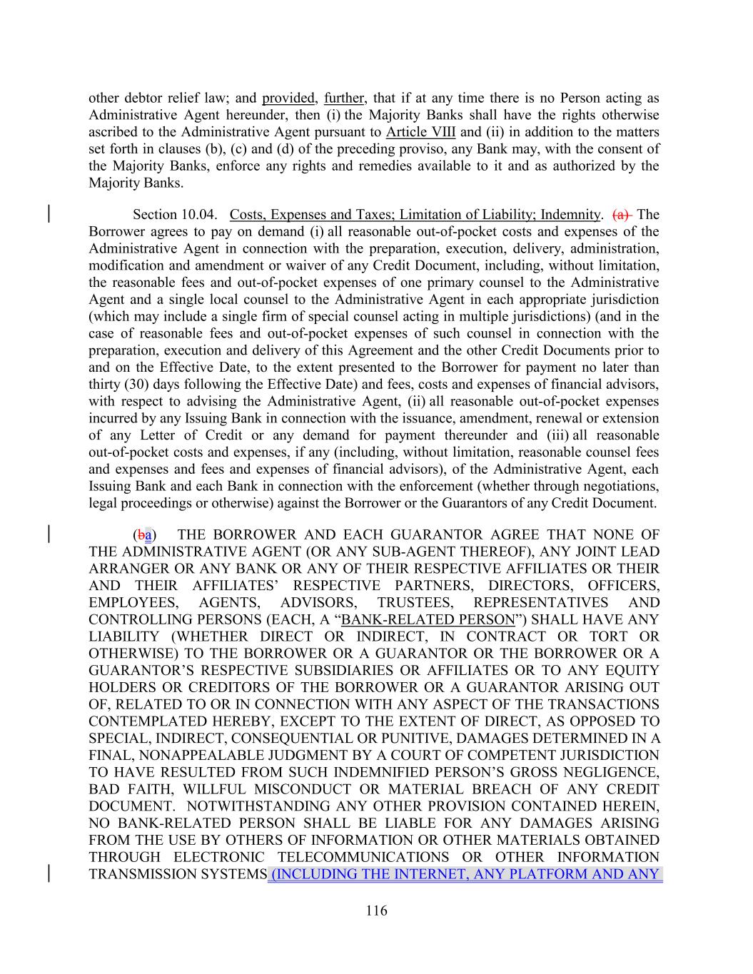 other debtor relief law; and provided, further, that if at any time there is no Person acting as Administrative Agent hereunder, then (i) the Majority Banks shall have the rights otherwise ascribed to the Administrative Agent pursuant to Article VIII and (ii) in addition to the matters set forth in clauses (b), (c) and (d) of the preceding proviso, any Bank may, with the consent of the Majority Banks, enforce any rights and remedies available to it and as authorized by the Majority Banks. Section 10.04. Costs, Expenses and Taxes; Limitation of Liability; Indemnity. (a) The Borrower agrees to pay on demand (i) all reasonable out-of-pocket costs and expenses of the Administrative Agent in connection with the preparation, execution, delivery, administration, modification and amendment or waiver of any Credit Document, including, without limitation, the reasonable fees and out-of-pocket expenses of one primary counsel to the Administrative Agent and a single local counsel to the Administrative Agent in each appropriate jurisdiction (which may include a single firm of special counsel acting in multiple jurisdictions) (and in the case of reasonable fees and out-of-pocket expenses of such counsel in connection with the preparation, execution and delivery of this Agreement and the other Credit Documents prior to and on the Effective Date, to the extent presented to the Borrower for payment no later than thirty (30) days following the Effective Date) and fees, costs and expenses of financial advisors, with respect to advising the Administrative Agent, (ii) all reasonable out-of-pocket expenses incurred by any Issuing Bank in connection with the issuance, amendment, renewal or extension of any Letter of Credit or any demand for payment thereunder and (iii) all reasonable out-of-pocket costs and expenses, if any (including, without limitation, reasonable counsel fees and expenses and fees and expenses of financial advisors), of the Administrative Agent, each Issuing Bank and each Bank in connection with the enforcement (whether through negotiations, legal proceedings or otherwise) against the Borrower or the Guarantors of any Credit Document. (ba) THE BORROWER AND EACH GUARANTOR AGREE THAT NONE OF THE ADMINISTRATIVE AGENT (OR ANY SUB-AGENT THEREOF), ANY JOINT LEAD ARRANGER OR ANY BANK OR ANY OF THEIR RESPECTIVE AFFILIATES OR THEIR AND THEIR AFFILIATES’ RESPECTIVE PARTNERS, DIRECTORS, OFFICERS, EMPLOYEES, AGENTS, ADVISORS, TRUSTEES, REPRESENTATIVES AND CONTROLLING PERSONS (EACH, A “BANK-RELATED PERSON”) SHALL HAVE ANY LIABILITY (WHETHER DIRECT OR INDIRECT, IN CONTRACT OR TORT OR OTHERWISE) TO THE BORROWER OR A GUARANTOR OR THE BORROWER OR A GUARANTOR’S RESPECTIVE SUBSIDIARIES OR AFFILIATES OR TO ANY EQUITY HOLDERS OR CREDITORS OF THE BORROWER OR A GUARANTOR ARISING OUT OF, RELATED TO OR IN CONNECTION WITH ANY ASPECT OF THE TRANSACTIONS CONTEMPLATED HEREBY, EXCEPT TO THE EXTENT OF DIRECT, AS OPPOSED TO SPECIAL, INDIRECT, CONSEQUENTIAL OR PUNITIVE, DAMAGES DETERMINED IN A FINAL, NONAPPEALABLE JUDGMENT BY A COURT OF COMPETENT JURISDICTION TO HAVE RESULTED FROM SUCH INDEMNIFIED PERSON’S GROSS NEGLIGENCE, BAD FAITH, WILLFUL MISCONDUCT OR MATERIAL BREACH OF ANY CREDIT DOCUMENT. NOTWITHSTANDING ANY OTHER PROVISION CONTAINED HEREIN, NO BANK-RELATED PERSON SHALL BE LIABLE FOR ANY DAMAGES ARISING FROM THE USE BY OTHERS OF INFORMATION OR OTHER MATERIALS OBTAINED THROUGH ELECTRONIC TELECOMMUNICATIONS OR OTHER INFORMATION TRANSMISSION SYSTEMS (INCLUDING THE INTERNET, ANY PLATFORM AND ANY 116