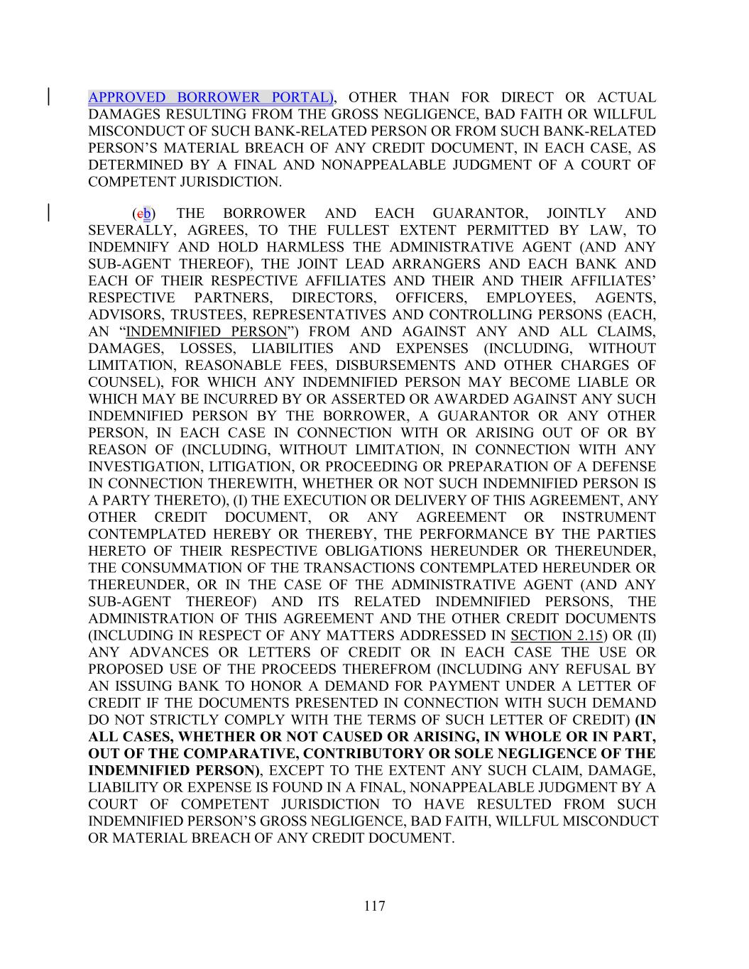 APPROVED BORROWER PORTAL), OTHER THAN FOR DIRECT OR ACTUAL DAMAGES RESULTING FROM THE GROSS NEGLIGENCE, BAD FAITH OR WILLFUL MISCONDUCT OF SUCH BANK-RELATED PERSON OR FROM SUCH BANK-RELATED PERSON’S MATERIAL BREACH OF ANY CREDIT DOCUMENT, IN EACH CASE, AS DETERMINED BY A FINAL AND NONAPPEALABLE JUDGMENT OF A COURT OF COMPETENT JURISDICTION. (cb) THE BORROWER AND EACH GUARANTOR, JOINTLY AND SEVERALLY, AGREES, TO THE FULLEST EXTENT PERMITTED BY LAW, TO INDEMNIFY AND HOLD HARMLESS THE ADMINISTRATIVE AGENT (AND ANY SUB-AGENT THEREOF), THE JOINT LEAD ARRANGERS AND EACH BANK AND EACH OF THEIR RESPECTIVE AFFILIATES AND THEIR AND THEIR AFFILIATES’ RESPECTIVE PARTNERS, DIRECTORS, OFFICERS, EMPLOYEES, AGENTS, ADVISORS, TRUSTEES, REPRESENTATIVES AND CONTROLLING PERSONS (EACH, AN “INDEMNIFIED PERSON”) FROM AND AGAINST ANY AND ALL CLAIMS, DAMAGES, LOSSES, LIABILITIES AND EXPENSES (INCLUDING, WITHOUT LIMITATION, REASONABLE FEES, DISBURSEMENTS AND OTHER CHARGES OF COUNSEL), FOR WHICH ANY INDEMNIFIED PERSON MAY BECOME LIABLE OR WHICH MAY BE INCURRED BY OR ASSERTED OR AWARDED AGAINST ANY SUCH INDEMNIFIED PERSON BY THE BORROWER, A GUARANTOR OR ANY OTHER PERSON, IN EACH CASE IN CONNECTION WITH OR ARISING OUT OF OR BY REASON OF (INCLUDING, WITHOUT LIMITATION, IN CONNECTION WITH ANY INVESTIGATION, LITIGATION, OR PROCEEDING OR PREPARATION OF A DEFENSE IN CONNECTION THEREWITH, WHETHER OR NOT SUCH INDEMNIFIED PERSON IS A PARTY THERETO), (I) THE EXECUTION OR DELIVERY OF THIS AGREEMENT, ANY OTHER CREDIT DOCUMENT, OR ANY AGREEMENT OR INSTRUMENT CONTEMPLATED HEREBY OR THEREBY, THE PERFORMANCE BY THE PARTIES HERETO OF THEIR RESPECTIVE OBLIGATIONS HEREUNDER OR THEREUNDER, THE CONSUMMATION OF THE TRANSACTIONS CONTEMPLATED HEREUNDER OR THEREUNDER, OR IN THE CASE OF THE ADMINISTRATIVE AGENT (AND ANY SUB-AGENT THEREOF) AND ITS RELATED INDEMNIFIED PERSONS, THE ADMINISTRATION OF THIS AGREEMENT AND THE OTHER CREDIT DOCUMENTS (INCLUDING IN RESPECT OF ANY MATTERS ADDRESSED IN SECTION 2.15) OR (II) ANY ADVANCES OR LETTERS OF CREDIT OR IN EACH CASE THE USE OR PROPOSED USE OF THE PROCEEDS THEREFROM (INCLUDING ANY REFUSAL BY AN ISSUING BANK TO HONOR A DEMAND FOR PAYMENT UNDER A LETTER OF CREDIT IF THE DOCUMENTS PRESENTED IN CONNECTION WITH SUCH DEMAND DO NOT STRICTLY COMPLY WITH THE TERMS OF SUCH LETTER OF CREDIT) (IN ALL CASES, WHETHER OR NOT CAUSED OR ARISING, IN WHOLE OR IN PART, OUT OF THE COMPARATIVE, CONTRIBUTORY OR SOLE NEGLIGENCE OF THE INDEMNIFIED PERSON), EXCEPT TO THE EXTENT ANY SUCH CLAIM, DAMAGE, LIABILITY OR EXPENSE IS FOUND IN A FINAL, NONAPPEALABLE JUDGMENT BY A COURT OF COMPETENT JURISDICTION TO HAVE RESULTED FROM SUCH INDEMNIFIED PERSON’S GROSS NEGLIGENCE, BAD FAITH, WILLFUL MISCONDUCT OR MATERIAL BREACH OF ANY CREDIT DOCUMENT. 117