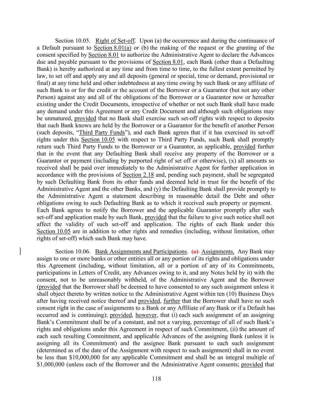 Section 10.05. Right of Set-off. Upon (a) the occurrence and during the continuance of a Default pursuant to Section 8.01(a) or (b) the making of the request or the granting of the consent specified by Section 8.01 to authorize the Administrative Agent to declare the Advances due and payable pursuant to the provisions of Section 8.01, each Bank (other than a Defaulting Bank) is hereby authorized at any time and from time to time, to the fullest extent permitted by law, to set off and apply any and all deposits (general or special, time or demand, provisional or final) at any time held and other indebtedness at any time owing by such Bank or any affiliate of such Bank to or for the credit or the account of the Borrower or a Guarantor (but not any other Person) against any and all of the obligations of the Borrower or a Guarantor now or hereafter existing under the Credit Documents, irrespective of whether or not such Bank shall have made any demand under this Agreement or any Credit Document and although such obligations may be unmatured, provided that no Bank shall exercise such set-off rights with respect to deposits that such Bank knows are held by the Borrower or a Guarantor for the benefit of another Person (such deposits, “Third Party Funds”), and each Bank agrees that if it has exercised its set-off rights under this Section 10.05 with respect to Third Party Funds, such Bank shall promptly return such Third Party Funds to the Borrower or a Guarantor, as applicable, provided further that in the event that any Defaulting Bank shall receive any property of the Borrower or a Guarantor or payment (including by purported right of set off or otherwise), (x) all amounts so received shall be paid over immediately to the Administrative Agent for further application in accordance with the provisions of Section 2.18 and, pending such payment, shall be segregated by such Defaulting Bank from its other funds and deemed held in trust for the benefit of the Administrative Agent and the other Banks, and (y) the Defaulting Bank shall provide promptly to the Administrative Agent a statement describing in reasonable detail the Debt and other obligations owing to such Defaulting Bank as to which it received such property or payment. Each Bank agrees to notify the Borrower and the applicable Guarantor promptly after such set-off and application made by such Bank, provided that the failure to give such notice shall not affect the validity of such set-off and application. The rights of each Bank under this Section 10.05 are in addition to other rights and remedies (including, without limitation, other rights of set-off) which such Bank may have. Section 10.06. Bank Assignments and Participations. (a) Assignments. Any Bank may assign to one or more banks or other entities all or any portion of its rights and obligations under this Agreement (including, without limitation, all or a portion of any of its Commitments, participations in Letters of Credit, any Advances owing to it, and any Notes held by it) with the consent, not to be unreasonably withheld, of the Administrative Agent and the Borrower (provided that the Borrower shall be deemed to have consented to any such assignment unless it shall object thereto by written notice to the Administrative Agent within ten (10) Business Days after having received notice thereof and provided, further that the Borrower shall have no such consent right in the case of assignments to a Bank or any Affiliate of any Bank or if a Default has occurred and is continuing); provided, however, that (i) each such assignment of an assigning Bank’s Commitment shall be of a constant, and not a varying, percentage of all of such Bank’s rights and obligations under this Agreement in respect of such Commitment, (ii) the amount of each such resulting Commitment, and applicable Advances of the assigning Bank (unless it is assigning all its Commitment) and the assignee Bank pursuant to each such assignment (determined as of the date of the Assignment with respect to such assignment) shall in no event be less than $10,000,000 for any applicable Commitment and shall be an integral multiple of $1,000,000 (unless each of the Borrower and the Administrative Agent consents; provided that 118