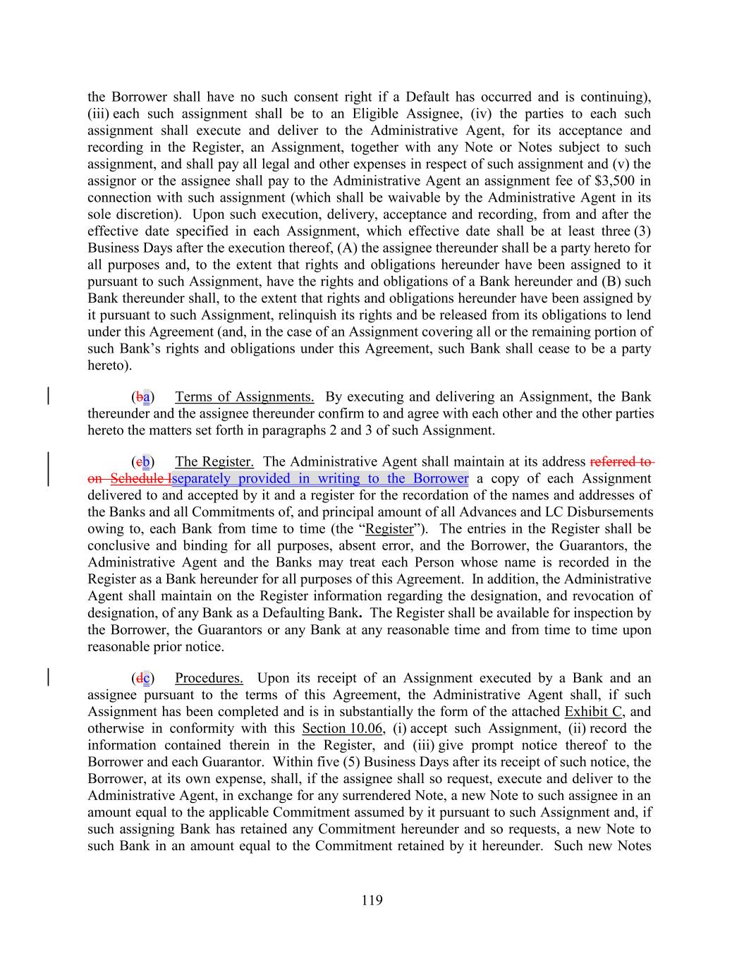 the Borrower shall have no such consent right if a Default has occurred and is continuing), (iii) each such assignment shall be to an Eligible Assignee, (iv) the parties to each such assignment shall execute and deliver to the Administrative Agent, for its acceptance and recording in the Register, an Assignment, together with any Note or Notes subject to such assignment, and shall pay all legal and other expenses in respect of such assignment and (v) the assignor or the assignee shall pay to the Administrative Agent an assignment fee of $3,500 in connection with such assignment (which shall be waivable by the Administrative Agent in its sole discretion). Upon such execution, delivery, acceptance and recording, from and after the effective date specified in each Assignment, which effective date shall be at least three (3) Business Days after the execution thereof, (A) the assignee thereunder shall be a party hereto for all purposes and, to the extent that rights and obligations hereunder have been assigned to it pursuant to such Assignment, have the rights and obligations of a Bank hereunder and (B) such Bank thereunder shall, to the extent that rights and obligations hereunder have been assigned by it pursuant to such Assignment, relinquish its rights and be released from its obligations to lend under this Agreement (and, in the case of an Assignment covering all or the remaining portion of such Bank’s rights and obligations under this Agreement, such Bank shall cease to be a party hereto). (ba) Terms of Assignments. By executing and delivering an Assignment, the Bank thereunder and the assignee thereunder confirm to and agree with each other and the other parties hereto the matters set forth in paragraphs 2 and 3 of such Assignment. (cb) The Register. The Administrative Agent shall maintain at its address referred to on Schedule Iseparately provided in writing to the Borrower a copy of each Assignment delivered to and accepted by it and a register for the recordation of the names and addresses of the Banks and all Commitments of, and principal amount of all Advances and LC Disbursements owing to, each Bank from time to time (the “Register”). The entries in the Register shall be conclusive and binding for all purposes, absent error, and the Borrower, the Guarantors, the Administrative Agent and the Banks may treat each Person whose name is recorded in the Register as a Bank hereunder for all purposes of this Agreement. In addition, the Administrative Agent shall maintain on the Register information regarding the designation, and revocation of designation, of any Bank as a Defaulting Bank. The Register shall be available for inspection by the Borrower, the Guarantors or any Bank at any reasonable time and from time to time upon reasonable prior notice. (dc) Procedures. Upon its receipt of an Assignment executed by a Bank and an assignee pursuant to the terms of this Agreement, the Administrative Agent shall, if such Assignment has been completed and is in substantially the form of the attached Exhibit C, and otherwise in conformity with this Section 10.06, (i) accept such Assignment, (ii) record the information contained therein in the Register, and (iii) give prompt notice thereof to the Borrower and each Guarantor. Within five (5) Business Days after its receipt of such notice, the Borrower, at its own expense, shall, if the assignee shall so request, execute and deliver to the Administrative Agent, in exchange for any surrendered Note, a new Note to such assignee in an amount equal to the applicable Commitment assumed by it pursuant to such Assignment and, if such assigning Bank has retained any Commitment hereunder and so requests, a new Note to such Bank in an amount equal to the Commitment retained by it hereunder. Such new Notes 119