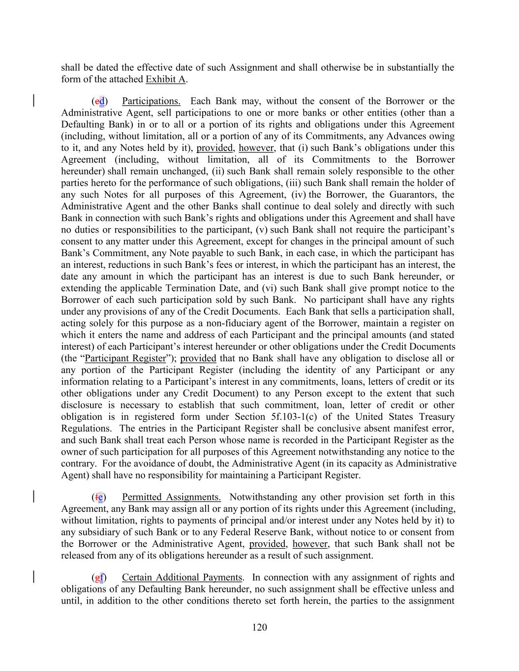 shall be dated the effective date of such Assignment and shall otherwise be in substantially the form of the attached Exhibit A. (ed) Participations. Each Bank may, without the consent of the Borrower or the Administrative Agent, sell participations to one or more banks or other entities (other than a Defaulting Bank) in or to all or a portion of its rights and obligations under this Agreement (including, without limitation, all or a portion of any of its Commitments, any Advances owing to it, and any Notes held by it), provided, however, that (i) such Bank’s obligations under this Agreement (including, without limitation, all of its Commitments to the Borrower hereunder) shall remain unchanged, (ii) such Bank shall remain solely responsible to the other parties hereto for the performance of such obligations, (iii) such Bank shall remain the holder of any such Notes for all purposes of this Agreement, (iv) the Borrower, the Guarantors, the Administrative Agent and the other Banks shall continue to deal solely and directly with such Bank in connection with such Bank’s rights and obligations under this Agreement and shall have no duties or responsibilities to the participant, (v) such Bank shall not require the participant’s consent to any matter under this Agreement, except for changes in the principal amount of such Bank’s Commitment, any Note payable to such Bank, in each case, in which the participant has an interest, reductions in such Bank’s fees or interest, in which the participant has an interest, the date any amount in which the participant has an interest is due to such Bank hereunder, or extending the applicable Termination Date, and (vi) such Bank shall give prompt notice to the Borrower of each such participation sold by such Bank. No participant shall have any rights under any provisions of any of the Credit Documents. Each Bank that sells a participation shall, acting solely for this purpose as a non-fiduciary agent of the Borrower, maintain a register on which it enters the name and address of each Participant and the principal amounts (and stated interest) of each Participant’s interest hereunder or other obligations under the Credit Documents (the “Participant Register”); provided that no Bank shall have any obligation to disclose all or any portion of the Participant Register (including the identity of any Participant or any information relating to a Participant’s interest in any commitments, loans, letters of credit or its other obligations under any Credit Document) to any Person except to the extent that such disclosure is necessary to establish that such commitment, loan, letter of credit or other obligation is in registered form under Section 5f.103-1(c) of the United States Treasury Regulations. The entries in the Participant Register shall be conclusive absent manifest error, and such Bank shall treat each Person whose name is recorded in the Participant Register as the owner of such participation for all purposes of this Agreement notwithstanding any notice to the contrary. For the avoidance of doubt, the Administrative Agent (in its capacity as Administrative Agent) shall have no responsibility for maintaining a Participant Register. (fe) Permitted Assignments. Notwithstanding any other provision set forth in this Agreement, any Bank may assign all or any portion of its rights under this Agreement (including, without limitation, rights to payments of principal and/or interest under any Notes held by it) to any subsidiary of such Bank or to any Federal Reserve Bank, without notice to or consent from the Borrower or the Administrative Agent, provided, however, that such Bank shall not be released from any of its obligations hereunder as a result of such assignment. (gf) Certain Additional Payments. In connection with any assignment of rights and obligations of any Defaulting Bank hereunder, no such assignment shall be effective unless and until, in addition to the other conditions thereto set forth herein, the parties to the assignment 120