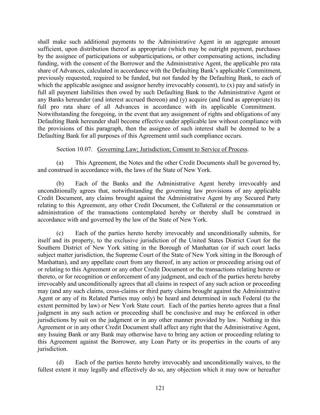 shall make such additional payments to the Administrative Agent in an aggregate amount sufficient, upon distribution thereof as appropriate (which may be outright payment, purchases by the assignee of participations or subparticipations, or other compensating actions, including funding, with the consent of the Borrower and the Administrative Agent, the applicable pro rata share of Advances, calculated in accordance with the Defaulting Bank’s applicable Commitment, previously requested, required to be funded, but not funded by the Defaulting Bank, to each of which the applicable assignee and assignor hereby irrevocably consent), to (x) pay and satisfy in full all payment liabilities then owed by such Defaulting Bank to the Administrative Agent or any Banks hereunder (and interest accrued thereon) and (y) acquire (and fund as appropriate) its full pro rata share of all Advances in accordance with its applicable Commitment. Notwithstanding the foregoing, in the event that any assignment of rights and obligations of any Defaulting Bank hereunder shall become effective under applicable law without compliance with the provisions of this paragraph, then the assignee of such interest shall be deemed to be a Defaulting Bank for all purposes of this Agreement until such compliance occurs. Section 10.07. Governing Law; Jurisdiction; Consent to Service of Process. (a) This Agreement, the Notes and the other Credit Documents shall be governed by, and construed in accordance with, the laws of the State of New York. (b) Each of the Banks and the Administrative Agent hereby irrevocably and unconditionally agrees that, notwithstanding the governing law provisions of any applicable Credit Document, any claims brought against the Administrative Agent by any Secured Party relating to this Agreement, any other Credit Document, the Collateral or the consummation or administration of the transactions contemplated hereby or thereby shall be construed in accordance with and governed by the law of the State of New York. (c) Each of the parties hereto hereby irrevocably and unconditionally submits, for itself and its property, to the exclusive jurisdiction of the United States District Court for the Southern District of New York sitting in the Borough of Manhattan (or if such court lacks subject matter jurisdiction, the Supreme Court of the State of New York sitting in the Borough of Manhattan), and any appellate court from any thereof, in any action or proceeding arising out of or relating to this Agreement or any other Credit Document or the transactions relating hereto or thereto, or for recognition or enforcement of any judgment, and each of the parties hereto hereby irrevocably and unconditionally agrees that all claims in respect of any such action or proceeding may (and any such claims, cross-claims or third party claims brought against the Administrative Agent or any of its Related Parties may only) be heard and determined in such Federal (to the extent permitted by law) or New York State court. Each of the parties hereto agrees that a final judgment in any such action or proceeding shall be conclusive and may be enforced in other jurisdictions by suit on the judgment or in any other manner provided by law. Nothing in this Agreement or in any other Credit Document shall affect any right that the Administrative Agent, any Issuing Bank or any Bank may otherwise have to bring any action or proceeding relating to this Agreement against the Borrower, any Loan Party or its properties in the courts of any jurisdiction. (d) Each of the parties hereto hereby irrevocably and unconditionally waives, to the fullest extent it may legally and effectively do so, any objection which it may now or hereafter 121