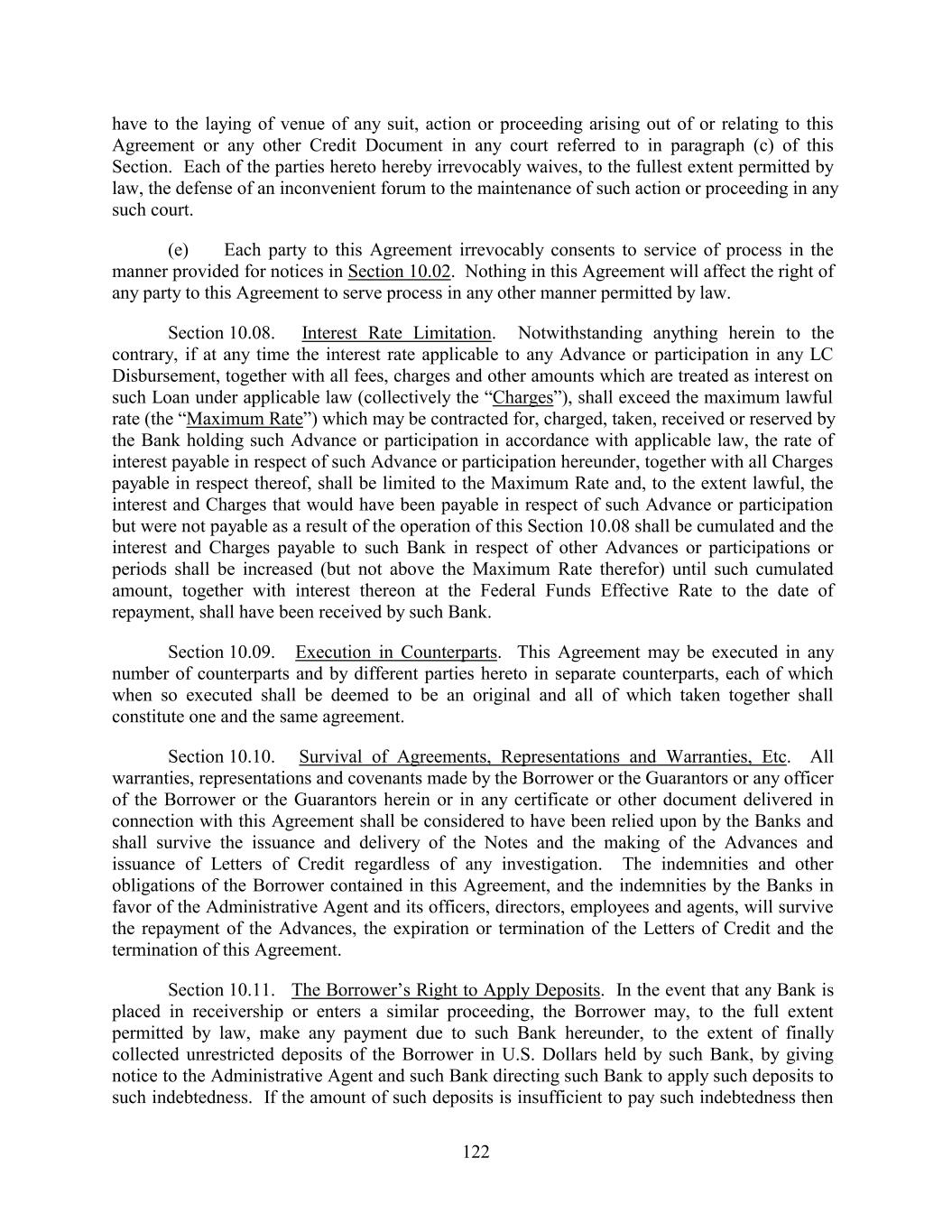 have to the laying of venue of any suit, action or proceeding arising out of or relating to this Agreement or any other Credit Document in any court referred to in paragraph (c) of this Section. Each of the parties hereto hereby irrevocably waives, to the fullest extent permitted by law, the defense of an inconvenient forum to the maintenance of such action or proceeding in any such court. (e) Each party to this Agreement irrevocably consents to service of process in the manner provided for notices in Section 10.02. Nothing in this Agreement will affect the right of any party to this Agreement to serve process in any other manner permitted by law. Section 10.08. Interest Rate Limitation. Notwithstanding anything herein to the contrary, if at any time the interest rate applicable to any Advance or participation in any LC Disbursement, together with all fees, charges and other amounts which are treated as interest on such Loan under applicable law (collectively the “Charges”), shall exceed the maximum lawful rate (the “Maximum Rate”) which may be contracted for, charged, taken, received or reserved by the Bank holding such Advance or participation in accordance with applicable law, the rate of interest payable in respect of such Advance or participation hereunder, together with all Charges payable in respect thereof, shall be limited to the Maximum Rate and, to the extent lawful, the interest and Charges that would have been payable in respect of such Advance or participation but were not payable as a result of the operation of this Section 10.08 shall be cumulated and the interest and Charges payable to such Bank in respect of other Advances or participations or periods shall be increased (but not above the Maximum Rate therefor) until such cumulated amount, together with interest thereon at the Federal Funds Effective Rate to the date of repayment, shall have been received by such Bank. Section 10.09. Execution in Counterparts. This Agreement may be executed in any number of counterparts and by different parties hereto in separate counterparts, each of which when so executed shall be deemed to be an original and all of which taken together shall constitute one and the same agreement. Section 10.10. Survival of Agreements, Representations and Warranties, Etc. All warranties, representations and covenants made by the Borrower or the Guarantors or any officer of the Borrower or the Guarantors herein or in any certificate or other document delivered in connection with this Agreement shall be considered to have been relied upon by the Banks and shall survive the issuance and delivery of the Notes and the making of the Advances and issuance of Letters of Credit regardless of any investigation. The indemnities and other obligations of the Borrower contained in this Agreement, and the indemnities by the Banks in favor of the Administrative Agent and its officers, directors, employees and agents, will survive the repayment of the Advances, the expiration or termination of the Letters of Credit and the termination of this Agreement. Section 10.11. The Borrower’s Right to Apply Deposits. In the event that any Bank is placed in receivership or enters a similar proceeding, the Borrower may, to the full extent permitted by law, make any payment due to such Bank hereunder, to the extent of finally collected unrestricted deposits of the Borrower in U.S. Dollars held by such Bank, by giving notice to the Administrative Agent and such Bank directing such Bank to apply such deposits to such indebtedness. If the amount of such deposits is insufficient to pay such indebtedness then 122