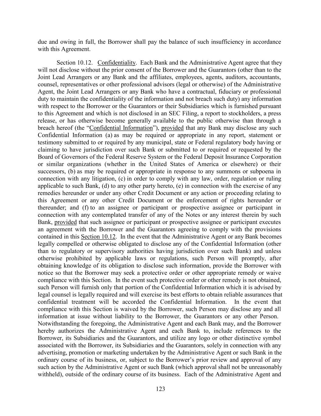 due and owing in full, the Borrower shall pay the balance of such insufficiency in accordance with this Agreement. Section 10.12. Confidentiality. Each Bank and the Administrative Agent agree that they will not disclose without the prior consent of the Borrower and the Guarantors (other than to the Joint Lead Arrangers or any Bank and the affiliates, employees, agents, auditors, accountants, counsel, representatives or other professional advisors (legal or otherwise) of the Administrative Agent, the Joint Lead Arrangers or any Bank who have a contractual, fiduciary or professional duty to maintain the confidentiality of the information and not breach such duty) any information with respect to the Borrower or the Guarantors or their Subsidiaries which is furnished pursuant to this Agreement and which is not disclosed in an SEC Filing, a report to stockholders, a press release, or has otherwise become generally available to the public otherwise than through a breach hereof (the “Confidential Information”), provided that any Bank may disclose any such Confidential Information (a) as may be required or appropriate in any report, statement or testimony submitted to or required by any municipal, state or Federal regulatory body having or claiming to have jurisdiction over such Bank or submitted to or required or requested by the Board of Governors of the Federal Reserve System or the Federal Deposit Insurance Corporation or similar organizations (whether in the United States of America or elsewhere) or their successors, (b) as may be required or appropriate in response to any summons or subpoena in connection with any litigation, (c) in order to comply with any law, order, regulation or ruling applicable to such Bank, (d) to any other party hereto, (e) in connection with the exercise of any remedies hereunder or under any other Credit Document or any action or proceeding relating to this Agreement or any other Credit Document or the enforcement of rights hereunder or thereunder; and (f) to an assignee or participant or prospective assignee or participant in connection with any contemplated transfer of any of the Notes or any interest therein by such Bank, provided that such assignee or participant or prospective assignee or participant executes an agreement with the Borrower and the Guarantors agreeing to comply with the provisions contained in this Section 10.12. In the event that the Administrative Agent or any Bank becomes legally compelled or otherwise obligated to disclose any of the Confidential Information (other than to regulatory or supervisory authorities having jurisdiction over such Bank) and unless otherwise prohibited by applicable laws or regulations, such Person will promptly, after obtaining knowledge of its obligation to disclose such information, provide the Borrower with notice so that the Borrower may seek a protective order or other appropriate remedy or waive compliance with this Section. In the event such protective order or other remedy is not obtained, such Person will furnish only that portion of the Confidential Information which it is advised by legal counsel is legally required and will exercise its best efforts to obtain reliable assurances that confidential treatment will be accorded the Confidential Information. In the event that compliance with this Section is waived by the Borrower, such Person may disclose any and all information at issue without liability to the Borrower, the Guarantors or any other Person. Notwithstanding the foregoing, the Administrative Agent and each Bank may, and the Borrower hereby authorizes the Administrative Agent and each Bank to, include references to the Borrower, its Subsidiaries and the Guarantors, and utilize any logo or other distinctive symbol associated with the Borrower, its Subsidiaries and the Guarantors, solely in connection with any advertising, promotion or marketing undertaken by the Administrative Agent or such Bank in the ordinary course of its business, or, subject to the Borrower’s prior review and approval of any such action by the Administrative Agent or such Bank (which approval shall not be unreasonably withheld), outside of the ordinary course of its business. Each of the Administrative Agent and 123