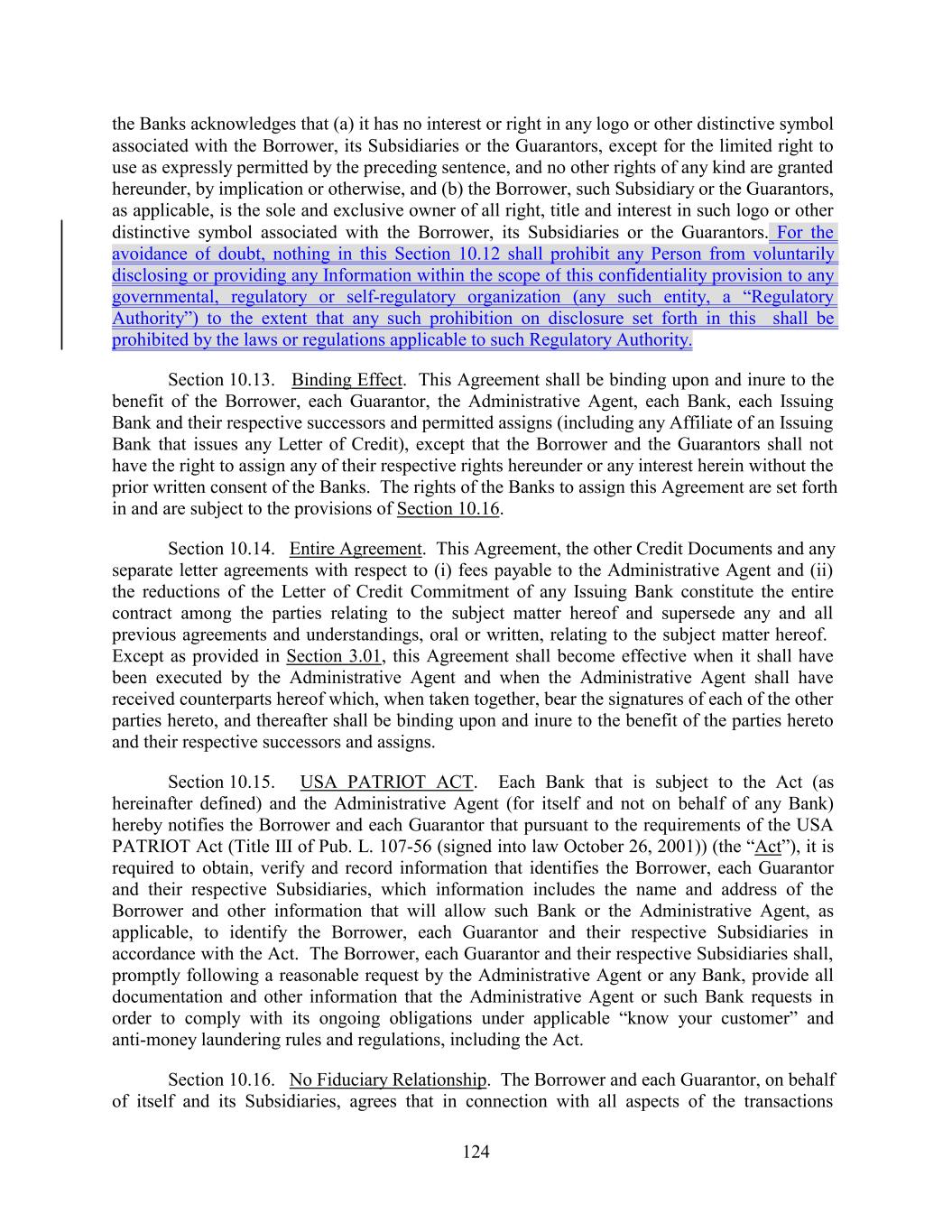 the Banks acknowledges that (a) it has no interest or right in any logo or other distinctive symbol associated with the Borrower, its Subsidiaries or the Guarantors, except for the limited right to use as expressly permitted by the preceding sentence, and no other rights of any kind are granted hereunder, by implication or otherwise, and (b) the Borrower, such Subsidiary or the Guarantors, as applicable, is the sole and exclusive owner of all right, title and interest in such logo or other distinctive symbol associated with the Borrower, its Subsidiaries or the Guarantors. For the avoidance of doubt, nothing in this Section 10.12 shall prohibit any Person from voluntarily disclosing or providing any Information within the scope of this confidentiality provision to any governmental, regulatory or self-regulatory organization (any such entity, a “Regulatory Authority”) to the extent that any such prohibition on disclosure set forth in this shall be prohibited by the laws or regulations applicable to such Regulatory Authority. Section 10.13. Binding Effect. This Agreement shall be binding upon and inure to the benefit of the Borrower, each Guarantor, the Administrative Agent, each Bank, each Issuing Bank and their respective successors and permitted assigns (including any Affiliate of an Issuing Bank that issues any Letter of Credit), except that the Borrower and the Guarantors shall not have the right to assign any of their respective rights hereunder or any interest herein without the prior written consent of the Banks. The rights of the Banks to assign this Agreement are set forth in and are subject to the provisions of Section 10.16. Section 10.14. Entire Agreement. This Agreement, the other Credit Documents and any separate letter agreements with respect to (i) fees payable to the Administrative Agent and (ii) the reductions of the Letter of Credit Commitment of any Issuing Bank constitute the entire contract among the parties relating to the subject matter hereof and supersede any and all previous agreements and understandings, oral or written, relating to the subject matter hereof. Except as provided in Section 3.01, this Agreement shall become effective when it shall have been executed by the Administrative Agent and when the Administrative Agent shall have received counterparts hereof which, when taken together, bear the signatures of each of the other parties hereto, and thereafter shall be binding upon and inure to the benefit of the parties hereto and their respective successors and assigns. Section 10.15. USA PATRIOT ACT. Each Bank that is subject to the Act (as hereinafter defined) and the Administrative Agent (for itself and not on behalf of any Bank) hereby notifies the Borrower and each Guarantor that pursuant to the requirements of the USA PATRIOT Act (Title III of Pub. L. 107-56 (signed into law October 26, 2001)) (the “Act”), it is required to obtain, verify and record information that identifies the Borrower, each Guarantor and their respective Subsidiaries, which information includes the name and address of the Borrower and other information that will allow such Bank or the Administrative Agent, as applicable, to identify the Borrower, each Guarantor and their respective Subsidiaries in accordance with the Act. The Borrower, each Guarantor and their respective Subsidiaries shall, promptly following a reasonable request by the Administrative Agent or any Bank, provide all documentation and other information that the Administrative Agent or such Bank requests in order to comply with its ongoing obligations under applicable “know your customer” and anti-money laundering rules and regulations, including the Act. Section 10.16. No Fiduciary Relationship. The Borrower and each Guarantor, on behalf of itself and its Subsidiaries, agrees that in connection with all aspects of the transactions 124
