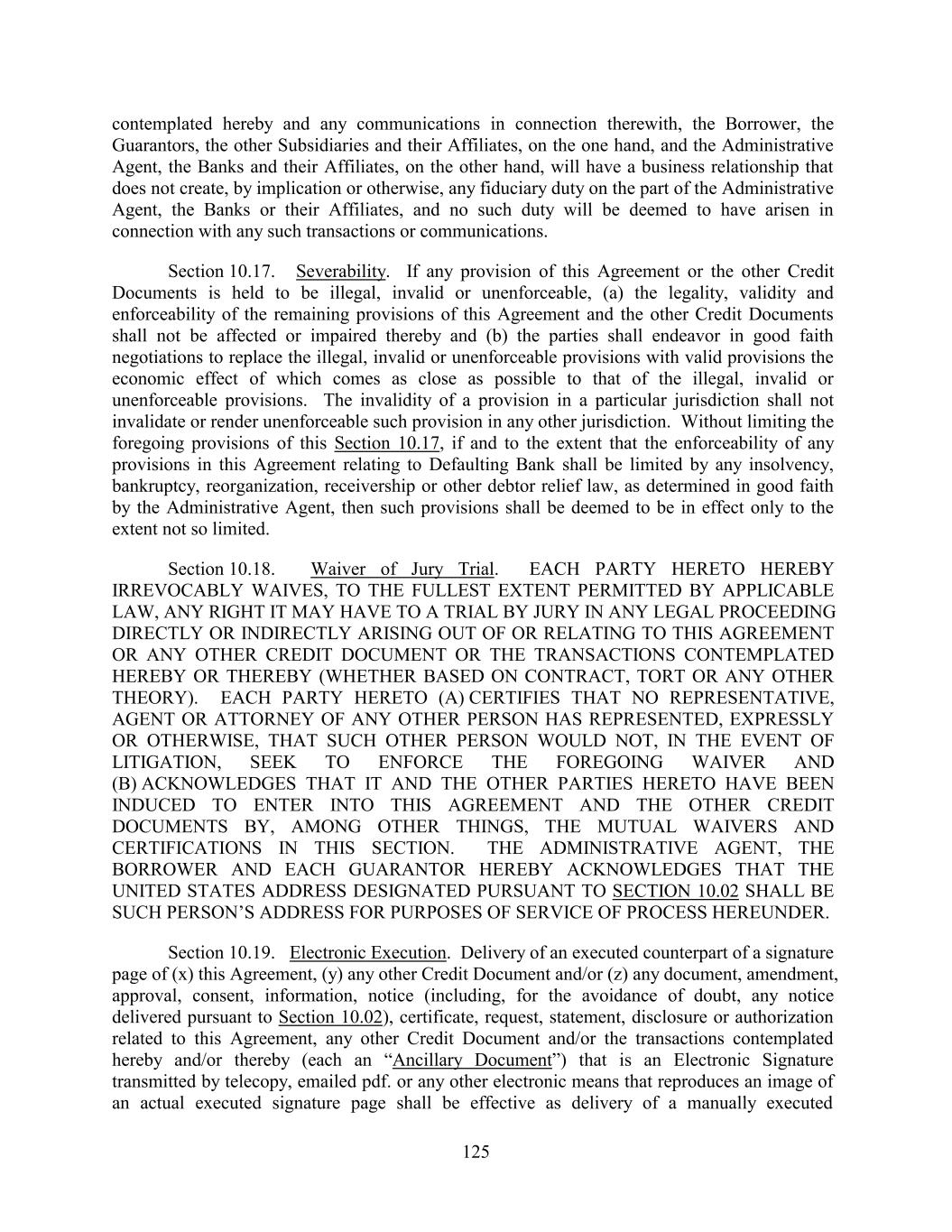 contemplated hereby and any communications in connection therewith, the Borrower, the Guarantors, the other Subsidiaries and their Affiliates, on the one hand, and the Administrative Agent, the Banks and their Affiliates, on the other hand, will have a business relationship that does not create, by implication or otherwise, any fiduciary duty on the part of the Administrative Agent, the Banks or their Affiliates, and no such duty will be deemed to have arisen in connection with any such transactions or communications. Section 10.17. Severability. If any provision of this Agreement or the other Credit Documents is held to be illegal, invalid or unenforceable, (a) the legality, validity and enforceability of the remaining provisions of this Agreement and the other Credit Documents shall not be affected or impaired thereby and (b) the parties shall endeavor in good faith negotiations to replace the illegal, invalid or unenforceable provisions with valid provisions the economic effect of which comes as close as possible to that of the illegal, invalid or unenforceable provisions. The invalidity of a provision in a particular jurisdiction shall not invalidate or render unenforceable such provision in any other jurisdiction. Without limiting the foregoing provisions of this Section 10.17, if and to the extent that the enforceability of any provisions in this Agreement relating to Defaulting Bank shall be limited by any insolvency, bankruptcy, reorganization, receivership or other debtor relief law, as determined in good faith by the Administrative Agent, then such provisions shall be deemed to be in effect only to the extent not so limited. Section 10.18. Waiver of Jury Trial. EACH PARTY HERETO HEREBY IRREVOCABLY WAIVES, TO THE FULLEST EXTENT PERMITTED BY APPLICABLE LAW, ANY RIGHT IT MAY HAVE TO A TRIAL BY JURY IN ANY LEGAL PROCEEDING DIRECTLY OR INDIRECTLY ARISING OUT OF OR RELATING TO THIS AGREEMENT OR ANY OTHER CREDIT DOCUMENT OR THE TRANSACTIONS CONTEMPLATED HEREBY OR THEREBY (WHETHER BASED ON CONTRACT, TORT OR ANY OTHER THEORY). EACH PARTY HERETO (A) CERTIFIES THAT NO REPRESENTATIVE, AGENT OR ATTORNEY OF ANY OTHER PERSON HAS REPRESENTED, EXPRESSLY OR OTHERWISE, THAT SUCH OTHER PERSON WOULD NOT, IN THE EVENT OF LITIGATION, SEEK TO ENFORCE THE FOREGOING WAIVER AND (B) ACKNOWLEDGES THAT IT AND THE OTHER PARTIES HERETO HAVE BEEN INDUCED TO ENTER INTO THIS AGREEMENT AND THE OTHER CREDIT DOCUMENTS BY, AMONG OTHER THINGS, THE MUTUAL WAIVERS AND CERTIFICATIONS IN THIS SECTION. THE ADMINISTRATIVE AGENT, THE BORROWER AND EACH GUARANTOR HEREBY ACKNOWLEDGES THAT THE UNITED STATES ADDRESS DESIGNATED PURSUANT TO SECTION 10.02 SHALL BE SUCH PERSON’S ADDRESS FOR PURPOSES OF SERVICE OF PROCESS HEREUNDER. Section 10.19. Electronic Execution. Delivery of an executed counterpart of a signature page of (x) this Agreement, (y) any other Credit Document and/or (z) any document, amendment, approval, consent, information, notice (including, for the avoidance of doubt, any notice delivered pursuant to Section 10.02), certificate, request, statement, disclosure or authorization related to this Agreement, any other Credit Document and/or the transactions contemplated hereby and/or thereby (each an “Ancillary Document”) that is an Electronic Signature transmitted by telecopy, emailed pdf. or any other electronic means that reproduces an image of an actual executed signature page shall be effective as delivery of a manually executed 125