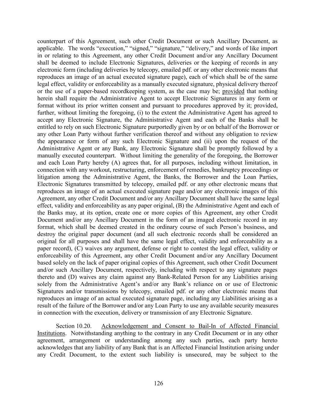 counterpart of this Agreement, such other Credit Document or such Ancillary Document, as applicable. The words “execution,” “signed,” “signature,” “delivery,” and words of like import in or relating to this Agreement, any other Credit Document and/or any Ancillary Document shall be deemed to include Electronic Signatures, deliveries or the keeping of records in any electronic form (including deliveries by telecopy, emailed pdf. or any other electronic means that reproduces an image of an actual executed signature page), each of which shall be of the same legal effect, validity or enforceability as a manually executed signature, physical delivery thereof or the use of a paper-based recordkeeping system, as the case may be; provided that nothing herein shall require the Administrative Agent to accept Electronic Signatures in any form or format without its prior written consent and pursuant to procedures approved by it; provided, further, without limiting the foregoing, (i) to the extent the Administrative Agent has agreed to accept any Electronic Signature, the Administrative Agent and each of the Banks shall be entitled to rely on such Electronic Signature purportedly given by or on behalf of the Borrower or any other Loan Party without further verification thereof and without any obligation to review the appearance or form of any such Electronic Signature and (ii) upon the request of the Administrative Agent or any Bank, any Electronic Signature shall be promptly followed by a manually executed counterpart. Without limiting the generality of the foregoing, the Borrower and each Loan Party hereby (A) agrees that, for all purposes, including without limitation, in connection with any workout, restructuring, enforcement of remedies, bankruptcy proceedings or litigation among the Administrative Agent, the Banks, the Borrower and the Loan Parties, Electronic Signatures transmitted by telecopy, emailed pdf. or any other electronic means that reproduces an image of an actual executed signature page and/or any electronic images of this Agreement, any other Credit Document and/or any Ancillary Document shall have the same legal effect, validity and enforceability as any paper original, (B) the Administrative Agent and each of the Banks may, at its option, create one or more copies of this Agreement, any other Credit Document and/or any Ancillary Document in the form of an imaged electronic record in any format, which shall be deemed created in the ordinary course of such Person’s business, and destroy the original paper document (and all such electronic records shall be considered an original for all purposes and shall have the same legal effect, validity and enforceability as a paper record), (C) waives any argument, defense or right to contest the legal effect, validity or enforceability of this Agreement, any other Credit Document and/or any Ancillary Document based solely on the lack of paper original copies of this Agreement, such other Credit Document and/or such Ancillary Document, respectively, including with respect to any signature pages thereto and (D) waives any claim against any Bank-Related Person for any Liabilities arising solely from the Administrative Agent’s and/or any Bank’s reliance on or use of Electronic Signatures and/or transmissions by telecopy, emailed pdf. or any other electronic means that reproduces an image of an actual executed signature page, including any Liabilities arising as a result of the failure of the Borrower and/or any Loan Party to use any available security measures in connection with the execution, delivery or transmission of any Electronic Signature. Section 10.20. Acknowledgement and Consent to Bail-In of Affected Financial Institutions. Notwithstanding anything to the contrary in any Credit Document or in any other agreement, arrangement or understanding among any such parties, each party hereto acknowledges that any liability of any Bank that is an Affected Financial Institution arising under any Credit Document, to the extent such liability is unsecured, may be subject to the 126