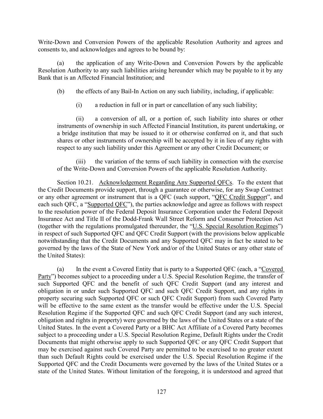 Write-Down and Conversion Powers of the applicable Resolution Authority and agrees and consents to, and acknowledges and agrees to be bound by: (a) the application of any Write-Down and Conversion Powers by the applicable Resolution Authority to any such liabilities arising hereunder which may be payable to it by any Bank that is an Affected Financial Institution; and (b) the effects of any Bail-In Action on any such liability, including, if applicable: (i) a reduction in full or in part or cancellation of any such liability; (ii) a conversion of all, or a portion of, such liability into shares or other instruments of ownership in such Affected Financial Institution, its parent undertaking, or a bridge institution that may be issued to it or otherwise conferred on it, and that such shares or other instruments of ownership will be accepted by it in lieu of any rights with respect to any such liability under this Agreement or any other Credit Document; or (iii) the variation of the terms of such liability in connection with the exercise of the Write-Down and Conversion Powers of the applicable Resolution Authority. Section 10.21. Acknowledgement Regarding Any Supported QFCs. To the extent that the Credit Documents provide support, through a guarantee or otherwise, for any Swap Contract or any other agreement or instrument that is a QFC (such support, “QFC Credit Support”, and each such QFC, a “Supported QFC”), the parties acknowledge and agree as follows with respect to the resolution power of the Federal Deposit Insurance Corporation under the Federal Deposit Insurance Act and Title II of the Dodd-Frank Wall Street Reform and Consumer Protection Act (together with the regulations promulgated thereunder, the “U.S. Special Resolution Regimes”) in respect of such Supported QFC and QFC Credit Support (with the provisions below applicable notwithstanding that the Credit Documents and any Supported QFC may in fact be stated to be governed by the laws of the State of New York and/or of the United States or any other state of the United States): (a) In the event a Covered Entity that is party to a Supported QFC (each, a “Covered Party”) becomes subject to a proceeding under a U.S. Special Resolution Regime, the transfer of such Supported QFC and the benefit of such QFC Credit Support (and any interest and obligation in or under such Supported QFC and such QFC Credit Support, and any rights in property securing such Supported QFC or such QFC Credit Support) from such Covered Party will be effective to the same extent as the transfer would be effective under the U.S. Special Resolution Regime if the Supported QFC and such QFC Credit Support (and any such interest, obligation and rights in property) were governed by the laws of the United States or a state of the United States. In the event a Covered Party or a BHC Act Affiliate of a Covered Party becomes subject to a proceeding under a U.S. Special Resolution Regime, Default Rights under the Credit Documents that might otherwise apply to such Supported QFC or any QFC Credit Support that may be exercised against such Covered Party are permitted to be exercised to no greater extent than such Default Rights could be exercised under the U.S. Special Resolution Regime if the Supported QFC and the Credit Documents were governed by the laws of the United States or a state of the United States. Without limitation of the foregoing, it is understood and agreed that 127