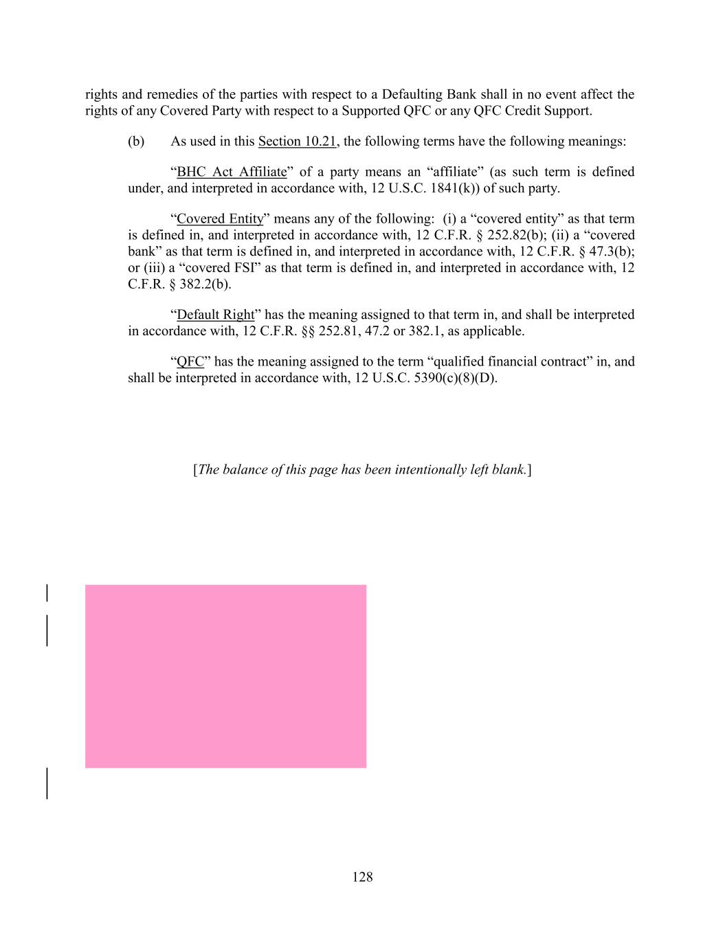128 rights and remedies of the parties with respect to a Defaulting Bank shall in no event affect the rights of any Covered Party with respect to a Supported QFC or any QFC Credit Support. (b) As used in this Section 10.21, the following terms have the following meanings: “BHC Act Affiliate” of a party means an “affiliate” (as such term is defined under, and interpreted in accordance with, 12 U.S.C. 1841(k)) of such party. “Covered Entity” means any of the following: (i) a “covered entity” as that term is defined in, and interpreted in accordance with, 12 C.F.R. § 252.82(b); (ii) a “covered bank” as that term is defined in, and interpreted in accordance with, 12 C.F.R. § 47.3(b); or (iii) a “covered FSI” as that term is defined in, and interpreted in accordance with, 12 C.F.R. § 382.2(b). “Default Right” has the meaning assigned to that term in, and shall be interpreted in accordance with, 12 C.F.R. §§ 252.81, 47.2 or 382.1, as applicable. “QFC” has the meaning assigned to the term “qualified financial contract” in, and shall be interpreted in accordance with, 12 U.S.C. 5390(c)(8)(D). [The balance of this page has been intentionally left blank.]