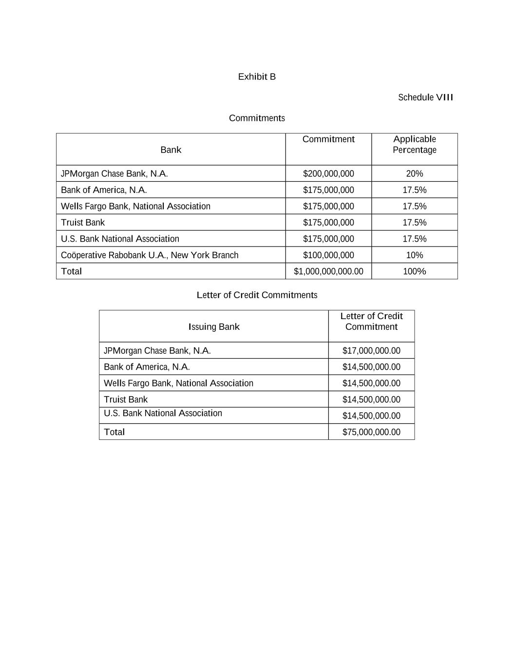 Exhibit B Schedule VIII Commitments Bank Commitment Applicable Percentage JPMorgan Chase Bank, N.A. $200,000,000 20% Bank of America, N.A. $175,000,000 17.5% Wells Fargo Bank, National Association $175,000,000 17.5% Truist Bank $175,000,000 17.5% U.S. Bank National Association $175,000,000 17.5% Coöperative Rabobank U.A., New York Branch $100,000,000 10% Total $1,000,000,000.00 100% Letter of Credit Commitments Issuing Bank Letter of Credit Commitment JPMorgan Chase Bank, N.A. $17,000,000.00 Bank of America, N.A. $14,500,000.00 Wells Fargo Bank, National Association $14,500,000.00 Truist Bank $14,500,000.00 U.S. Bank National Association $14,500,000.00 Total $75,000,000.00