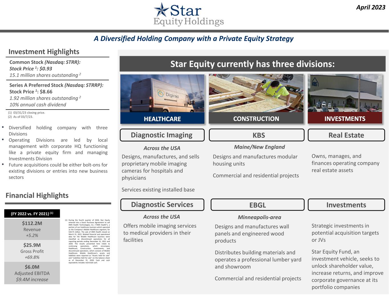 Star Equity currently has three divisions: April 2023 A Diversified Holding Company with a Private Equity Strategy • Diversified holding company with three Divisions • Operating Divisions are led by local management with corporate HQ functioning like a private equity firm and managing Investments Division • Future acquisitions could be either bolt-ons for existing divisions or entries into new business sectors Common Stock (Nasdaq: STRR): Stock Price 1: $0.93 15.1 million shares outstanding 2 Series A Preferred Stock (Nasdaq: STRRP): Stock Price 1: $8.66 1.92 million shares outstanding 2 10% annual cash dividend Across the USA Maine/New England Minneapolis-area KBS EBGL Designs, manufactures, and sells proprietary mobile imaging cameras for hospitals and physicians Services existing installed base Offers mobile imaging services to medical providers in their facilities Designs and manufactures modular housing units Commercial and residential projects Designs and manufactures wall panels and engineered wood products Distributes building materials and operates a professional lumber yard and showroom Commercial and residential projects Real Estate Investments Owns, manages, and finances operating company real estate assets Strategic investments in potential acquisition targets or JVs Star Equity Fund, an investment vehicle, seeks to unlock shareholder value, increase returns, and improve corporate governance at its portfolio companies Diagnostic Imaging Diagnostic Services Across the USA Financial Highlights (1) During the fourth quarter of 2020, Star Equity entered into a Stock Purchase Agreement to sell DMS Health Technologies, Inc. (“DMS Health”), a portion of our healthcare business which operated as the Company’s Mobile Healthcare segment, for $18.75 million. The sale of DMS Health closed on March 31, 2021. Related financial and operational data for the Mobile Healthcare business were classified as discontinued operations for all reporting periods ending December 31, 2021 and 2020. The results presented here relate to continuing operations, which encompass Healthcare, Construction, Investments, and discontinued operations, which consists of Mobile Healthcare. Mobile Healthcare’s assets and liabilities were reported as “Assets held for sale” and “Liabilities held for sale” on the balance sheet as of December 31, 2020. Cash and cash equivalents includes restricted cash. Investment Highlights (1) 03/31/23 closing price. (2) As of 03/7/23. (FY 2022 vs. FY 2021) (1) $112.2M Revenue +5.2% $25.9M Gross Profit +69.8% $6.0M Adjusted EBITDA $9.4M increase