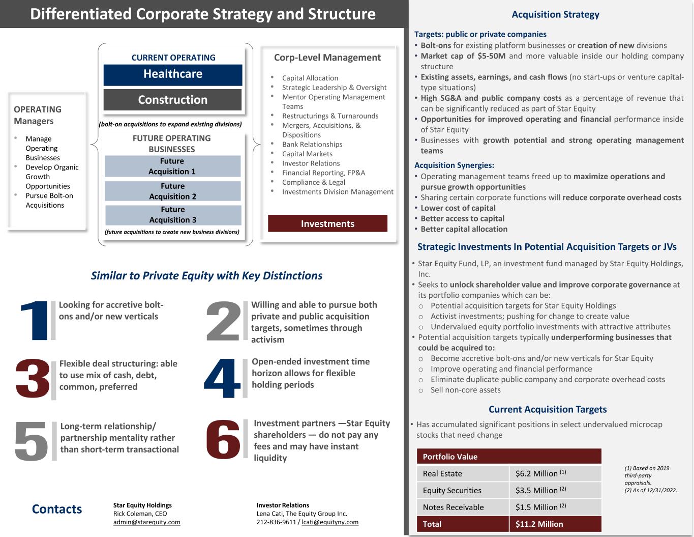 Star Equity Holdings Rick Coleman, CEO admin@starequity.com Contacts Construction Future Acquisition 1 Healthcare CURRENT OPERATING BUSINESSES Investments (future acquisitions to create new business divisions) • Capital Allocation • Strategic Leadership & Oversight • Mentor Operating Management Teams • Restructurings & Turnarounds • Mergers, Acquisitions, & Dispositions • Bank Relationships • Capital Markets • Investor Relations • Financial Reporting, FP&A • Compliance & Legal • Investments Division Management OPERATING Managers • Manage Operating Businesses • Develop Organic Growth Opportunities • Pursue Bolt-on Acquisitions (bolt-on acquisitions to expand existing divisions) FUTURE OPERATING BUSINESSES Corp-Level Management Targets: public or private companies • Bolt-ons for existing platform businesses or creation of new divisions • Market cap of $5-50M and more valuable inside our holding company structure • Existing assets, earnings, and cash flows (no start-ups or venture capital- type situations) • High SG&A and public company costs as a percentage of revenue that can be significantly reduced as part of Star Equity • Opportunities for improved operating and financial performance inside of Star Equity • Businesses with growth potential and strong operating management teams Acquisition Synergies: • Operating management teams freed up to maximize operations and pursue growth opportunities • Sharing certain corporate functions will reduce corporate overhead costs • Lower cost of capital • Better access to capital • Better capital allocation Acquisition Strategy Strategic Investments In Potential Acquisition Targets or JVs Future Acquisition 2 • Star Equity Fund, LP, an investment fund managed by Star Equity Holdings, Inc. • Seeks to unlock shareholder value and improve corporate governance at its portfolio companies which can be: o Potential acquisition targets for Star Equity Holdings o Activist investments; pushing for change to create value o Undervalued equity portfolio investments with attractive attributes • Potential acquisition targets typically underperforming businesses that could be acquired to: o Become accretive bolt-ons and/or new verticals for Star Equity o Improve operating and financial performance o Eliminate duplicate public company and corporate overhead costs o Sell non-core assets Future Acquisition 3 Similar to Private Equity with Key Distinctions Investment partners —Star Equity shareholders — do not pay any fees and may have instant liquidity Long-term relationship/ partnership mentality rather than short-term transactional Willing and able to pursue both private and public acquisition targets, sometimes through activism Open-ended investment time horizon allows for flexible holding periods Looking for accretive bolt- ons and/or new verticals Flexible deal structuring: able to use mix of cash, debt, common, preferred Differentiated Corporate Strategy and Structure Investor Relations Lena Cati, The Equity Group Inc. 212-836-9611 / lcati@equityny.com Current Acquisition Targets • Has accumulated significant positions in select undervalued microcap stocks that need change Portfolio Value Real Estate $6.2 Million (1) Equity Securities $3.5 Million (2) Notes Receivable $1.5 Million (2) Total $11.2 Million (1) Based on 2019 third-party appraisals. (2) As of 12/31/2022.