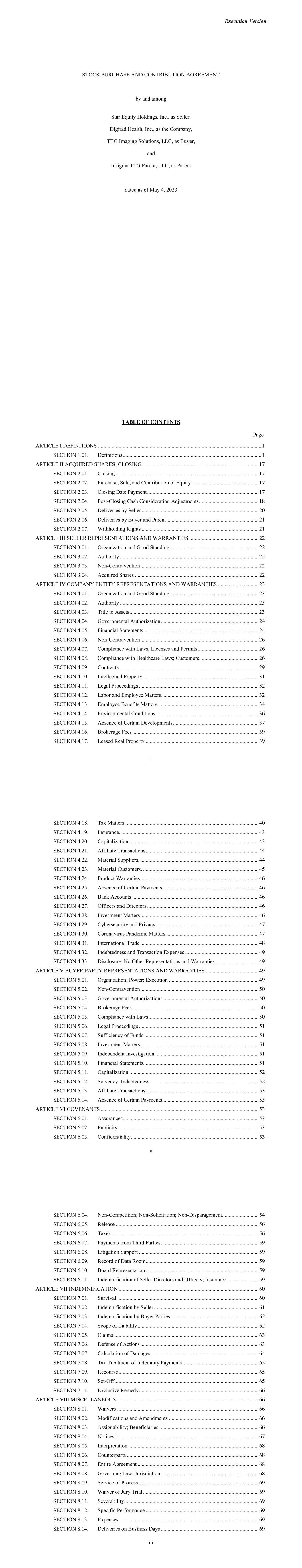 Execution Version STOCK PURCHASE AND CONTRIBUTION AGREEMENT by and among Star Equity Holdings, Inc., as Seller, Digirad Health, Inc., as the Company, TTG Imaging Solutions, LLC, as Buyer, and Insignia TTG Parent, LLC, as Parent dated as of May 4, 2023 TABLE OF CONTENTS Page i ARTICLE I DEFINITIONS ........................................................................................................................ 1  SECTION 1.01. Definitions ...................................................................................................... 1  ARTICLE II ACQUIRED SHARES; CLOSING ...................................................................................... 17  SECTION 2.01. Closing ......................................................................................................... 17  SECTION 2.02. Purchase, Sale, and Contribution of Equity ................................................. 17  SECTION 2.03. Closing Date Payment. ................................................................................. 17  SECTION 2.04. Post-Closing Cash Consideration Adjustments. ........................................... 18  SECTION 2.05. Deliveries by Seller ...................................................................................... 20  SECTION 2.06. Deliveries by Buyer and Parent .................................................................... 21  SECTION 2.07. Withholding Rights ...................................................................................... 21  ARTICLE III SELLER REPRESENTATIONS AND WARRANTIES ................................................... 22  SECTION 3.01. Organization and Good Standing ................................................................. 22  SECTION 3.02. Authority ...................................................................................................... 22  SECTION 3.03. Non-Contravention ....................................................................................... 22  SECTION 3.04. Acquired Shares ........................................................................................... 22  ARTICLE IV COMPANY ENTITY REPRESENTATIONS AND WARRANTIES .............................. 23  SECTION 4.01. Organization and Good Standing ................................................................. 23  SECTION 4.02. Authority ...................................................................................................... 23  SECTION 4.03. Title to Assets ............................................................................................... 23  SECTION 4.04. Governmental Authorization ........................................................................ 24  SECTION 4.05. Financial Statements. ................................................................................... 24  SECTION 4.06. Non-Contravention ....................................................................................... 26  SECTION 4.07. Compliance with Laws; Licenses and Permits ............................................. 26  SECTION 4.08. Compliance with Healthcare Laws; Customers. .......................................... 26  SECTION 4.09. Contracts....................................................................................................... 29  SECTION 4.10. Intellectual Property. .................................................................................... 31  SECTION 4.11. Legal Proceedings ........................................................................................ 32  SECTION 4.12. Labor and Employee Matters. ...................................................................... 32  SECTION 4.13. Employee Benefits Matters. ......................................................................... 34  SECTION 4.14. Environmental Conditions ............................................................................ 36  SECTION 4.15. Absence of Certain Developments ............................................................... 37  SECTION 4.16. Brokerage Fees ............................................................................................. 39  SECTION 4.17. Leased Real Property ................................................................................... 39  ii SECTION 4.18. Tax Matters. ................................................................................................. 40  SECTION 4.19. Insurance. ..................................................................................................... 43  SECTION 4.20. Capitalization ............................................................................................... 43  SECTION 4.21. Affiliate Transactions ................................................................................... 44  SECTION 4.22. Material Suppliers. ....................................................................................... 44  SECTION 4.23. Material Customers. ..................................................................................... 45  SECTION 4.24. Product Warranties ....................................................................................... 46  SECTION 4.25. Absence of Certain Payments....................................................................... 46  SECTION 4.26. Bank Accounts ............................................................................................. 46  SECTION 4.27. Officers and Directors .................................................................................. 46  SECTION 4.28. Investment Matters ....................................................................................... 46  SECTION 4.29. Cybersecurity and Privacy ........................................................................... 47  SECTION 4.30. Coronavirus Pandemic Matters. ................................................................... 47  SECTION 4.31. International Trade ............................