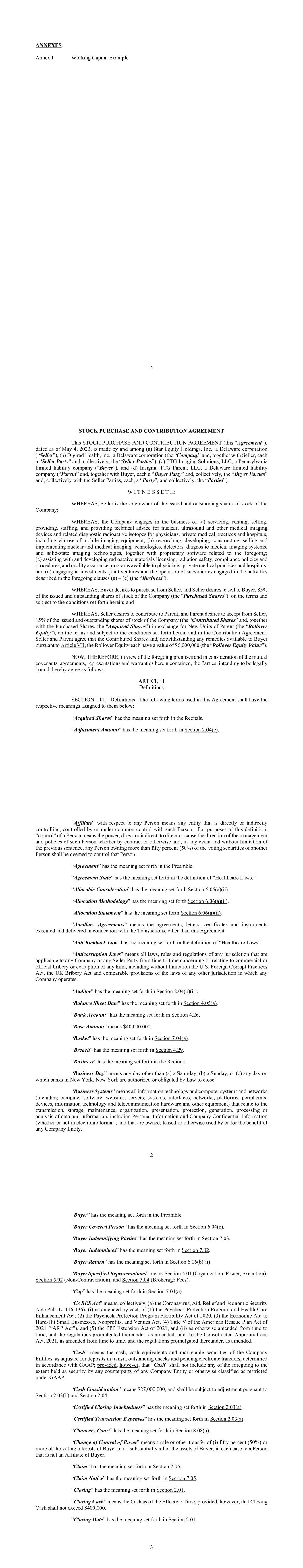 iv ANNEXES: Annex I Working Capital Example STOCK PURCHASE AND CONTRIBUTION AGREEMENT This STOCK PURCHASE AND CONTRIBUTION AGREEMENT (this “Agreement”), dated as of May 4, 2023, is made by and among (a) Star Equity Holdings, Inc., a Delaware corporation (“Seller”), (b) Digirad Health, Inc., a Delaware corporation (the “Company” and, together with Seller, each a “Seller Party” and, collectively, the “Seller Parties”), (c) TTG Imaging Solutions, LLC, a Pennsylvania limited liability company (“Buyer”), and (d) Insignia TTG Parent, LLC, a Delaware limited liability company (“Parent” and, together with Buyer, each a “Buyer Party” and, collectively, the “Buyer Parties” and, collectively with the Seller Parties, each, a “Party”, and collectively, the “Parties”). W I T N E S S E T H: WHEREAS, Seller is the sole owner of the issued and outstanding shares of stock of the Company; WHEREAS, the Company engages in the business of (a) servicing, renting, selling, providing, staffing, and providing technical advice for nuclear, ultrasound and other medical imaging devices and related diagnostic radioactive isotopes for physicians, private medical practices and hospitals, including via use of mobile imaging equipment; (b) researching, developing, constructing, selling and implementing nuclear and medical imaging technologies, detectors, diagnostic medical imaging systems, and solid-state imaging technologies, together with proprietary software related to the foregoing; (c) assisting with and developing radioactive materials licensing, radiation safety, compliance policies and procedures, and quality assurance programs available to physicians, private medical practices and hospitals; and (d) engaging in investments, joint ventures and the operation of subsidiaries engaged in the activities described in the foregoing clauses (a) – (c) (the “Business”); WHEREAS, Buyer desires to purchase from Seller, and Seller desires to sell to Buyer, 85% of the issued and outstanding shares of stock of the Company (the “Purchased Shares”), on the terms and subject to the conditions set forth herein; and WHEREAS, Seller desires to contribute to Parent, and Parent desires to accept from Seller, 15% of the issued and outstanding shares of stock of the Company (the “Contributed Shares” and, together with the Purchased Shares, the “Acquired Shares”) in exchange for New Units of Parent (the “Rollover Equity”), on the terms and subject to the conditions set forth herein and in the Contribution Agreement. Seller and Parent agree that the Contributed Shares and, notwithstanding any remedies available to Buyer pursuant to Article VII, the Rollover Equity each have a value of $6,000,000 (the “Rollover Equity Value”). NOW, THEREFORE, in view of the foregoing premises and in consideration of the mutual covenants, agreements, representations and warranties herein contained, the Parties, intending to be legally bound, hereby agree as follows: ARTICLE I Definitions SECTION 1.01. Definitions. The following terms used in this Agreement shall have the respective meanings assigned to them below: “Acquired Shares” has the meaning set forth in the Recitals. “Adjustment Amount” has the meaning set forth in Section 2.04(c). 2 “Affiliate” with respect to any Person means any entity that is directly or indirectly controlling, controlled by or under common control with such Person. For purposes of this definition, “control” of a Person means the power, direct or indirect, to direct or cause the direction of the management and policies of such Person whether by contract or otherwise and, in any event and without limitation of the previous sentence, any Person owning more than fifty percent (50%) of the voting securities of another Person shall be deemed to control that Person. “Agreement” has the meaning set forth in the Preamble. “Agreement State” has the meaning set forth in the definition of “Healthcare Laws.” “Allocable Consideration” has the meaning set forth Section 6.06(a)(ii). “Allocation Methodology” has the meaning set forth Section 6.06(a)(ii). “Allocation Statement” has the meaning set forth Section 6.06(a)(ii). “Ancillary Agreements” means the agreements, letters, certificates and instruments executed and delivered in connection with the Transactions, other than this Agreement. “Anti-Kickback Law” has the meaning set forth in the definition of “Healthcare Laws”. “Anticorruption Laws” means all laws, rules and regulations of any jurisdiction that are applicable to any Company or any Seller Party from time to time concerning or relating to commercial or official bribery or corruption of any kind, including without limitation the U.S. Foreign Corrupt Practices Act, the UK Bribery Act and comparable provisions of the laws of any other jurisdiction in which any Company operates. “Auditor” has the meaning set forth in Section 2.04(b)(ii). “Balance Sheet Date” has the meaning set forth in Section 4.05(a). “Bank Account” has the meaning set forth in Section 4.26. “Base Amount” means $40,000,000. “Basket” has the meaning set forth in Section 7.04(a). “Breach” has the meaning set forth in Section 4.29. “Business” has the meaning set forth in the Recitals. “Business Day” means any day other than (a) a Saturday, (b) a Sunday, or (c) any day on which banks in New York, New York are authorized or obligated by Law to close. “Business Systems” means all information technology and computer systems and networks (including computer software, websites, servers, systems, interfaces, networks, platforms, peripherals, devices, information technology and telecommunication hardware and other equipment) that relate to the transmission, storage, maintenance, organization, presentation, protection, generation, processing or analysis of data and information, including Personal Information and Company Con
