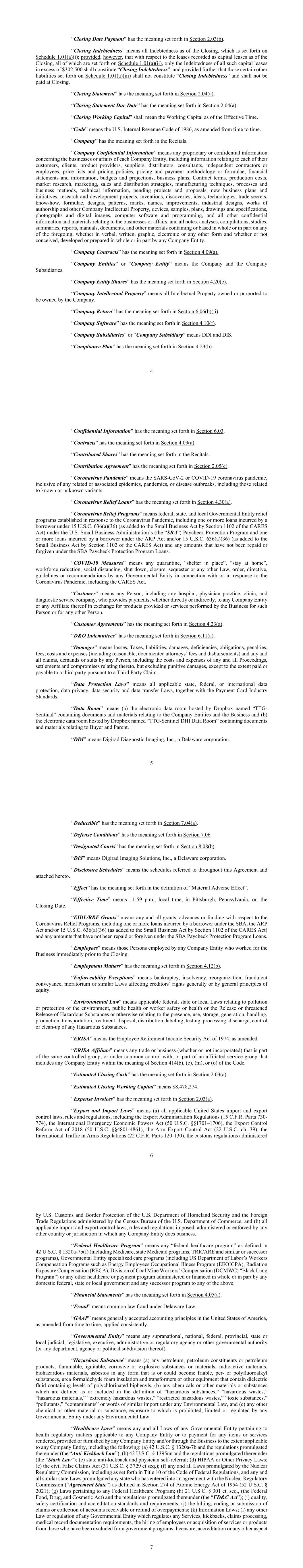 4 “Closing Date Payment” has the meaning set forth in Section 2.03(b). “Closing Indebtedness” means all Indebtedness as of the Closing, which is set forth on Schedule 1.01(a)(i); provided, however, that with respect to the leases recorded as capital leases as of the Closing, all of which are set forth on Schedule 1.01(a)(ii), only the Indebtedness of all such capital leases in excess of $302,500 shall constitute “Closing Indebtedness”; and provided further that those certain other liabilities set forth on Schedule 1.01(a)(iii) shall not constitute “Closing Indebtedness” and shall not be paid at Closing. “Closing Statement” has the meaning set forth in Section 2.04(a). “Closing Statement Due Date” has the meaning set forth in Section 2.04(a). “Closing Working Capital” shall mean the Working Capital as of the Effective Time. “Code” means the U.S. Internal Revenue Code of 1986, as amended from time to time. “Company” has the meaning set forth in the Recitals. “Company Confidential Information” means any proprietary or confidential information concerning the businesses or affairs of each Company Entity, including information relating to each of their customers, clients, product providers, suppliers, distributors, consultants, independent contractors or employees, price lists and pricing policies, pricing and payment methodology or formulae, financial statements and information, budgets and projections, business plans, Contract terms, production costs, market research, marketing, sales and distribution strategies, manufacturing techniques, processes and business methods, technical information, pending projects and proposals, new business plans and initiatives, research and development projects, inventions, discoveries, ideas, technologies, trade secrets, know-how, formulae, designs, patterns, marks, names, improvements, industrial designs, works of authorship and other Company Intellectual Property, devices, samples, plans, drawings and specifications, photographs and digital images, computer software and programming, and all other confidential information and materials relating to the businesses or affairs, and all notes, analyses, compilations, studies, summaries, reports, manuals, documents, and other materials containing or based in whole or in part on any of the foregoing, whether in verbal, written, graphic, electronic or any other form and whether or not conceived, developed or prepared in whole or in part by any Company Entity. “Company Contracts” has the meaning set forth in Section 4.09(a). “Company Entities” or “Company Entity” means the Company and the Company Subsidiaries. “Company Entity Shares” has the meaning set forth in Section 4.20(c). “Company Intellectual Property” means all Intellectual Property owned or purported to be owned by the Company. “Company Return” has the meaning set forth in Section 6.06(b)(ii). “Company Software” has the meaning set forth in Section 4.10(f). “Company Subsidiaries” or “Company Subsidiary” means DDI and DIS. “Compliance Plan” has the meaning set forth in Section 4.23(b). 5 “Confidential Information” has the meaning set forth in Section 6.03. “Contracts” has the meaning set forth in Section 4.09(a). “Contributed Shares” has the meaning set forth in the Recitals. “Contribution Agreement” has the meaning set forth in Section 2.05(c). “Coronavirus Pandemic” means the SARS-CoV-2 or COVID-19 coronavirus pandemic, inclusive of any related or associated epidemics, pandemics, or disease outbreaks, including those related to known or unknown variants. “Coronavirus Relief Loans” has the meaning set forth in Section 4.30(a). “Coronavirus Relief Programs” means federal, state, and local Governmental Entity relief programs established in response to the Coronavirus Pandemic, including one or more loans incurred by a borrower under 15 U.S.C. 636(a)(36) (as added to the Small Business Act by Section 1102 of the CARES Act) under the U.S. Small Business Administration’s (the “SBA”) Paycheck Protection Program and one or more loans incurred by a borrower under the ARP Act and/or 15 U.S.C. 636(a)(36) (as added to the Small Business Act by Section 1102 of the CARES Act) and any amounts that have not been repaid or forgiven under the SBA Paycheck Protection Program Loans. “COVID-19 Measures” means any quarantine, “shelter in place”, “stay at home”, workforce reduction, social distancing, shut down, closure, sequester or any other Law, order, directive, guidelines or recommendations by any Governmental Entity in connection with or in response to the Coronavirus Pandemic, including the CARES Act. “Customer” means any Person, including any hospital, physician practice, clinic, and diagnostic service company, who provides payments, whether directly or indirectly, to any Company Entity or any Affiliate thereof in exchange for products provided or services performed by the Business for such Person or for any other Person. “Customer Agreements” has the meaning set forth in Section 4.23(a). “D&O Indemnitees” has the meaning set forth in Section 6.11(a). “Damages” means losses, Taxes, liabilities, damages, deficiencies, obligations, penalties, fees, costs and expenses (including reasonable, documented attorneys’ fees and disbursements) and any and all claims, demands or suits by any Person, including the costs and expenses of any and all Proceedings, settlements and compromises relating thereto, but excluding punitive damages, except to the extent paid or payable to a third party pursuant to a Third Party Claim. “Data Protection Laws” means all applicable state, federal, or international data protection, data privacy, data security and data transfer Laws, together with the Payment Card Industry Standards. “Data Room” means (a) the electronic data room hosted by Dropbox named “TTG- Sentinal” containing documents and mater