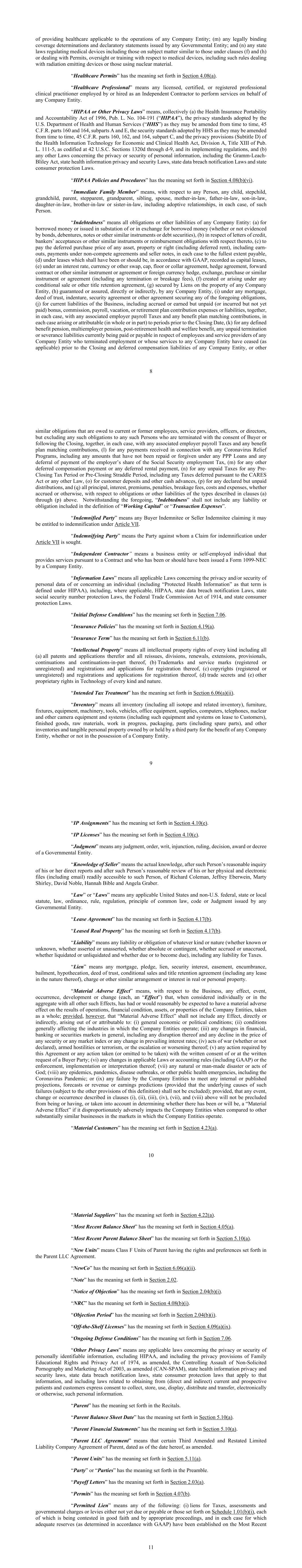 8 of providing healthcare applicable to the operations of any Company Entity; (m) any legally binding coverage determinations and declaratory statements issued by any Governmental Entity; and (n) any state laws regulating medical devices including those on subject matter similar to those under clauses (f) and (h) or dealing with Permits, oversight or training with respect to medical devices, including such rules dealing with radiation emitting devices or those using nuclear material. “Healthcare Permits” has the meaning set forth in Section 4.08(a). “Healthcare Professional” means any licensed, certified, or registered professional clinical practitioner employed by or hired as an Independent Contractor to perform services on behalf of any Company Entity. “HIPAA or Other Privacy Laws” means, collectively (a) the Health Insurance Portability and Accountability Act of 1996, Pub. L. No. 104-191 (“HIPAA”), the privacy standards adopted by the U.S. Department of Health and Human Services (“HHS”) as they may be amended from time to time, 45 C.F.R. parts 160 and 164, subparts A and E, the security standards adopted by HHS as they may be amended from time to time, 45 C.F.R. parts 160, 162, and 164, subpart C, and the privacy provisions (Subtitle D) of the Health Information Technology for Economic and Clinical Health Act, Division A, Title XIII of Pub. L. 111-5, as codified at 42 U.S.C. Sections 1320d through d-9, and its implementing regulations, and (b) any other Laws concerning the privacy or security of personal information, including the Gramm-Leach- Bliley Act, state health information privacy and security Laws, state data breach notification Laws and state consumer protection Laws. “HIPAA Policies and Procedures” has the meaning set forth in Section 4.08(b)(vi). “Immediate Family Member” means, with respect to any Person, any child, stepchild, grandchild, parent, stepparent, grandparent, sibling, spouse, mother-in-law, father-in-law, son-in-law, daughter-in-law, brother-in-law or sister-in-law, including adoptive relationships, in each case, of such Person. “Indebtedness” means all obligations or other liabilities of any Company Entity: (a) for borrowed money or issued in substation of or in exchange for borrowed money (whether or not evidenced by bonds, debentures, notes or other similar instruments or debt securities), (b) in respect of letters of credit, bankers’ acceptances or other similar instruments or reimbursement obligations with respect thereto, (c) to pay the deferred purchase price of any asset, property or right (including deferred rent), including earn- outs, payments under non-compete agreements and seller notes, in each case to the fullest extent payable, (d) under leases which shall have been or should be, in accordance with GAAP, recorded as capital leases, (e) under an interest rate, currency or other swap, cap, floor or collar agreement, hedge agreement, forward contract or other similar instrument or agreement or foreign currency hedge, exchange, purchase or similar instrument or agreement (including any termination or breakage fees), (f) created or arising under any conditional sale or other title retention agreement, (g) secured by Liens on the property of any Company Entity, (h) guaranteed or assured, directly or indirectly, by any Company Entity, (i) under any mortgage, deed of trust, indenture, security agreement or other agreement securing any of the foregoing obligations, (j) for current liabilities of the Business, including accrued or earned but unpaid (or incurred but not yet paid) bonus, commission, payroll, vacation, or retirement plan contribution expenses or liabilities, together, in each case, with any associated employer payroll Taxes and any benefit plan matching contributions, in each case arising or attributable (in whole or in part) to periods prior to the Closing Date, (k) for any defined benefit pension, multiemployer pension, post-retirement health and welfare benefit, any unpaid termination or severance liabilities currently being paid or payable in respect of employees and service providers of any Company Entity who terminated employment or whose services to any Company Entity have ceased (as applicable) prior to the Closing and deferred compensation liabilities of any Company Entity, or other 9 similar obligations that are owed to current or former employees, service providers, officers, or directors, but excluding any such obligations to any such Persons who are terminated with the consent of Buyer or following the Closing, together, in each case, with any associated employer payroll Taxes and any benefit plan matching contributions, (l) for any payments received in connection with any Coronavirus Relief Programs, including any amounts that have not been repaid or forgiven under any PPP Loans and any deferral of payment of the employer’s share of the Social Security employment Tax, (m) for any other deferred compensation payment or any deferred rental payment, (n) for any unpaid Taxes for any Pre- Closing Tax Period or Pre-Closing Straddle Period, including any Taxes deferred pursuant to the CARES Act or any other Law, (o) for customer deposits and other cash advances, (p) for any declared but unpaid distributions, and (q) all principal, interest, premiums, penalties, breakage fees, costs and expenses, whether accrued or otherwise, with respect to obligations or other liabilities of the types described in clauses (a) through (p) above. Notwithstanding the foregoing, “Indebtedness” shall not include any liability or obligation included in the definition of “Working Capital” or “Transaction Expenses”. “Indemnified Party” means any Buyer Indemnitee or Seller Indemnitee claiming it may be entitled to indemnification under Article VII. “Indemnifying Party” means the Party against whom a Claim for indemnification under Article VII is sought. “Independent Contractor” means a business entit