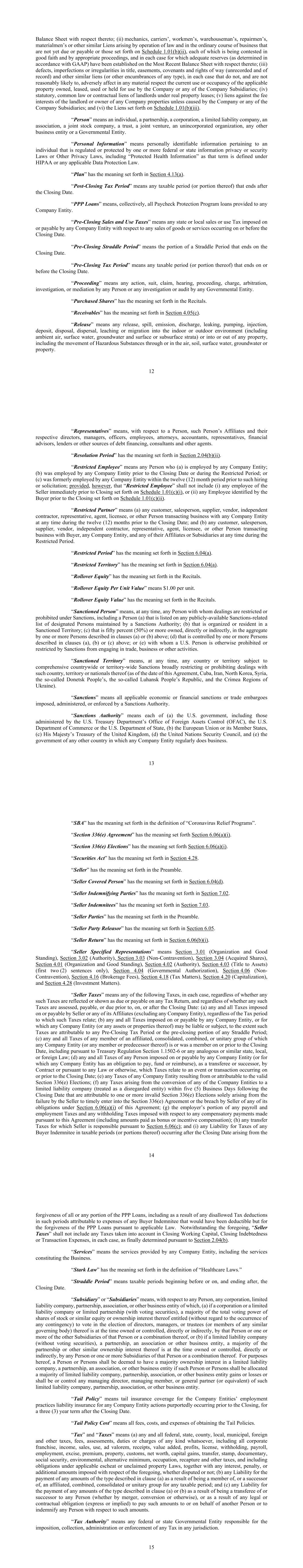 12 Balance Sheet with respect thereto; (ii) mechanics, carriers’, workmen’s, warehouseman’s, repairmen’s, materialmen’s or other similar Liens arising by operation of law and in the ordinary course of business that are not yet due or payable or those set forth on Schedule 1.01(b)(ii), each of which is being contested in good faith and by appropriate proceedings, and in each case for which adequate reserves (as determined in accordance with GAAP) have been established on the Most Recent Balance Sheet with respect thereto; (iii) defects, imperfections or irregularities in title, easements, covenants and rights of way (unrecorded and of record) and other similar liens (or other encumbrances of any type), in each case that do not, and are not reasonably likely to, adversely affect in any material respect the current use or occupancy of the applicable property owned, leased, used or held for use by the Company or any of the Company Subsidiaries; (iv) statutory, common law or contractual liens of landlords under real property leases; (v) liens against the fee interests of the landlord or owner of any Company properties unless caused by the Company or any of the Company Subsidiaries; and (vi) the Liens set forth on Schedule 1.01(b)(iii). “Person” means an individual, a partnership, a corporation, a limited liability company, an association, a joint stock company, a trust, a joint venture, an unincorporated organization, any other business entity or a Governmental Entity. “Personal Information” means personally identifiable information pertaining to an individual that is regulated or protected by one or more federal or state information privacy or security Laws or Other Privacy Laws, including “Protected Health Information” as that term is defined under HIPAA or any applicable Data Protection Law. “Plan” has the meaning set forth in Section 4.13(a). “Post-Closing Tax Period” means any taxable period (or portion thereof) that ends after the Closing Date. “PPP Loans” means, collectively, all Paycheck Protection Program loans provided to any Company Entity. “Pre-Closing Sales and Use Taxes” means any state or local sales or use Tax imposed on or payable by any Company Entity with respect to any sales of goods or services occurring on or before the Closing Date. “Pre-Closing Straddle Period” means the portion of a Straddle Period that ends on the Closing Date. “Pre-Closing Tax Period” means any taxable period (or portion thereof) that ends on or before the Closing Date. “Proceeding” means any action, suit, claim, hearing, proceeding, charge, arbitration, investigation, or mediation by any Person or any investigation or audit by any Governmental Entity. “Purchased Shares” has the meaning set forth in the Recitals. “Receivables” has the meaning set forth in Section 4.05(c). “Release” means any release, spill, emission, discharge, leaking, pumping, injection, deposit, disposal, dispersal, leaching or migration into the indoor or outdoor environment (including ambient air, surface water, groundwater and surface or subsurface strata) or into or out of any property, including the movement of Hazardous Substances through or in the air, soil, surface water, groundwater or property. 13 “Representatives” means, with respect to a Person, such Person’s Affiliates and their respective directors, managers, officers, employees, attorneys, accountants, representatives, financial advisors, lenders or other sources of debt financing, consultants and other agents. “Resolution Period” has the meaning set forth in Section 2.04(b)(ii). “Restricted Employee” means any Person who (a) is employed by any Company Entity; (b) was employed by any Company Entity prior to the Closing Date or during the Restricted Period; or (c) was formerly employed by any Company Entity within the twelve (12) month period prior to such hiring or solicitation; provided, however, that “Restricted Employee” shall not include (i) any employee of the Seller immediately prior to Closing set forth on Schedule 1.01(c)(i), or (ii) any Employee identified by the Buyer prior to the Closing set forth on Schedule 1.01(c)(ii). “Restricted Partner” means (a) any customer, salesperson, supplier, vendor, independent contractor, representative, agent, licensee, or other Person transacting business with any Company Entity at any time during the twelve (12) months prior to the Closing Date; and (b) any customer, salesperson, supplier, vendor, independent contractor, representative, agent, licensee, or other Person transacting business with Buyer, any Company Entity, and any of their Affiliates or Subsidiaries at any time during the Restricted Period. “Restricted Period” has the meaning set forth in Section 6.04(a). “Restricted Territory” has the meaning set forth in Section 6.04(a). “Rollover Equity” has the meaning set forth in the Recitals. “Rollover Equity Per Unit Value” means $1.00 per unit. “Rollover Equity Value” has the meaning set forth in the Recitals. “Sanctioned Person” means, at any time, any Person with whom dealings are restricted or prohibited under Sanctions, including a Person (a) that is listed on any publicly-available Sanctions-related list of designated Persons maintained by a Sanctions Authority; (b) that is organized or resident in a Sanctioned Territory; (c) that is fifty percent (50%) or more owned, directly or indirectly, in the aggregate by one or more Persons described in clauses (a) or (b) above; (d) that is controlled by one or more Persons described in clauses (a), (b) or (c) above; or (e) with whom a U.S. Person is otherwise prohibited or restricted by Sanctions from engaging in trade, business or other activities. “Sanctioned Territory” means, at any time, any country or territory subject to comprehensive countrywide or territory-wide Sanctions broadly restricting or prohibiting dealings with such country, territory or na