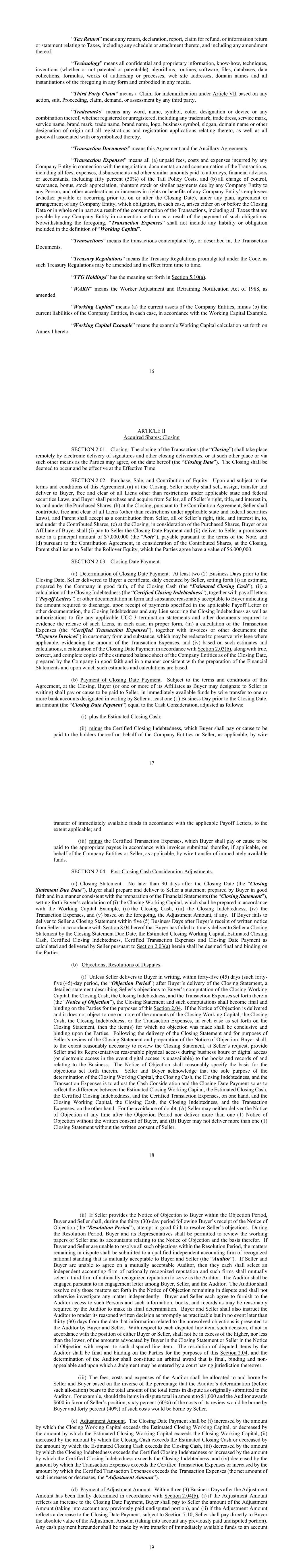 16 “Tax Return” means any return, declaration, report, claim for refund, or information return or statement relating to Taxes, including any schedule or attachment thereto, and including any amendment thereof. “Technology” means all confidential and proprietary information, know-how, techniques, inventions (whether or not patented or patentable), algorithms, routines, software, files, databases, data collections, formulas, works of authorship or processes, web site addresses, domain names and all instantiations of the foregoing in any form and embodied in any media. “Third Party Claim” means a Claim for indemnification under Article VII based on any action, suit, Proceeding, claim, demand, or assessment by any third party. “Trademarks” means any word, name, symbol, color, designation or device or any combination thereof, whether registered or unregistered, including any trademark, trade dress, service mark, service name, brand mark, trade name, brand name, logo, business symbol, slogan, domain name or other designation of origin and all registrations and registration applications relating thereto, as well as all goodwill associated with or symbolized thereby. “Transaction Documents” means this Agreement and the Ancillary Agreements. “Transaction Expenses” means all (a) unpaid fees, costs and expenses incurred by any Company Entity in connection with the negotiation, documentation and consummation of the Transactions, including all fees, expenses, disbursements and other similar amounts paid to attorneys, financial advisors or accountants, including fifty percent (50%) of the Tail Policy Costs, and (b) all change of control, severance, bonus, stock appreciation, phantom stock or similar payments due by any Company Entity to any Person, and other accelerations or increases in rights or benefits of any Company Entity’s employees (whether payable or occurring prior to, on or after the Closing Date), under any plan, agreement or arrangement of any Company Entity, which obligation, in each case, arises either on or before the Closing Date or in whole or in part as a result of the consummation of the Transactions, including all Taxes that are payable by any Company Entity in connection with or as a result of the payment of such obligations. Notwithstanding the foregoing, “Transaction Expenses” shall not include any liability or obligation included in the definition of “Working Capital”. “Transactions” means the transactions contemplated by, or described in, the Transaction Documents. “Treasury Regulations” means the Treasury Regulations promulgated under the Code, as such Treasury Regulations may be amended and in effect from time to time. “TTG Holdings” has the meaning set forth in Section 5.10(a). “WARN” means the Worker Adjustment and Retraining Notification Act of 1988, as amended. “Working Capital” means (a) the current assets of the Company Entities, minus (b) the current liabilities of the Company Entities, in each case, in accordance with the Working Capital Example. “Working Capital Example” means the example Working Capital calculation set forth on Annex I hereto. 17 ARTICLE II Acquired Shares; Closing SECTION 2.01. Closing. The closing of the Transactions (the “Closing”) shall take place remotely by electronic delivery of signatures and other closing deliverables, or at such other place or via such other means as the Parties may agree, on the date hereof (the “Closing Date”). The Closing shall be deemed to occur and be effective at the Effective Time. SECTION 2.02. Purchase, Sale, and Contribution of Equity. Upon and subject to the terms and conditions of this Agreement, (a) at the Closing, Seller hereby shall sell, assign, transfer and deliver to Buyer, free and clear of all Liens other than restrictions under applicable state and federal securities Laws, and Buyer shall purchase and acquire from Seller, all of Seller’s right, title, and interest in, to, and under the Purchased Shares, (b) at the Closing, pursuant to the Contribution Agreement, Seller shall contribute, free and clear of all Liens (other than restrictions under applicable state and federal securities Laws), and Parent shall accept as a contribution from Seller, all of Seller’s right, title, and interest in, to, and under the Contributed Shares, (c) at the Closing, in consideration of the Purchased Shares, Buyer or an Affiliate of Buyer shall (i) pay to Seller the Closing Date Payment and (ii) deliver to Seller a promissory note in a principal amount of $7,000,000 (the “Note”), payable pursuant to the terms of the Note, and (d) pursuant to the Contribution Agreement, in consideration of the Contributed Shares, at the Closing, Parent shall issue to Seller the Rollover Equity, which the Parties agree have a value of $6,000,000. SECTION 2.03. Closing Date Payment. (a) Determination of Closing Date Payment. At least two (2) Business Days prior to the Closing Date, Seller delivered to Buyer a certificate, duly executed by Seller, setting forth (i) an estimate, prepared by the Company in good faith, of the Closing Cash (the “Estimated Closing Cash”), (ii) a calculation of the Closing Indebtedness (the “Certified Closing Indebtedness”), together with payoff letters (“Payoff Letters”) or other documentation in form and substance reasonably acceptable to Buyer indicating the amount required to discharge, upon receipt of payments specified in the applicable Payoff Letter or other documentation, the Closing Indebtedness and any Lien securing the Closing Indebtedness as well as authorizations to file any applicable UCC-3 termination statements and other documents required to evidence the release of such Liens, in each case, in proper form, (iii) a calculation of the Transaction Expenses (the “Certified Transaction Expenses”), together with invoices or other documents (the “Expense Invoices”) in customary form and substance, which may be 
