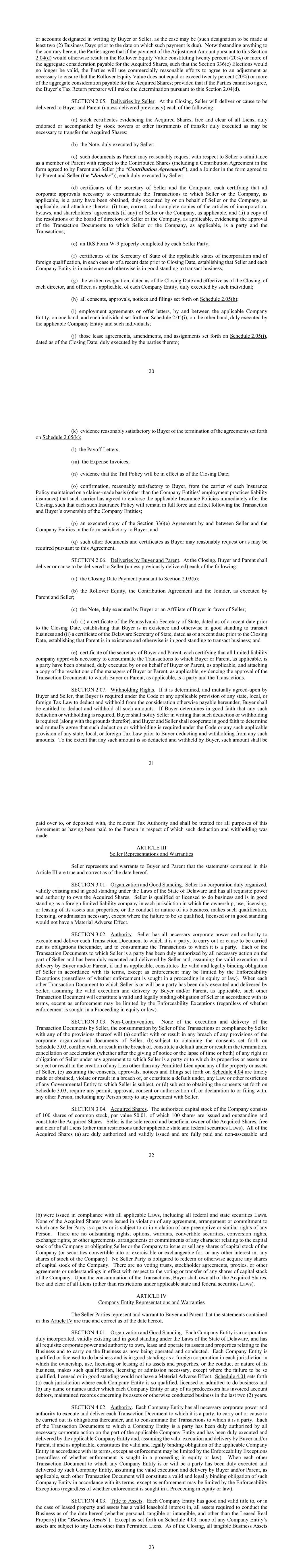 20 or accounts designated in writing by Buyer or Seller, as the case may be (such designation to be made at least two (2) Business Days prior to the date on which such payment is due). Notwithstanding anything to the contrary herein, the Parties agree that if the payment of the Adjustment Amount pursuant to this Section 2.04(d) would otherwise result in the Rollover Equity Value constituting twenty percent (20%) or more of the aggregate consideration payable for the Acquired Shares, such that the Section 336(e) Elections would no longer be valid, the Parties will use commercially reasonable efforts to agree to an adjustment as necessary to ensure that the Rollover Equity Value does not equal or exceed twenty percent (20%) or more of the aggregate consideration payable for the Acquired Shares; provided that if the Parties cannot so agree, the Buyer’s Tax Return preparer will make the determination pursuant to this Section 2.04(d). SECTION 2.05. Deliveries by Seller. At the Closing, Seller will deliver or cause to be delivered to Buyer and Parent (unless delivered previously) each of the following: (a) stock certificates evidencing the Acquired Shares, free and clear of all Liens, duly endorsed or accompanied by stock powers or other instruments of transfer duly executed as may be necessary to transfer the Acquired Shares; (b) the Note, duly executed by Seller; (c) such documents as Parent may reasonably request with respect to Seller’s admittance as a member of Parent with respect to the Contributed Shares (including a Contribution Agreement in the form agreed to by Parent and Seller (the “Contribution Agreement”), and a Joinder in the form agreed to by Parent and Seller (the “Joinder”)), each duly executed by Seller; (d) certificates of the secretary of Seller and the Company, each certifying that all corporate approvals necessary to consummate the Transactions to which Seller or the Company, as applicable, is a party have been obtained, duly executed by or on behalf of Seller or the Company, as applicable, and attaching thereto: (i) true, correct, and complete copies of the articles of incorporation, bylaws, and shareholders’ agreements (if any) of Seller or the Company, as applicable, and (ii) a copy of the resolutions of the board of directors of Seller or the Company, as applicable, evidencing the approval of the Transaction Documents to which Seller or the Company, as applicable, is a party and the Transactions; (e) an IRS Form W-9 properly completed by each Seller Party; (f) certificates of the Secretary of State of the applicable states of incorporation and of foreign qualification, in each case as of a recent date prior to Closing Date, establishing that Seller and each Company Entity is in existence and otherwise is in good standing to transact business; (g) the written resignation, dated as of the Closing Date and effective as of the Closing, of each director, and officer, as applicable, of each Company Entity, duly executed by such individual; (h) all consents, approvals, notices and filings set forth on Schedule 2.05(h); (i) employment agreements or offer letters, by and between the applicable Company Entity, on one hand, and each individual set forth on Schedule 2.05(i), on the other hand, duly executed by the applicable Company Entity and such individuals; (j) those lease agreements, amendments, and assignments set forth on Schedule 2.05(j), dated as of the Closing Date, duly executed by the parties thereto; 21 (k) evidence reasonably satisfactory to Buyer of the termination of the agreements set forth on Schedule 2.05(k); (l) the Payoff Letters; (m) the Expense Invoices; (n) evidence that the Tail Policy will be in effect as of the Closing Date; (o) confirmation, reasonably satisfactory to Buyer, from the carrier of each Insurance Policy maintained on a claims-made basis (other than the Company Entities’ employment practices liability insurance) that such carrier has agreed to endorse the applicable Insurance Policies immediately after the Closing, such that each such Insurance Policy will remain in full force and effect following the Transaction and Buyer’s ownership of the Company Entities; (p) an executed copy of the Section 336(e) Agreement by and between Seller and the Company Entities in the form satisfactory to Buyer; and (q) such other documents and certificates as Buyer may reasonably request or as may be required pursuant to this Agreement. SECTION 2.06. Deliveries by Buyer and Parent. At the Closing, Buyer and Parent shall deliver or cause to be delivered to Seller (unless previously delivered) each of the following: (a) the Closing Date Payment pursuant to Section 2.03(b); (b) the Rollover Equity, the Contribution Agreement and the Joinder, as executed by Parent and Seller; (c) the Note, duly executed by Buyer or an Affiliate of Buyer in favor of Seller; (d) (i) a certificate of the Pennsylvania Secretary of State, dated as of a recent date prior to the Closing Date, establishing that Buyer is in existence and otherwise in good standing to transact business and (ii) a certificate of the Delaware Secretary of State, dated as of a recent date prior to the Closing Date, establishing that Parent is in existence and otherwise is in good standing to transact business; and (e) certificate of the secretary of Buyer and Parent, each certifying that all limited liability company approvals necessary to consummate the Transactions to which Buyer or Parent, as applicable, is a party have been obtained, duly executed by or on behalf of Buyer or Parent, as applicable, and attaching a copy of the resolutions of the managers of Buyer or Parent, as applicable, evidencing the approval of the Transaction Documents to which Buyer or Parent, as applicable, is a party and the Transactions. SECTION 2.07. Withholding Rights. If it is determined, and mutually agreed-upon by Buyer and Seller, that Buyer is required under the Code or any applicable provision of any state