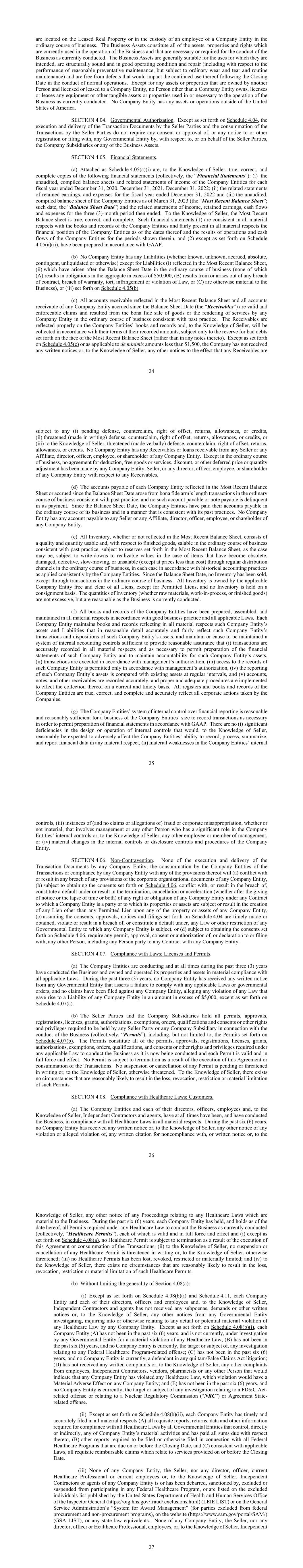 24 are located on the Leased Real Property or in the custody of an employee of a Company Entity in the ordinary course of business. The Business Assets constitute all of the assets, properties and rights which are currently used in the operation of the Business and that are necessary or required for the conduct of the Business as currently conducted. The Business Assets are generally suitable for the uses for which they are intended, are structurally sound and in good operating condition and repair (including with respect to the performance of reasonable preventative maintenance, but subject to ordinary wear and tear and routine maintenance) and are free from defects that would impact the continued use thereof following the Closing Date in the conduct of normal operations. Except for any assets or properties that are owned by another Person and licensed or leased to a Company Entity, no Person other than a Company Entity owns, licenses or leases any equipment or other tangible assets or properties used in or necessary to the operation of the Business as currently conducted. No Company Entity has any assets or operations outside of the United States of America. SECTION 4.04. Governmental Authorization. Except as set forth on Schedule 4.04, the execution and delivery of the Transaction Documents by the Seller Parties and the consummation of the Transactions by the Seller Parties do not require any consent or approval of, or any notice to or other registration or filing with, any Governmental Entity by, with respect to, or on behalf of the Seller Parties, the Company Subsidiaries or any of the Business Assets. SECTION 4.05. Financial Statements. (a) Attached as Schedule 4.05(a)(i) are, to the Knowledge of Seller, true, correct, and complete copies of the following financial statements (collectively, the “Financial Statements”): (i) the unaudited, compiled balance sheets and related statements of income of the Company Entities for each fiscal year ended December 31, 2020, December 31, 2021, December 31, 2022; (ii) the related statements of retained earnings, and expenses for the fiscal year ended December 31, 2022 and (iii) the unaudited, compiled balance sheet of the Company Entities as of March 31, 2023 (the “Most Recent Balance Sheet”; such date, the “Balance Sheet Date”) and the related statements of income, retained earnings, cash flows and expenses for the three (3)-month period then ended. To the Knowledge of Seller, the Most Recent Balance sheet is true, correct, and complete. Such financial statements (1) are consistent in all material respects with the books and records of the Company Entities and fairly present in all material respects the financial position of the Company Entities as of the dates thereof and the results of operations and cash flows of the Company Entities for the periods shown therein, and (2) except as set forth on Schedule 4.05(a)(ii), have been prepared in accordance with GAAP. (b) No Company Entity has any Liabilities (whether known, unknown, accrued, absolute, contingent, unliquidated or otherwise) except for Liabilities (i) reflected in the Most Recent Balance Sheet, (ii) which have arisen after the Balance Sheet Date in the ordinary course of business (none of which (A) results in obligations in the aggregate in excess of $50,000, (B) results from or arises out of any breach of contract, breach of warranty, tort, infringement or violation of Law, or (C) are otherwise material to the Business), or (iii) set forth on Schedule 4.05(b). (c) All accounts receivable reflected in the Most Recent Balance Sheet and all accounts receivable of any Company Entity accrued since the Balance Sheet Date (the “Receivables”) are valid and enforceable claims and resulted from the bona fide sale of goods or the rendering of services by any Company Entity in the ordinary course of business consistent with past practice. The Receivables are reflected properly on the Company Entities’ books and records and, to the Knowledge of Seller, will be collected in accordance with their terms at their recorded amounts, subject only to the reserve for bad debts set forth on the face of the Most Recent Balance Sheet (rather than in any notes thereto). Except as set forth on Schedule 4.05(c) or as applicable to de minimis amounts less than $1,500, the Company has not received any written notices or, to the Knowledge of Seller, any other notices to the effect that any Receivables are 25 subject to any (i) pending defense, counterclaim, right of offset, returns, allowances, or credits, (ii) threatened (made in writing) defense, counterclaim, right of offset, returns, allowances, or credits, or (iii) to the Knowledge of Seller, threatened (made verbally) defense, counterclaim, right of offset, returns, allowances, or credits. No Company Entity has any Receivables or loans receivable from any Seller or any Affiliate, director, officer, employee, or shareholder of any Company Entity. Except in the ordinary course of business, no agreement for deduction, free goods or services, discount, or other deferred price or quantity adjustment has been made by any Company Entity, Seller, or any director, officer, employee, or shareholder of any Company Entity with respect to any Receivables. (d) The accounts payable of each Company Entity reflected in the Most Recent Balance Sheet or accrued since the Balance Sheet Date arose from bona fide arm’s length transactions in the ordinary course of business consistent with past practice, and no such account payable or note payable is delinquent in its payment. Since the Balance Sheet Date, the Company Entities have paid their accounts payable in the ordinary course of its business and in a manner that is consistent with its past practices. No Company Entity has any account payable to any Seller or any Affiliate, director, officer, employee, or shareholder of any Company Entity. (e) All Inventory, whether or not reflected in the Most Recent Bala