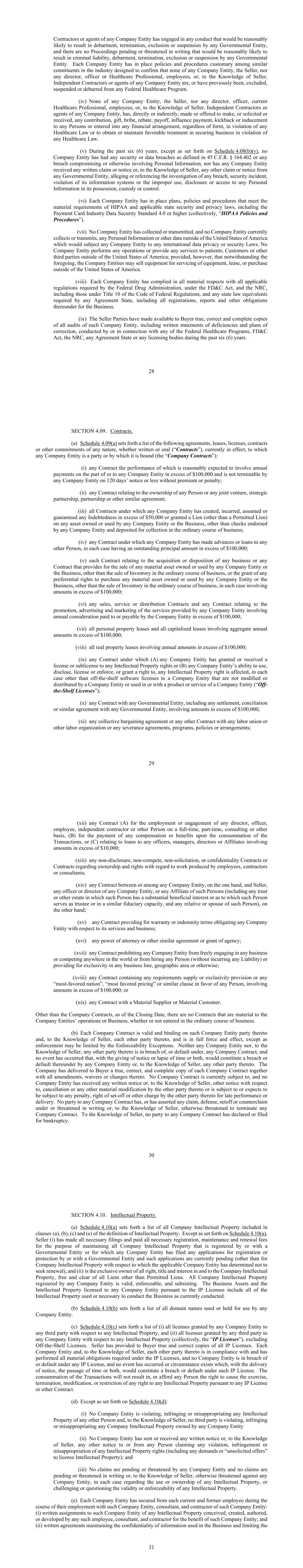 28 Contractors or agents of any Company Entity has engaged in any conduct that would be reasonably likely to result in debarment, termination, exclusion or suspension by any Governmental Entity, and there are no Proceedings pending or threatened in writing that would be reasonably likely to result in criminal liability, debarment, termination, exclusion or suspension by any Governmental Entity. Each Company Entity has in place policies and procedures customary among similar constituents in the industry designed to confirm that none of any Company Entity, the Seller, nor any director, officer or Healthcare Professional, employees, or, to the Knowledge of Seller, Independent Contractors or agents of any Company Entity are, or have previously been, excluded, suspended or debarred from any Federal Healthcare Program. (iv) None of any Company Entity, the Seller, nor any director, officer, current Healthcare Professional, employees, or, to the Knowledge of Seller, Independent Contractors or agents of any Company Entity, has, directly or indirectly, made or offered to make, or solicited or received, any contribution, gift, bribe, rebate, payoff, influence payment, kickback or inducement to any Persons or entered into any financial arrangement, regardless of form, in violation of any Healthcare Law or to obtain or maintain favorable treatment in securing business in violation of any Healthcare Law. (v) During the past six (6) years, except as set forth on Schedule 4.08(b)(v), no Company Entity has had any security or data breaches as defined in 45 C.F.R. § 164.402 or any breach compromising or otherwise involving Personal Information, nor has any Company Entity received any written claim or notice or, to the Knowledge of Seller, any other claim or notice from any Governmental Entity, alleging or referencing the investigation of any breach, security incident, violation of its information systems or the improper use, disclosure or access to any Personal Information in its possession, custody or control. (vi) Each Company Entity has in place plans, policies and procedures that meet the material requirements of HIPAA and applicable state security and privacy laws, including the Payment Card Industry Data Security Standard 4.0 or higher (collectively, “HIPAA Policies and Procedures”). (vii) No Company Entity has collected or transmitted, and no Company Entity currently collects or transmits, any Personal Information or other data outside of the United States of America which would subject any Company Entity to any international data privacy or security Laws. No Company Entity performs any operations or provide any services to patients, Customers or other third parties outside of the United States of America; provided, however, that notwithstanding the foregoing, the Company Entities may sell equipment for servicing of equipment, lease, or purchase outside of the United States of America. (viii) Each Company Entity has complied in all material respects with all applicable regulations required by the Federal Drug Administration, under the FD&C Act, and the NRC, including those under Title 10 of the Code of Federal Regulations, and any state law equivalents required by any Agreement State, including all registrations, reports and other obligations thereunder for the Business. (ix) The Seller Parties have made available to Buyer true, correct and complete copies of all audits of each Company Entity, including written statements of deficiencies and plans of correction, conducted by or in connection with any of the Federal Healthcare Programs, FD&C Act, the NRC, any Agreement State or any licensing bodies during the past six (6) years. 29 SECTION 4.09. Contracts. (a) Schedule 4.09(a) sets forth a list of the following agreements, leases, licenses, contracts or other commitments of any nature, whether written or oral (“Contracts”), currently in effect, to which any Company Entity is a party or by which it is bound (the “Company Contracts”): (i) any Contract the performance of which is reasonably expected to involve annual payments on the part of or to any Company Entity in excess of $100,000 and is not terminable by any Company Entity on 120 days’ notice or less without premium or penalty; (ii) any Contract relating to the ownership of any Person or any joint venture, strategic partnership, partnership or other similar agreement; (iii) all Contracts under which any Company Entity has created, incurred, assumed or guaranteed any Indebtedness in excess of $50,000 or granted a Lien (other than a Permitted Lien) on any asset owned or used by any Company Entity or the Business, other than checks endorsed by any Company Entity and deposited for collection in the ordinary course of business; (iv) any Contract under which any Company Entity has made advances or loans to any other Person, in each case having an outstanding principal amount in excess of $100,000; (v) each Contract relating to the acquisition or disposition of any business or any Contract that provides for the sale of any material asset owned or used by any Company Entity or the Business, other than the sale of Inventory in the ordinary course of business, or the grant of any preferential rights to purchase any material asset owned or used by any Company Entity or the Business, other than the sale of Inventory in the ordinary course of business, in each case involving amounts in excess of $100,000; (vi) any sales, service or distribution Contracts and any Contract relating to the promotion, advertising and marketing of the services provided by any Company Entity involving annual consideration paid to or payable by the Company Entity in excess of $100,000; (vii) all personal property leases and all capitalized leases involving aggregate annual amounts in excess of $100,000; (viii) all real property leases involving annual amounts in excess of $100,000; (ix) any Contract under which (A) any Company Entity has granted or received a license