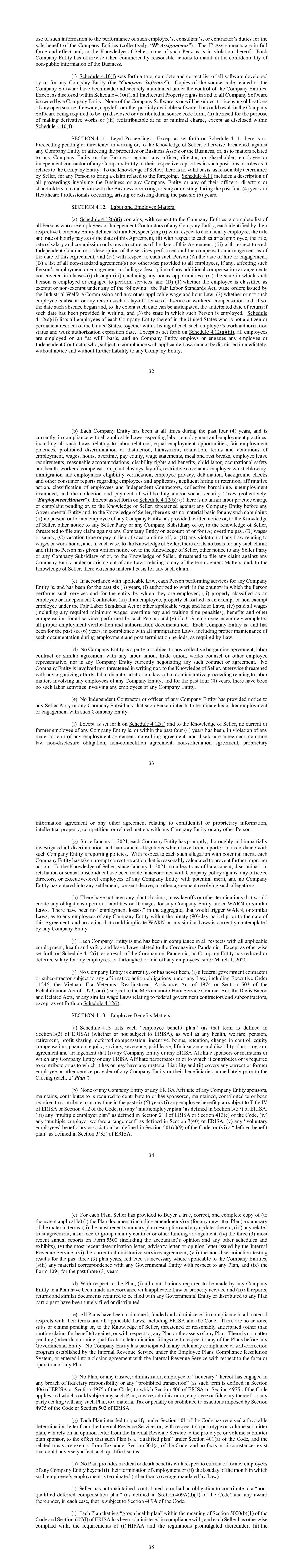 32 use of such information to the performance of such employee’s, consultant’s, or contractor’s duties for the sole benefit of the Company Entities (collectively, “IP Assignments”). The IP Assignments are in full force and effect and, to the Knowledge of Seller, none of such Persons is in violation thereof. Each Company Entity has otherwise taken commercially reasonable actions to maintain the confidentiality of non-public information of the Business. (f) Schedule 4.10(f) sets forth a true, complete and correct list of all software developed by or for any Company Entity (the “Company Software”). Copies of the source code related to the Company Software have been made and securely maintained under the control of the Company Entities. Except as disclosed within Schedule 4.10(f), all Intellectual Property rights in and to all Company Software is owned by a Company Entity. None of the Company Software is or will be subject to licensing obligations of any open source, freeware, copyleft, or other publicly available software that could result in the Company Software being required to be: (i) disclosed or distributed in source code form, (ii) licensed for the purpose of making derivative works or (iii) redistributable at no or minimal charge, except as disclosed within Schedule 4.10(f). SECTION 4.11. Legal Proceedings. Except as set forth on Schedule 4.11, there is no Proceeding pending or threatened in writing or, to the Knowledge of Seller, otherwise threatened, against any Company Entity or affecting the properties or Business Assets or the Business, or, as to matters related to any Company Entity or the Business, against any officer, director, or shareholder, employee or independent contractor of any Company Entity in their respective capacities in such positions or roles as it relates to the Company Entity. To the Knowledge of Seller, there is no valid basis, as reasonably determined by Seller, for any Person to bring a claim related to the foregoing. Schedule 4.11 includes a description of all proceedings involving the Business or any Company Entity or any of their officers, directors or shareholders in connection with the Business occurring, arising or existing during the past four (4) years or Healthcare Professionals occurring, arising or existing during the past six (6) years. SECTION 4.12. Labor and Employee Matters. (a) Schedule 4.12(a)(i) contains, with respect to the Company Entities, a complete list of all Persons who are employees or Independent Contractors of any Company Entity, each identified by their respective Company Entity delineated number, specifying (i) with respect to each hourly employee, the title and rate of hourly pay as of the date of this Agreement, (ii) with respect to each salaried employee, the title, rate of salary and commission or bonus structure as of the date of this Agreement, (iii) with respect to each Independent Contractor, a description of the services performed and the compensation arrangement as of the date of this Agreement, and (iv) with respect to each such Person (A) the date of hire or engagement, (B) a list of all non-standard agreement(s) not otherwise provided to all employees, if any, affecting such Person’s employment or engagement, including a description of any additional compensation arrangements not covered in clauses (i) through (iii) (including any bonus opportunities), (C) the state in which such Person is employed or engaged to perform services, and (D) (1) whether the employee is classified as exempt or non-exempt under any of the following: the Fair Labor Standards Act, wage orders issued by the Industrial Welfare Commission and any other applicable wage and hour Law, (2) whether or not such employee is absent for any reason such as lay-off, leave of absence or workers’ compensation and, if so, the date such absence began and, to the extent such date can be anticipated, the anticipated date of return if such date has been provided in writing, and (3) the state in which such Person is employed. Schedule 4.12(a)(ii) lists all employees of each Company Entity thereof in the United States who is not a citizen or permanent resident of the United States, together with a listing of each such employee’s work authorization status and work authorization expiration date. Except as set forth on Schedule 4.12(a)(iii), all employees are employed on an “at will” basis, and no Company Entity employs or engages any employee or Independent Contractor who, subject to compliance with applicable Law, cannot be dismissed immediately, without notice and without further liability to any Company Entity. 33 (b) Each Company Entity has been at all times during the past four (4) years, and is currently, in compliance with all applicable Laws respecting labor, employment and employment practices, including all such Laws relating to labor relations, equal employment opportunities, fair employment practices, prohibited discrimination or distinction, harassment, retaliation, terms and conditions of employment, wages, hours, overtime, pay equity, wage statements, meal and rest breaks, employee leave requirements, reasonable accommodations, disability rights and benefits, child labor, occupational safety and health, workers’ compensation, plant closings, layoffs, restrictive covenants, employee whistleblowing, immigration and employment eligibility verification, employee privacy, defamation, background checks and other consumer reports regarding employees and applicants, negligent hiring or retention, affirmative action, classification of employees and Independent Contractors, collective bargaining, unemployment insurance, and the collection and payment of withholding and/or social security Taxes (collectively, “Employment Matters”). Except as set forth on Schedule 4.12(b): (i) there is no unfair labor practice charge or complaint pending or, to the Knowledge of Seller, threatened against any Company Entity before any Governmental 