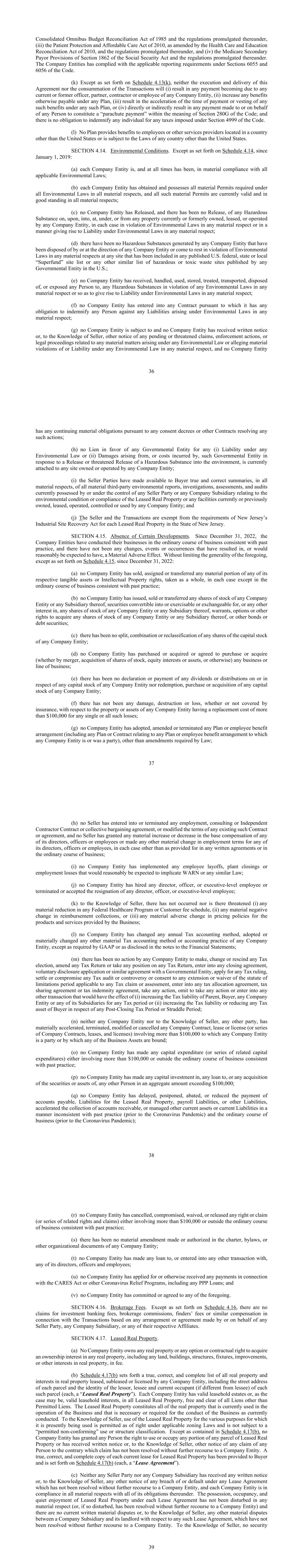 36 Consolidated Omnibus Budget Reconciliation Act of 1985 and the regulations promulgated thereunder, (iii) the Patient Protection and Affordable Care Act of 2010, as amended by the Health Care and Education Reconciliation Act of 2010, and the regulations promulgated thereunder, and (iv) the Medicare Secondary Payor Provisions of Section 1862 of the Social Security Act and the regulations promulgated thereunder. The Company Entities has complied with the applicable reporting requirements under Sections 6055 and 6056 of the Code. (k) Except as set forth on Schedule 4.13(k), neither the execution and delivery of this Agreement nor the consummation of the Transactions will (i) result in any payment becoming due to any current or former officer, partner, contractor or employee of any Company Entity, (ii) increase any benefits otherwise payable under any Plan, (iii) result in the acceleration of the time of payment or vesting of any such benefits under any such Plan, or (iv) directly or indirectly result in any payment made to or on behalf of any Person to constitute a “parachute payment” within the meaning of Section 280G of the Code; and there is no obligation to indemnify any individual for any taxes imposed under Section 4999 of the Code. (l) No Plan provides benefits to employees or other services providers located in a country other than the United States or is subject to the Laws of any country other than the United States. SECTION 4.14. Environmental Conditions. Except as set forth on Schedule 4.14, since January 1, 2019: (a) each Company Entity is, and at all times has been, in material compliance with all applicable Environmental Laws; (b) each Company Entity has obtained and possesses all material Permits required under all Environmental Laws in all material respects, and all such material Permits are currently valid and in good standing in all material respects; (c) no Company Entity has Released, and there has been no Release, of any Hazardous Substance on, upon, into, at, under, or from any property currently or formerly owned, leased, or operated by any Company Entity, in each case in violation of Environmental Laws in any material respect or in a manner giving rise to Liability under Environmental Laws in any material respect; (d) there have been no Hazardous Substances generated by any Company Entity that have been disposed of by or at the direction of any Company Entity or come to rest in violation of Environmental Laws in any material respects at any site that has been included in any published U.S. federal, state or local “Superfund” site list or any other similar list of hazardous or toxic waste sites published by any Governmental Entity in the U.S.; (e) no Company Entity has received, handled, used, stored, treated, transported, disposed of, or exposed any Person to, any Hazardous Substances in violation of any Environmental Laws in any material respect or so as to give rise to Liability under Environmental Laws in any material respect; (f) no Company Entity has entered into any Contract pursuant to which it has any obligation to indemnify any Person against any Liabilities arising under Environmental Laws in any material respect; (g) no Company Entity is subject to and no Company Entity has received written notice or, to the Knowledge of Seller, other notice of any pending or threatened claims, enforcement actions, or legal proceedings related to any material matters arising under any Environmental Law or alleging material violations of or Liability under any Environmental Law in any material respect, and no Company Entity 37 has any continuing material obligations pursuant to any consent decrees or other Contracts resolving any such actions; (h) no Lien in favor of any Governmental Entity for any (i) Liability under any Environmental Law or (ii) Damages arising from, or costs incurred by, such Governmental Entity in response to a Release or threatened Release of a Hazardous Substance into the environment, is currently attached to any site owned or operated by any Company Entity; (i) the Seller Parties have made available to Buyer true and correct summaries, in all material respects, of all material third-party environmental reports, investigations, assessments, and audits currently possessed by or under the control of any Seller Party or any Company Subsidiary relating to the environmental condition or compliance of the Leased Real Property or any facilities currently or previously owned, leased, operated, controlled or used by any Company Entity; and (j) The Seller and the Transactions are exempt from the requirements of New Jersey’s Industrial Site Recovery Act for each Leased Real Property in the State of New Jersey. SECTION 4.15. Absence of Certain Developments. Since December 31, 2022, the Company Entities have conducted their businesses in the ordinary course of business consistent with past practice, and there have not been any changes, events or occurrences that have resulted in, or would reasonably be expected to have, a Material Adverse Effect. Without limiting the generality of the foregoing, except as set forth on Schedule 4.15, since December 31, 2022: (a) no Company Entity has sold, assigned or transferred any material portion of any of its respective tangible assets or Intellectual Property rights, taken as a whole, in each case except in the ordinary course of business consistent with past practice; (b) no Company Entity has issued, sold or transferred any shares of stock of any Company Entity or any Subsidiary thereof, securities convertible into or exercisable or exchangeable for, or any other interest in, any shares of stock of any Company Entity or any Subsidiary thereof, warrants, options or other rights to acquire any shares of stock of any Company Entity or any Subsidiary thereof, or other bonds or debt securities; (c) there has been no split, combination or reclassification of any shares of the capital stock of any Company Entity; (d) 