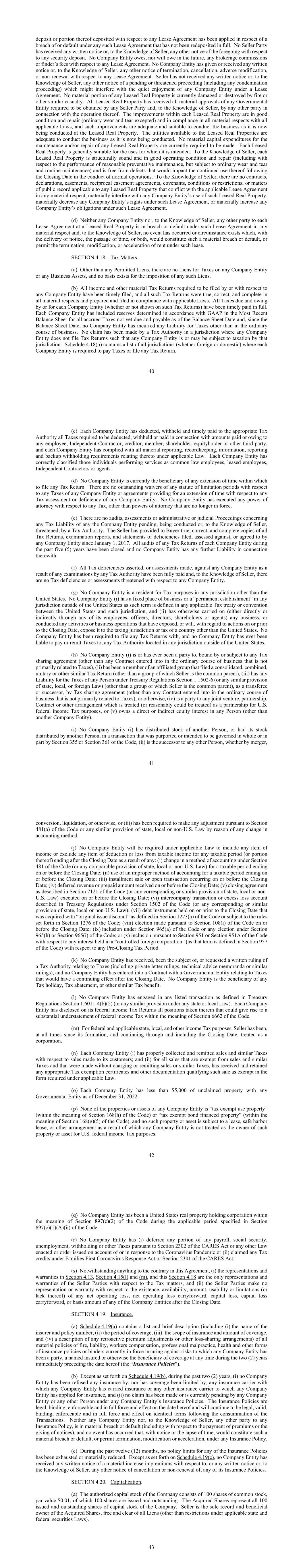 40 deposit or portion thereof deposited with respect to any Lease Agreement has been applied in respect of a breach of or default under any such Lease Agreement that has not been redeposited in full. No Seller Party has received any written notice or, to the Knowledge of Seller, any other notice of the foregoing with respect to any security deposit. No Company Entity owes, nor will owe in the future, any brokerage commissions or finder’s fees with respect to any Lease Agreement. No Company Entity has given or received any written notice or, to the Knowledge of Seller, any other notice of termination, cancellation, adverse modification, or non-renewal with respect to any Lease Agreement. Seller has not received any written notice or, to the Knowledge of Seller, any other notice of a pending or threatened proceeding (including any condemnation proceeding) which might interfere with the quiet enjoyment of any Company Entity under a Lease Agreement. No material portion of any Leased Real Property is currently damaged or destroyed by fire or other similar casualty. All Leased Real Property has received all material approvals of any Governmental Entity required to be obtained by any Seller Party and, to the Knowledge of Seller, by any other party in connection with the operation thereof. The improvements within each Leased Real Property are in good condition and repair (ordinary wear and tear excepted) and in compliance in all material respects with all applicable Laws, and such improvements are adequate and suitable to conduct the business as it is now being conducted at the Leased Real Property. The utilities available to the Leased Real Properties are adequate to conduct the business as it is now being conducted. No material capital expenditures for the maintenance and/or repair of any Leased Real Property are currently required to be made. Each Leased Real Property is generally suitable for the uses for which it is intended. To the Knowledge of Seller, each Leased Real Property is structurally sound and in good operating condition and repair (including with respect to the performance of reasonable preventative maintenance, but subject to ordinary wear and tear and routine maintenance) and is free from defects that would impact the continued use thereof following the Closing Date in the conduct of normal operations. To the Knowledge of Seller, there are no contracts, declarations, easements, reciprocal easement agreements, covenants, conditions or restrictions, or matters of public record applicable to any Leased Real Property that conflict with the applicable Lease Agreement in any material respect, materially interfere with any Company Entity’s use of such Leased Real Property, materially decrease any Company Entity’s rights under such Lease Agreement, or materially increase any Company Entity’s obligations under such Lease Agreement. (d) Neither any Company Entity nor, to the Knowledge of Seller, any other party to each Lease Agreement at a Leased Real Property is in breach or default under such Lease Agreement in any material respect and, to the Knowledge of Seller, no event has occurred or circumstance exists which, with the delivery of notice, the passage of time, or both, would constitute such a material breach or default, or permit the termination, modification, or acceleration of rent under such lease. SECTION 4.18. Tax Matters. (a) Other than any Permitted Liens, there are no Liens for Taxes on any Company Entity or any Business Assets, and no basis exists for the imposition of any such Liens. (b) All income and other material Tax Returns required to be filed by or with respect to any Company Entity have been timely filed, and all such Tax Returns were true, correct, and complete in all material respects and prepared and filed in compliance with applicable Laws. All Taxes due and owing by or for each Company Entity (whether or not shown on such Tax Returns) have been timely paid in full. Each Company Entity has included reserves determined in accordance with GAAP in the Most Recent Balance Sheet for all accrued Taxes not yet due and payable as of the Balance Sheet Date and, since the Balance Sheet Date, no Company Entity has incurred any Liability for Taxes other than in the ordinary course of business. No claim has been made by a Tax Authority in a jurisdiction where any Company Entity does not file Tax Returns such that any Company Entity is or may be subject to taxation by that jurisdiction. Schedule 4.18(b) contains a list of all jurisdictions (whether foreign or domestic) where each Company Entity is required to pay Taxes or file any Tax Return. 41 (c) Each Company Entity has deducted, withheld and timely paid to the appropriate Tax Authority all Taxes required to be deducted, withheld or paid in connection with amounts paid or owing to any employee, Independent Contractor, creditor, member, shareholder, equityholder or other third party, and each Company Entity has complied with all material reporting, recordkeeping, information, reporting and backup withholding requirements relating thereto under applicable Law. Each Company Entity has correctly classified those individuals performing services as common law employees, leased employees, Independent Contractors or agents. (d) No Company Entity is currently the beneficiary of any extension of time within which to file any Tax Return. There are no outstanding waivers of any statute of limitation periods with respect to any Taxes of any Company Entity or agreements providing for an extension of time with respect to any Tax assessment or deficiency of any Company Entity. No Company Entity has executed any power of attorney with respect to any Tax, other than powers of attorney that are no longer in force. (e) There are no audits, assessments or administrative or judicial Proceedings concerning any Tax Liability of any the Company Entity pending, being conducted or, to the Knowledge of Seller, threatened, by a Tax Authorit
