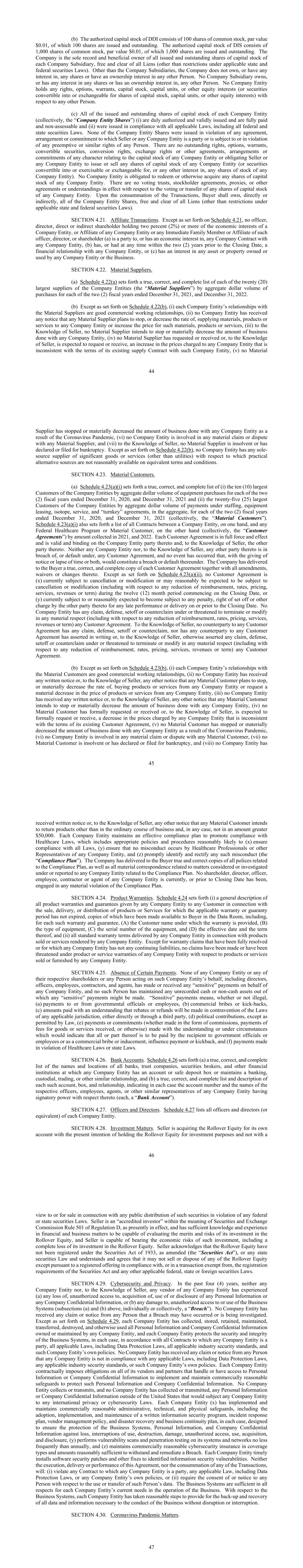 44 (b) The authorized capital stock of DDI consists of 100 shares of common stock, par value $0.01, of which 100 shares are issued and outstanding. The authorized capital stock of DIS consists of 1,000 shares of common stock, par value $0.01, of which 1,000 shares are issued and outstanding. The Company is the sole record and beneficial owner of all issued and outstanding shares of capital stock of each Company Subsidiary, free and clear of all Liens (other than restrictions under applicable state and federal securities Laws). Other than the Company Subsidiaries, the Company does not own, or have any interest in, any shares or have an ownership interest in any other Person. No Company Subsidiary owns, or has any interest in any shares or has an ownership interest in, any other Person. No Company Entity holds any rights, options, warrants, capital stock, capital units, or other equity interests (or securities convertible into or exchangeable for shares of capital stock, capital units, or other equity interests) with respect to any other Person. (c) All of the issued and outstanding shares of capital stock of each Company Entity (collectively, the “Company Entity Shares”) (i) are duly authorized and validly issued and are fully paid and non-assessable and (ii) were issued in compliance with all applicable Laws, including all federal and state securities Laws. None of the Company Entity Shares were issued in violation of any agreement, arrangement or commitment to which Seller or any Company Entity is a party or is subject to or in violation of any preemptive or similar rights of any Person. There are no outstanding rights, options, warrants, convertible securities, conversion rights, exchange rights or other agreements, arrangements or commitments of any character relating to the capital stock of any Company Entity or obligating Seller or any Company Entity to issue or sell any shares of capital stock of any Company Entity (or securities convertible into or exercisable or exchangeable for, or any other interest in, any shares of stock of any Company Entity). No Company Entity is obligated to redeem or otherwise acquire any shares of capital stock of any Company Entity. There are no voting trusts, stockholder agreements, proxies, or other agreements or understandings in effect with respect to the voting or transfer of any shares of capital stock of any Company Entity. Upon the consummation of the Transactions, Buyer shall own, directly or indirectly, all of the Company Entity Shares, free and clear of all Liens (other than restrictions under applicable state and federal securities Laws). SECTION 4.21. Affiliate Transactions. Except as set forth on Schedule 4.21, no officer, director, direct or indirect shareholder holding two percent (2%) or more of the economic interests of a Company Entity, or Affiliate of any Company Entity or any Immediate Family Member or Affiliate of such officer, director, or shareholder (a) is a party to, or has an economic interest in, any Company Contract with any Company Entity, (b) has, or had at any time within the two (2) years prior to the Closing Date, a financial relationship with any Company Entity, or (c) has an interest in any asset or property owned or used by any Company Entity or the Business. SECTION 4.22. Material Suppliers. (a) Schedule 4.22(a) sets forth a true, correct, and complete list of each of the twenty (20) largest suppliers of the Company Entities (the “Material Suppliers”) by aggregate dollar volume of purchases for each of the two (2) fiscal years ended December 31, 2021, and December 31, 2022. (b) Except as set forth on Schedule 4.22(b), (i) each Company Entity’s relationships with the Material Suppliers are good commercial working relationships, (ii) no Company Entity has received any notice that any Material Supplier plans to stop, or decrease the rate of, supplying materials, products or services to any Company Entity or increase the price for such materials, products or services, (iii) to the Knowledge of Seller, no Material Supplier intends to stop or materially decrease the amount of business done with any Company Entity, (iv) no Material Supplier has requested or received or, to the Knowledge of Seller, is expected to request or receive, an increase in the prices charged to any Company Entity that is inconsistent with the terms of its existing supply Contract with such Company Entity, (v) no Material 45 Supplier has stopped or materially decreased the amount of business done with any Company Entity as a result of the Coronavirus Pandemic, (vi) no Company Entity is involved in any material claim or dispute with any Material Supplier, and (vii) to the Knowledge of Seller, no Material Supplier is insolvent or has declared or filed for bankruptcy. Except as set forth on Schedule 4.22(b), no Company Entity has any sole- source supplier of significant goods or services (other than utilities) with respect to which practical alternative sources are not reasonably available on equivalent terms and conditions. SECTION 4.23. Material Customers. (a) Schedule 4.23(a)(i) sets forth a true, correct, and complete list of (i) the ten (10) largest Customers of the Company Entities by aggregate dollar volume of equipment purchases for each of the two (2) fiscal years ended December 31, 2020, and December 31, 2021 and (ii) the twenty-five (25) largest Customers of the Company Entities by aggregate dollar volume of payments under staffing, equipment leasing, isotope, service, and “turnkey” agreements, in the aggregate, for each of the two (2) fiscal years ended December 31, 2020, and December 31, 2021 (collectively, the “Material Customers”). Schedule 4.23(a)(i) also sets forth a list of all Contracts between a Company Entity, on one hand, and any Federal Healthcare Program or Material Customer, on the other hand (collectively, the “Customer Agreements”) by amount collected in 2021, and 2022. Each Customer Agreement is in full 
