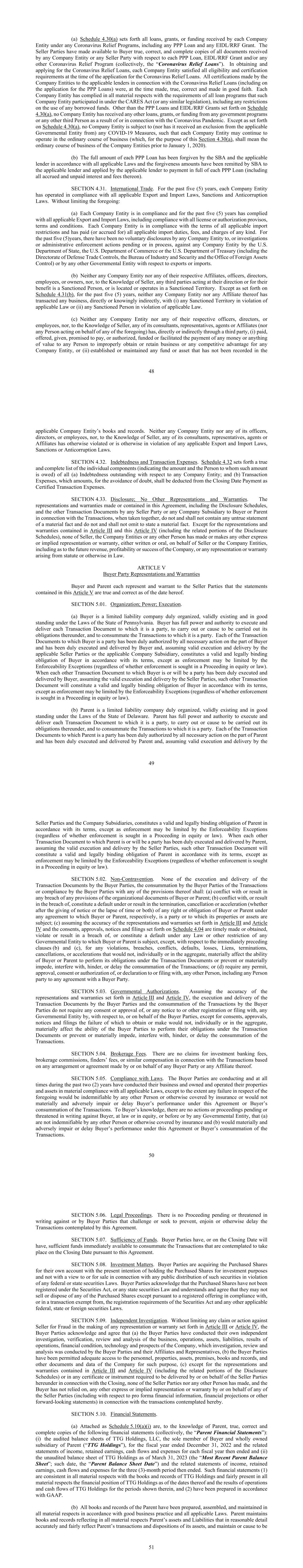 48 (a) Schedule 4.30(a) sets forth all loans, grants, or funding received by each Company Entity under any Coronavirus Relief Programs, including any PPP Loan and any EIDL/RRF Grant. The Seller Parties have made available to Buyer true, correct, and complete copies of all documents received by any Company Entity or any Seller Party with respect to each PPP Loan, EIDL/RRF Grant and/or any other Coronavirus Relief Program (collectively, the “Coronavirus Relief Loans”). In obtaining and applying for the Coronavirus Relief Loans, each Company Entity satisfied all eligibility and certification requirements at the time of the application for the Coronavirus Relief Loans. All certifications made by the Company Entities to the applicable lenders in connection with the Coronavirus Relief Loans (including on the application for the PPP Loans) were, at the time made, true, correct and made in good faith. Each Company Entity has complied in all material respects with the requirements of all loan programs that such Company Entity participated in under the CARES Act (or any similar legislation), including any restrictions on the use of any borrowed funds. Other than the PPP Loans and EIDL/RRF Grants set forth on Schedule 4.30(a), no Company Entity has received any other loans, grants, or funding from any government programs or any other third Person as a result of or in connection with the Coronavirus Pandemic. Except as set forth on Schedule 4.30(a), no Company Entity is subject to (nor has it received an exclusion from the applicable Governmental Entity from) any COVID-19 Measures, such that each Company Entity may continue to operate in the ordinary course of business (which, for the purpose of this Section 4.30(a), shall mean the ordinary course of business of the Company Entities prior to January 1, 2020). (b) The full amount of each PPP Loan has been forgiven by the SBA and the applicable lender in accordance with all applicable Laws and the forgiveness amounts have been remitted by SBA to the applicable lender and applied by the applicable lender to payment in full of each PPP Loan (including all accrued and unpaid interest and fees thereon). SECTION 4.31. International Trade. For the past five (5) years, each Company Entity has operated in compliance with all applicable Export and Import Laws, Sanctions and Anticorruption Laws. Without limiting the foregoing: (a) Each Company Entity is in compliance and for the past five (5) years has complied with all applicable Export and Import Laws, including compliance with all license or authorization provisos, terms and conditions. Each Company Entity is in compliance with the terms of all applicable import restrictions and has paid (or accrued for) all applicable import duties, fees, and charges of any kind. For the past five (5)years, there have been no voluntary disclosures by any Company Entity to, or investigations or administrative enforcement actions pending or in process, against any Company Entity by the U.S. Department of State, the U.S. Department of Commerce or the U.S. Department of Treasury (including the Directorate of Defense Trade Controls, the Bureau of Industry and Security and the Office of Foreign Assets Control) or by any other Governmental Entity with respect to exports or imports. (b) Neither any Company Entity nor any of their respective Affiliates, officers, directors, employees, or owners, nor, to the Knowledge of Seller, any third parties acting at their direction or for their benefit is a Sanctioned Person, or is located or operates in a Sanctioned Territory. Except as set forth on Schedule 4.31(b), for the past five (5) years, neither any Company Entity nor any Affiliate thereof has transacted any business, directly or knowingly indirectly, with (i) any Sanctioned Territory in violation of applicable Law or (ii) any Sanctioned Person in violation of applicable Law. (c) Neither any Company Entity nor any of their respective officers, directors, or employees, nor, to the Knowledge of Seller, any of its consultants, representatives, agents or Affiliates (nor any Person acting on behalf of any of the foregoing) has, directly or indirectly through a third party, (i) paid, offered, given, promised to pay, or authorized, funded or facilitated the payment of any money or anything of value to any Person to improperly obtain or retain business or any competitive advantage for any Company Entity, or (ii) established or maintained any fund or asset that has not been recorded in the 49 applicable Company Entity’s books and records. Neither any Company Entity nor any of its officers, directors, or employees, nor, to the Knowledge of Seller, any of its consultants, representatives, agents or Affiliates has otherwise violated or is otherwise in violation of any applicable Export and Import Laws, Sanctions or Anticorruption Laws. SECTION 4.32. Indebtedness and Transaction Expenses. Schedule 4.32 sets forth a true and complete list of the individual components (indicating the amount and the Person to whom such amount is owed) of all (a) Indebtedness outstanding with respect to any Company Entity; and (b) Transaction Expenses, which amounts, for the avoidance of doubt, shall be deducted from the Closing Date Payment as Certified Transaction Expenses. SECTION 4.33. Disclosure; No Other Representations and Warranties. The representations and warranties made or contained in this Agreement, including the Disclosure Schedules, and the other Transaction Documents by any Seller Party or any Company Subsidiary to Buyer or Parent in connection with the Transactions, when taken together, do not and shall not contain any untrue statement of a material fact and do not and shall not omit to state a material fact. Except for the representations and warranties contained in Article III and this Article IV (including the related portions of the Disclosure Schedules), none of Seller, the Company Entities or any other Person has made or makes any other ex