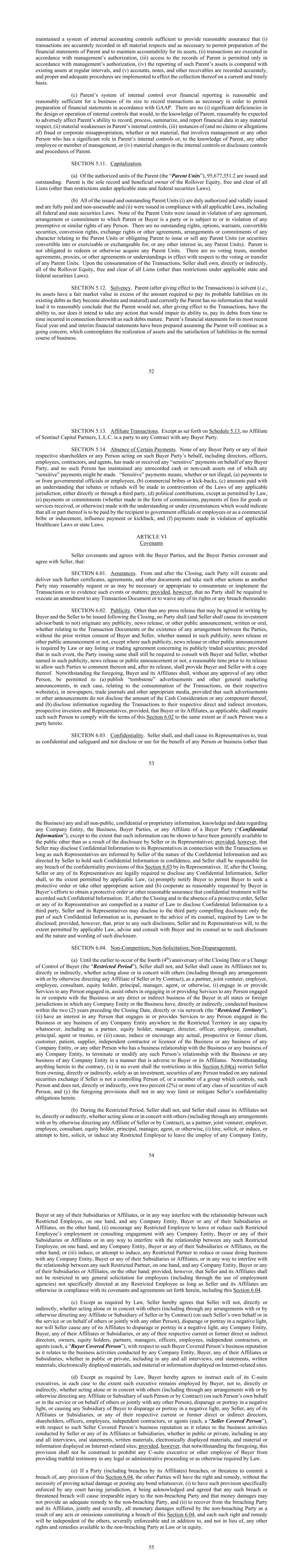 52 maintained a system of internal accounting controls sufficient to provide reasonable assurance that (i) transactions are accurately recorded in all material respects and as necessary to permit preparation of the financial statements of Parent and to maintain accountability for its assets, (ii) transactions are executed in accordance with management’s authorization, (iii) access to the records of Parent is permitted only in accordance with management’s authorization, (iv) the reporting of such Parent’s assets is compared with existing assets at regular intervals, and (v) accounts, notes, and other receivables are recorded accurately, and proper and adequate procedures are implemented to effect the collection thereof on a current and timely basis. (c) Parent’s system of internal control over financial reporting is reasonable and reasonably sufficient for a business of its size to record transactions as necessary in order to permit preparation of financial statements in accordance with GAAP. There are no (i) significant deficiencies in the design or operation of internal controls that would, to the knowledge of Parent, reasonably be expected to adversely affect Parent’s ability to record, process, summarize, and report financial data in any material respect, (ii) material weaknesses in Parent’s internal controls, (iii) instances of (and no claims or allegations of) fraud or corporate misappropriation, whether or not material, that involves management or any other Person who has a significant role in Parent’s internal controls or, to the knowledge of Parent, any other employee or member of management, or (iv) material changes in the internal controls or disclosure controls and procedures of Parent. SECTION 5.11. Capitalization. (a) Of the authorized units of the Parent (the “Parent Units”), 95,677,351.2 are issued and outstanding. Parent is the sole record and beneficial owner of the Rollover Equity, free and clear of all Liens (other than restrictions under applicable state and federal securities Laws). (b) All of the issued and outstanding Parent Units (i) are duly authorized and validly issued and are fully paid and non-assessable and (ii) were issued in compliance with all applicable Laws, including all federal and state securities Laws. None of the Parent Units were issued in violation of any agreement, arrangement or commitment to which Parent or Buyer is a party or is subject to or in violation of any preemptive or similar rights of any Person. There are no outstanding rights, options, warrants, convertible securities, conversion rights, exchange rights or other agreements, arrangements or commitments of any character relating to the Parent Units or obligating Parent to issue or sell any Parent Units (or securities convertible into or exercisable or exchangeable for, or any other interest in, any Parent Units). Parent is not obligated to redeem or otherwise acquire any Parent Units. There are no voting trusts, member agreements, proxies, or other agreements or understandings in effect with respect to the voting or transfer of any Parent Units. Upon the consummation of the Transactions, Seller shall own, directly or indirectly, all of the Rollover Equity, free and clear of all Liens (other than restrictions under applicable state and federal securities Laws). SECTION 5.12. Solvency. Parent (after giving effect to the Transactions) is solvent (i.e., its assets have a fair market value in excess of the amount required to pay its probable liabilities on its existing debts as they become absolute and matured) and currently the Parent has no information that would lead it to reasonably conclude that the Parent would not, after giving effect to the Transactions, have the ability to, nor does it intend to take any action that would impair its ability to, pay its debts from time to time incurred in connection therewith as such debts mature. Parent’s financial statements for its most recent fiscal year end and interim financial statements have been prepared assuming the Parent will continue as a going concern, which contemplates the realization of assets and the satisfaction of liabilities in the normal course of business. 53 SECTION 5.13. Affiliate Transactions. Except as set forth on Schedule 5.13, no Affiliate of Sentinel Capital Partners, L.L.C. is a party to any Contract with any Buyer Party. SECTION 5.14. Absence of Certain Payments. None of any Buyer Party or any of their respective shareholders or any Person acting on such Buyer Party’s behalf, including directors, officers, employees, contractors, and agents, has made or received any “sensitive” payments on behalf of any Buyer Party, and no such Person has maintained any unrecorded cash or non-cash assets out of which any “sensitive” payments might be made. “Sensitive” payments means, whether or not illegal, (a) payments to or from governmental officials or employees, (b) commercial bribes or kick-backs, (c) amounts paid with an understanding that rebates or refunds will be made in contravention of the Laws of any applicable jurisdiction, either directly or through a third party, (d) political contributions, except as permitted by Law, (e) payments or commitments (whether made in the form of commissions, payments of fees for goods or services received, or otherwise) made with the understanding or under circumstances which would indicate that all or part thereof is to be paid by the recipient to government officials or employees or as a commercial bribe or inducement, influence payment or kickback, and (f) payments made in violation of applicable Healthcare Laws or state Laws. ARTICLE VI Covenants Seller covenants and agrees with the Buyer Parties, and the Buyer Parties covenant and agree with Seller, that: SECTION 6.01. Assurances. From and after the Closing, each Party will execute and deliver such further certificates, agreements, and other documents and take such other actions as another Party ma