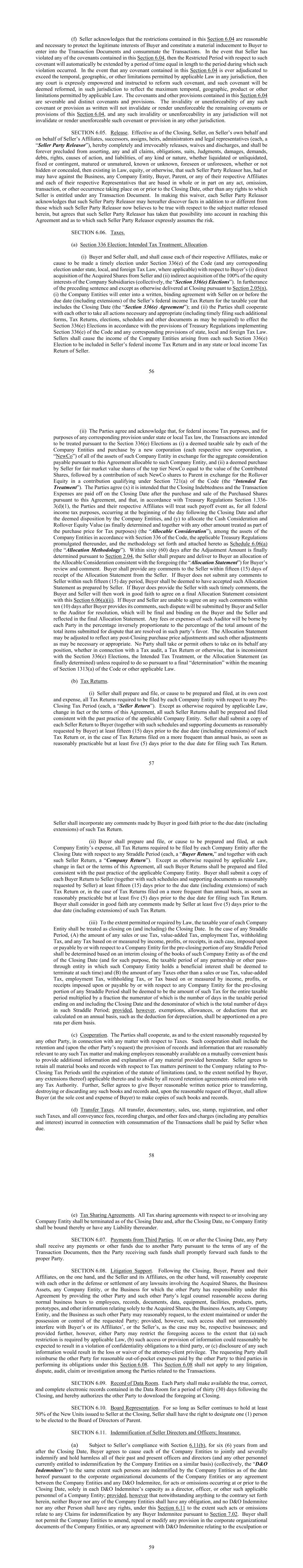 56 (f) Seller acknowledges that the restrictions contained in this Section 6.04 are reasonable and necessary to protect the legitimate interests of Buyer and constitute a material inducement to Buyer to enter into the Transaction Documents and consummate the Transactions. In the event that Seller has violated any of the covenants contained in this Section 6.04, then the Restricted Period with respect to such covenant will automatically be extended by a period of time equal in length to the period during which such violation occurred. In the event that any covenant contained in this Section 6.04 is ever adjudicated to exceed the temporal, geographic, or other limitations permitted by applicable Law in any jurisdiction, then any court is expressly empowered and instructed to reform such covenant, and such covenant will be deemed reformed, in such jurisdiction to reflect the maximum temporal, geographic, product or other limitations permitted by applicable Law. The covenants and other provisions contained in this Section 6.04 are severable and distinct covenants and provisions. The invalidity or unenforceability of any such covenant or provision as written will not invalidate or render unenforceable the remaining covenants or provisions of this Section 6.04, and any such invalidity or unenforceability in any jurisdiction will not invalidate or render unenforceable such covenant or provision in any other jurisdiction. SECTION 6.05. Release. Effective as of the Closing, Seller, on Seller’s own behalf and on behalf of Seller’s Affiliates, successors, assigns, heirs, administrators and legal representatives (each, a “Seller Party Releasor”), hereby completely and irrevocably releases, waives and discharges, and shall be forever precluded from asserting, any and all claims, obligations, suits, Judgments, damages, demands, debts, rights, causes of action, and liabilities, of any kind or nature, whether liquidated or unliquidated, fixed or contingent, matured or unmatured, known or unknown, foreseen or unforeseen, whether or not hidden or concealed, then existing in Law, equity, or otherwise, that such Seller Party Releasor has, had or may have against the Business, any Company Entity, Buyer, Parent, or any of their respective Affiliates and each of their respective Representatives that are based in whole or in part on any act, omission, transaction, or other occurrence taking place on or prior to the Closing Date, other than any rights to which Seller is entitled under any Transaction Document. In making this waiver, each Seller Party Releasor acknowledges that such Seller Party Releasor may hereafter discover facts in addition to or different from those which such Seller Party Releasor now believes to be true with respect to the subject matter released herein, but agrees that such Seller Party Releasor has taken that possibility into account in reaching this Agreement and as to which such Seller Party Releasor expressly assumes the risk. SECTION 6.06. Taxes. (a) Section 336 Election; Intended Tax Treatment; Allocation. (i) Buyer and Seller shall, and shall cause each of their respective Affiliates, make or cause to be made a timely election under Section 336(e) of the Code (and any corresponding election under state, local, and foreign Tax Law, where applicable) with respect to Buyer’s (i) direct acquisition of the Acquired Shares from Seller and (ii) indirect acquisition of the 100% of the equity interests of the Company Subsidiaries (collectively, the “Section 336(e) Elections”). In furtherance of the preceding sentence and except as otherwise delivered at Closing pursuant to Section 2.05(n), (i) the Company Entities will enter into a written, binding agreement with Seller on or before the due date (including extensions) of the Seller’s federal income Tax Return for the taxable year that includes the Closing Date (the “Section 336(e) Agreement”); and (ii) the Parties shall cooperate with each other to take all actions necessary and appropriate (including timely filing such additional forms, Tax Returns, elections, schedules and other documents as may be required) to effect the Section 336(e) Elections in accordance with the provisions of Treasury Regulations implementing Section 336(e) of the Code and any corresponding provisions of state, local and foreign Tax Law. Sellers shall cause the income of the Company Entities arising from each such Section 336(e) Election to be included in Seller’s federal income Tax Return and in any state or local income Tax Return of Seller. 57 (ii) The Parties agree and acknowledge that, for federal income Tax purposes, and for purposes of any corresponding provision under state or local Tax law, the Transactions are intended to be treated pursuant to the Section 336(e) Elections as (i) a deemed taxable sale by each of the Company Entities and purchase by a new corporation (each respective new corporation, a “NewCo”) of all of the assets of such Company Entity in exchange for the aggregate consideration payable pursuant to this Agreement allocable to such Company Entity, and (ii) a deemed purchase by Seller for fair market value shares of the top tier NewCo equal to the value of the Contributed Shares, followed by a contribution of such NewCo shares to Parent in exchange for the Rollover Equity in a contribution qualifying under Section 721(a) of the Code (the “Intended Tax Treatment”). The Parties agree (x) it is intended that the Closing Indebtedness and the Transaction Expenses are paid off on the Closing Date after the purchase and sale of the Purchased Shares pursuant to this Agreement, and that, in accordance with Treasury Regulations Section 1.336- 3(d)(1), the Parties and their respective Affiliates will treat such payoff event as, for all federal income tax purposes, occurring at the beginning of the day following the Closing Date and after the deemed disposition by the Company Entities, and (y) to allocate the Cash Conside