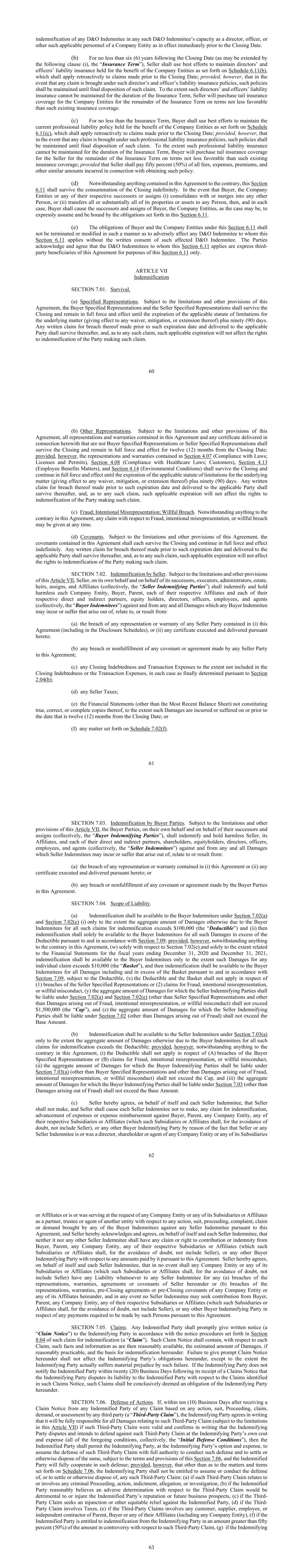 60 indemnification of any D&O Indemnitee in any such D&O Indemnitee’s capacity as a director, officer, or other such applicable personnel of a Company Entity as in effect immediately prior to the Closing Date. (b) For no less than six (6) years following the Closing Date (as may be extended by the following clause (i), the “Insurance Term”), Seller shall use best efforts to maintain directors’ and officers’ liability insurance held for the benefit of the Company Entities as set forth on Schedule 6.11(b), which shall apply retroactively to claims made prior to the Closing Date; provided, however, that in the event that any claim is brought under such director’s and officer’s liability insurance policies, such policies shall be maintained until final disposition of such claim. To the extent such directors’ and officers’ liability insurance cannot be maintained for the duration of the Insurance Term, Seller will purchase tail insurance coverage for the Company Entities for the remainder of the Insurance Term on terms not less favorable than such existing insurance coverage. (c) For no less than the Insurance Term, Buyer shall use best efforts to maintain the current professional liability policy held for the benefit of the Company Entities as set forth on Schedule 6.11(c), which shall apply retroactively to claims made prior to the Closing Date; provided, however, that in the event that any claim is brought under such professional liability insurance policies, such policies shall be maintained until final disposition of such claim. To the extent such professional liability insurance cannot be maintained for the duration of the Insurance Term, Buyer will purchase tail insurance coverage for the Seller for the remainder of the Insurance Term on terms not less favorable than such existing insurance coverage; provided that Seller shall pay fifty percent (50%) of all fees, expenses, premiums, and other similar amounts incurred in connection with obtaining such policy. (d) Notwithstanding anything contained in this Agreement to the contrary, this Section 6.11 shall survive the consummation of the Closing indefinitely. In the event that Buyer, the Company Entities or any of their respective successors or assigns (i) consolidates with or merges into any other Person, or (ii) transfers all or substantially all of its properties or assets to any Person, then, and in each case, Buyer shall cause the successors and assigns of Buyer, the Company Entities, as the case may be, to expressly assume and be bound by the obligations set forth in this Section 6.11. (e) The obligations of Buyer and the Company Entities under this Section 6.11 shall not be terminated or modified in such a manner as to adversely affect any D&O Indemnitee to whom this Section 6.11 applies without the written consent of such affected D&O Indemnitee. The Parties acknowledge and agree that the D&O Indemnitees to whom this Section 6.11 applies are express third- party beneficiaries of this Agreement for purposes of this Section 6.11 only. ARTICLE VII Indemnification SECTION 7.01. Survival. (a) Specified Representations. Subject to the limitations and other provisions of this Agreement, the Buyer Specified Representations and the Seller Specified Representations shall survive the Closing and remain in full force and effect until the expiration of the applicable statute of limitations for the underlying matter (giving effect to any waiver, mitigation, or extension thereof) plus ninety (90) days. Any written claim for breach thereof made prior to such expiration date and delivered to the applicable Party shall survive thereafter, and, as to any such claim, such applicable expiration will not affect the rights to indemnification of the Party making such claim. 61 (b) Other Representations. Subject to the limitations and other provisions of this Agreement, all representations and warranties contained in this Agreement and any certificate delivered in connection herewith that are not Buyer Specified Representations or Seller Specified Representations shall survive the Closing and remain in full force and effect for twelve (12) months from the Closing Date; provided, however, the representations and warranties contained in Section 4.07 (Compliance with Laws; Licenses and Permits), Section 4.08 (Compliance with Healthcare Laws; Customers), Section 4.13 (Employee Benefits Matters), and Section 4.14 (Environmental Conditions) shall survive the Closing and continue in full force and effect until the expiration of the applicable statute of limitations for the underlying matter (giving effect to any waiver, mitigation, or extension thereof) plus ninety (90) days. Any written claim for breach thereof made prior to such expiration date and delivered to the applicable Party shall survive thereafter, and, as to any such claim, such applicable expiration will not affect the rights to indemnification of the Party making such claim. (c) Fraud; Intentional Misrepresentation; Willful Breach. Notwithstanding anything to the contrary in this Agreement, any claim with respect to Fraud, intentional misrepresentation, or willful breach may be given at any time. (d) Covenants. Subject to the limitations and other provisions of this Agreement, the covenants contained in this Agreement shall each survive the Closing and continue in full force and effect indefinitely. Any written claim for breach thereof made prior to such expiration date and delivered to the applicable Party shall survive thereafter, and, as to any such claim, such applicable expiration will not affect the rights to indemnification of the Party making such claim. SECTION 7.02. Indemnification by Seller. Subject to the limitations and other provisions of this Article VII, Seller, on its own behalf and on behalf of its successors, executors, administrators, estate, heirs, assigns, and Affiliates (collectively, the “Seller Indemnifying Parties”) shall indemnify and hold harmless 