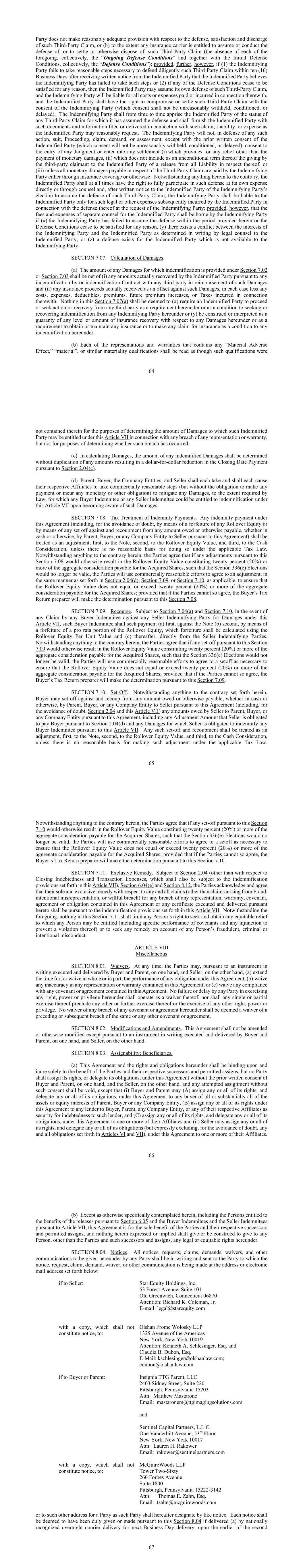 64 Party does not make reasonably adequate provision with respect to the defense, satisfaction and discharge of such Third-Party Claim, or (h) to the extent any insurance carrier is entitled to assume or conduct the defense of, or to settle or otherwise dispose of, such Third-Party Claim (the absence of each of the foregoing, collectively, the “Ongoing Defense Conditions” and together with the Initial Defense Conditions, collectively, the “Defense Conditions”); provided, further, however, if (1) the Indemnifying Party fails to take reasonable steps necessary to defend diligently such Third-Party Claim within ten (10) Business Days after receiving written notice from the Indemnified Party that the Indemnified Party believes the Indemnifying Party has failed to take such steps or (2) if any of the Defense Conditions cease to be satisfied for any reason, then the Indemnified Party may assume its own defense of such Third-Party Claim, and the Indemnifying Party will be liable for all costs or expenses paid or incurred in connection therewith, and the Indemnified Party shall have the right to compromise or settle such Third-Party Claim with the consent of the Indemnifying Party (which consent shall not be unreasonably withheld, conditioned, or delayed). The Indemnifying Party shall from time to time apprise the Indemnified Party of the status of any Third-Party Claim for which it has assumed the defense and shall furnish the Indemnified Party with such documents and information filed or delivered in connection with such claim, Liability, or expense as the Indemnified Party may reasonably request. The Indemnifying Party will not, in defense of any such action, suit, Proceeding, claim, demand, or assessment, except with the prior written consent of the Indemnified Party (which consent will not be unreasonably withheld, conditioned, or delayed), consent to the entry of any Judgment or enter into any settlement (i) which provides for any relief other than the payment of monetary damages, (ii) which does not include as an unconditional term thereof the giving by the third-party claimant to the Indemnified Party of a release from all Liability in respect thereof, or (iii) unless all monetary damages payable in respect of the Third-Party Claim are paid by the Indemnifying Party either through insurance coverage or otherwise. Notwithstanding anything herein to the contrary, the Indemnified Party shall at all times have the right to fully participate in such defense at its own expense directly or through counsel and, after written notice to the Indemnified Party of the Indemnifying Party’s election to assume the defense of such Third-Party Claim, the Indemnifying Party shall be liable to the Indemnified Party only for such legal or other expenses subsequently incurred by the Indemnified Party in connection with the defense thereof at the request of the Indemnifying Party; provided, however, that the fees and expenses of separate counsel for the Indemnified Party shall be borne by the Indemnifying Party if (x) the Indemnifying Party has failed to assume the defense within the period provided herein or the Defense Conditions cease to be satisfied for any reason, (y) there exists a conflict between the interests of the Indemnifying Party and the Indemnified Party as determined in writing by legal counsel to the Indemnified Party, or (z) a defense exists for the Indemnified Party which is not available to the Indemnifying Party. SECTION 7.07. Calculation of Damages. (a) The amount of any Damages for which indemnification is provided under Section 7.02 or Section 7.03 shall be net of (i) any amounts actually recovered by the Indemnified Party pursuant to any indemnification by or indemnification Contract with any third party in reimbursement of such Damages and (ii) any insurance proceeds actually received as an offset against such Damages, in each case less any costs, expenses, deductibles, premiums, future premium increases, or Taxes incurred in connection therewith. Nothing in this Section 7.07(a) shall be deemed to (x) require an Indemnified Party to proceed or seek action or recovery from any third party as a requirement hereunder or as a condition to seeking or recovering indemnification from any Indemnifying Party hereunder or (y) be construed or interpreted as a guaranty of any level or amount of insurance recovery with respect to any Damages hereunder or as a requirement to obtain or maintain any insurance or to make any claim for insurance as a condition to any indemnification hereunder. (b) Each of the representations and warranties that contains any “Material Adverse Effect,” “material”, or similar materiality qualifications shall be read as though such qualifications were 65 not contained therein for the purposes of determining the amount of Damages to which such Indemnified Party may be entitled under this Article VII in connection with any breach of any representation or warranty, but not for purposes of determining whether such breach has occurred. (c) In calculating Damages, the amount of any indemnified Damages shall be determined without duplication of any amounts resulting in a dollar-for-dollar reduction in the Closing Date Payment pursuant to Section 2.04(c). (d) Parent, Buyer, the Company Entities, and Seller shall each take and shall each cause their respective Affiliates to take commercially reasonable steps (but without the obligation to make any payment or incur any monetary or other obligation) to mitigate any Damages, to the extent required by Law, for which any Buyer Indemnitee or any Seller Indemnitee could be entitled to indemnification under this Article VII upon becoming aware of such Damages. SECTION 7.08. Tax Treatment of Indemnity Payments. Any indemnity payment under this Agreement (including, for the avoidance of doubt, by means of a forfeiture of any Rollover Equity or by means of any set off against and recoupment from any amount owed or otherwise 