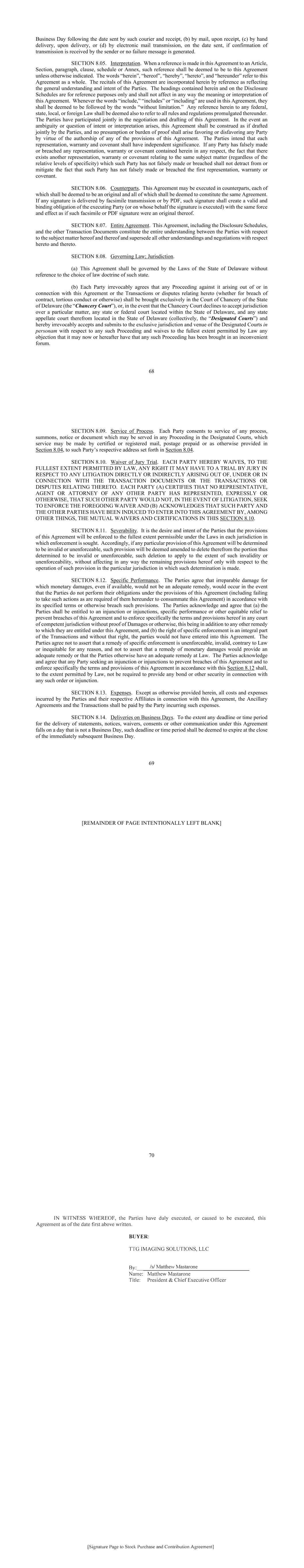 68 Business Day following the date sent by such courier and receipt, (b) by mail, upon receipt, (c) by hand delivery, upon delivery, or (d) by electronic mail transmission, on the date sent, if confirmation of transmission is received by the sender or no failure message is generated. SECTION 8.05. Interpretation. When a reference is made in this Agreement to an Article, Section, paragraph, clause, schedule or Annex, such reference shall be deemed to be to this Agreement unless otherwise indicated. The words “herein”, “hereof”, “hereby”, “hereto”, and “hereunder” refer to this Agreement as a whole. The recitals of this Agreement are incorporated herein by reference as reflecting the general understanding and intent of the Parties. The headings contained herein and on the Disclosure Schedules are for reference purposes only and shall not affect in any way the meaning or interpretation of this Agreement. Whenever the words “include,” “includes” or “including” are used in this Agreement, they shall be deemed to be followed by the words “without limitation.” Any reference herein to any federal, state, local, or foreign Law shall be deemed also to refer to all rules and regulations promulgated thereunder. The Parties have participated jointly in the negotiation and drafting of this Agreement. In the event an ambiguity or question of intent or interpretation arises, this Agreement shall be construed as if drafted jointly by the Parties, and no presumption or burden of proof shall arise favoring or disfavoring any Party by virtue of the authorship of any of the provisions of this Agreement. The Parties intend that each representation, warranty and covenant shall have independent significance. If any Party has falsely made or breached any representation, warranty or covenant contained herein in any respect, the fact that there exists another representation, warranty or covenant relating to the same subject matter (regardless of the relative levels of specificity) which such Party has not falsely made or breached shall not detract from or mitigate the fact that such Party has not falsely made or breached the first representation, warranty or covenant. SECTION 8.06. Counterparts. This Agreement may be executed in counterparts, each of which shall be deemed to be an original and all of which shall be deemed to constitute the same Agreement. If any signature is delivered by facsimile transmission or by PDF, such signature shall create a valid and binding obligation of the executing Party (or on whose behalf the signature is executed) with the same force and effect as if such facsimile or PDF signature were an original thereof. SECTION 8.07. Entire Agreement. This Agreement, including the Disclosure Schedules, and the other Transaction Documents constitute the entire understanding between the Parties with respect to the subject matter hereof and thereof and supersede all other understandings and negotiations with respect hereto and thereto. SECTION 8.08. Governing Law; Jurisdiction. (a) This Agreement shall be governed by the Laws of the State of Delaware without reference to the choice of law doctrine of such state. (b) Each Party irrevocably agrees that any Proceeding against it arising out of or in connection with this Agreement or the Transactions or disputes relating hereto (whether for breach of contract, tortious conduct or otherwise) shall be brought exclusively in the Court of Chancery of the State of Delaware (the “Chancery Court”), or, in the event that the Chancery Court declines to accept jurisdiction over a particular matter, any state or federal court located within the State of Delaware, and any state appellate court therefrom located in the State of Delaware (collectively, the “Designated Courts”) and hereby irrevocably accepts and submits to the exclusive jurisdiction and venue of the Designated Courts in personam with respect to any such Proceeding and waives to the fullest extent permitted by Law any objection that it may now or hereafter have that any such Proceeding has been brought in an inconvenient forum. 69 SECTION 8.09. Service of Process. Each Party consents to service of any process, summons, notice or document which may be served in any Proceeding in the Designated Courts, which service may be made by certified or registered mail, postage prepaid or as otherwise provided in Section 8.04, to such Party’s respective address set forth in Section 8.04. SECTION 8.10. Waiver of Jury Trial. EACH PARTY HEREBY WAIVES, TO THE FULLEST EXTENT PERMITTED BY LAW, ANY RIGHT IT MAY HAVE TO A TRIAL BY JURY IN RESPECT TO ANY LITIGATION DIRECTLY OR INDIRECTLY ARISING OUT OF, UNDER OR IN CONNECTION WITH THE TRANSACTION DOCUMENTS OR THE TRANSACTIONS OR DISPUTES RELATING THERETO. EACH PARTY (A) CERTIFIES THAT NO REPRESENTATIVE, AGENT OR ATTORNEY OF ANY OTHER PARTY HAS REPRESENTED, EXPRESSLY OR OTHERWISE, THAT SUCH OTHER PARTY WOULD NOT, IN THE EVENT OF LITIGATION, SEEK TO ENFORCE THE FOREGOING WAIVER AND (B) ACKNOWLEDGES THAT SUCH PARTY AND THE OTHER PARTIES HAVE BEEN INDUCED TO ENTER INTO THIS AGREEMENT BY, AMONG OTHER THINGS, THE MUTUAL WAIVERS AND CERTIFICATIONS IN THIS SECTION 8.10. SECTION 8.11. Severability. It is the desire and intent of the Parties that the provisions of this Agreement will be enforced to the fullest extent permissible under the Laws in each jurisdiction in which enforcement is sought. Accordingly, if any particular provision of this Agreement will be determined to be invalid or unenforceable, such provision will be deemed amended to delete therefrom the portion thus determined to be invalid or unenforceable, such deletion to apply to the extent of such invalidity or unenforceability, without affecting in any way the remaining provisions hereof only with respect to the operation of such provision in the particular jurisdiction in which such determination is made. SECTION 8.12. Specific Performance. The Parties agree that irr