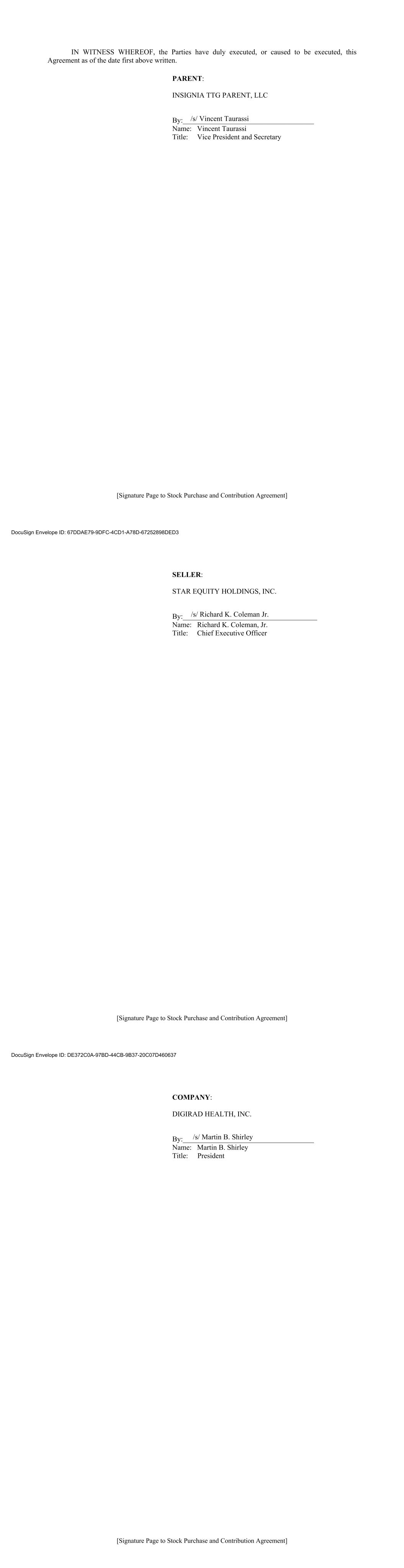 [Signature Page to Stock Purchase and Contribution Agreement] IN WITNESS WHEREOF, the Parties have duly executed, or caused to be executed, this Agreement as of the date first above written. PARENT: INSIGNIA TTG PARENT, LLC By:____________________________________ Name: Vincent Taurassi Title: Vice President and Secretary /s/ Vincent Taurassi [Signature Page to Stock Purchase and Contribution Agreement] SELLER: STAR EQUITY HOLDINGS, INC. By:_____________________________________ Name: Richard K. Coleman, Jr. Title: Chief Executive Officer DocuSign Envelope ID: 67DDAE79-9DFC-4CD1-A78D-67252898DED3 /s/ Richard K. Coleman Jr. [Signature Page to Stock Purchase and Contribution Agreement] COMPANY: DIGIRAD HEALTH, INC. By:____________________________________ Name: Martin B. Shirley Title: President DocuSign Envelope ID: DE372C0A-97BD-44CB-9B37-20C07D460637 /s/ Martin B. Shirley