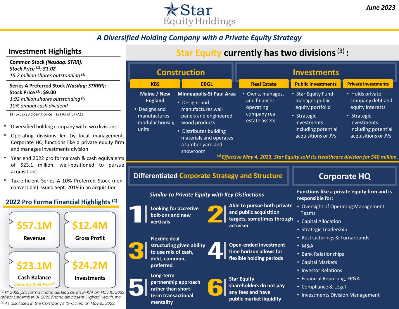 Differentiated Corporate Strategy and Structure Star Equity currently has two divisions (3) : June 2023 A Diversified Holding Company with a Private Equity Strategy • Diversified holding company with two divisions • Operating divisions led by local management. Corporate HQ functions like a private equity firm and manages Investments division • Year end 2022 pro forma cash & cash equivalents of $23.1 million; well-positioned to pursue acquisitions • Tax-efficient Series A 10% Preferred Stock (non- convertible) issued Sept. 2019 in an acquisition Common Stock (Nasdaq: STRR): Stock Price (1): $1.02 15.2 million shares outstanding (2) Series A Preferred Stock (Nasdaq: STRRP): Stock Price (1): $9.00 1.92 million shares outstanding (2) 10% annual cash dividend 2022 Pro Forma Financial Highlights (4) Investment Highlights (1) 5/31/23 closing price (2) As of 5/7/23. $57.1M Revenue $12.4M Gross Profit $23.1M Cash Balance $24.2M Investments Currently Debt Free (5) (4) FY 2022 pro forma financials filed as an 8-K/A on May 10, 2023 reflect December 31, 2022 financials absent Digirad Health, Inc. (5) As disclosed in the Company’s 10-Q filed on May 15, 2023. Investments Real Estate Public Investments Private Investments • Holds private company debt and equity interests • Strategic investments including potential acquisitions or JVs • Star Equity Fund manages public equity portfolio • Strategic investments including potential acquisitions or JVs • Owns, manages, and finances operating company real estate assets Maine / New England • Designs and manufactures modular housing units (3) Effective May 4, 2023, Star Equity sold its Healthcare division for $40 million. Corporate HQ Functions like a private equity firm and is responsible for: • Oversight of Operating Management Teams • Capital Allocation • Strategic Leadership • Restructurings & Turnarounds • M&A • Bank Relationships • Capital Markets • Investor Relations • Financial Reporting, FP&A • Compliance & Legal • Investments Division Management Construction KBS EBGL Similar to Private Equity with Key Distinctions Star Equity shareholders do not pay any fees and have public market liquidity Long-term partnership approach rather than short- term transactional mentality Able to pursue both private and public acquisition targets, sometimes through activism Open-ended investment time horizon allows for flexible holding periods Looking for accretive bolt-ons and new verticals Flexible deal structuring given ability to use mix of cash, debt, common, preferred Minneapolis-St Paul Area • Designs and manufactures wall panels and engineered wood products • Distributes building materials and operates a lumber yard and showroom