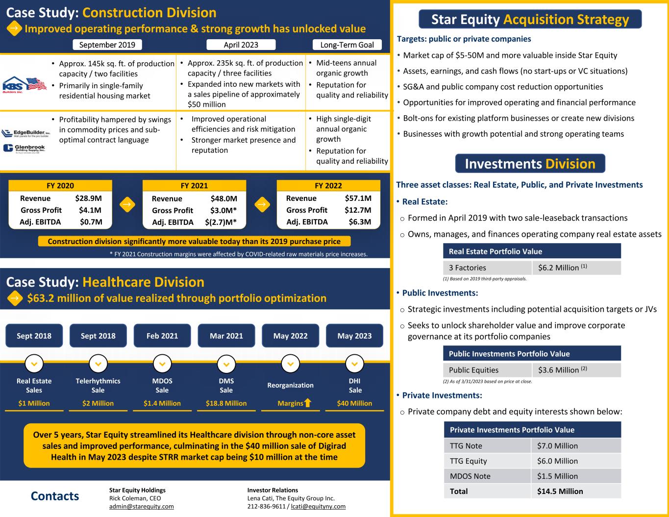 Case Study: Healthcare Division $63.2 million of value realized through portfolio optimization • High single-digit annual organic growth • Reputation for quality and reliability Case Study: Construction Division Improved operating performance & strong growth has unlocked value Star Equity Holdings Rick Coleman, CEO admin@starequity.com Contacts Targets: public or private companies • Market cap of $5-50M and more valuable inside Star Equity • Assets, earnings, and cash flows (no start-ups or VC situations) • SG&A and public company cost reduction opportunities • Opportunities for improved operating and financial performance • Bolt-ons for existing platform businesses or create new divisions • Businesses with growth potential and strong operating teams Three asset classes: Real Estate, Public, and Private Investments • Real Estate: o Formed in April 2019 with two sale-leaseback transactions o Owns, manages, and finances operating company real estate assets • Public Investments: o Strategic investments including potential acquisition targets or JVs o Seeks to unlock shareholder value and improve corporate governance at its portfolio companies • Private Investments: o Private company debt and equity interests shown below: Investor Relations Lena Cati, The Equity Group Inc. 212-836-9611 / lcati@equityny.com Sept 2018 Sept 2018 Feb 2021 Mar 2021 May 2022 May 2023 Real Estate Sales $1 Million Telerhythmics Sale $2 Million MDOS Sale $1.4 Million DMS Sale $18.8 Million Reorganization Margins DHI Sale $40 Million Over 5 years, Star Equity streamlined its Healthcare division through non-core asset sales and improved performance, culminating in the $40 million sale of Digirad Health in May 2023 despite STRR market cap being $10 million at the time Real Estate Portfolio Value 3 Factories $6.2 Million (1) Public Investments Portfolio Value Public Equities $3.6 Million (2) (2) As of 3/31/2023 based on price at close. Private Investments Portfolio Value​ TTG Note​ $7.0 Million​ TTG Equity​ $6.0 Million​ MDOS Note​ $1.5 Million​ Total $14.5 Million September 2019 • Approx. 145k sq. ft. of production capacity / two facilities • Primarily in single-family residential housing market • Approx. 235k sq. ft. of production capacity / three facilities • Expanded into new markets with a sales pipeline of approximately $50 million • Mid-teens annual organic growth • Reputation for quality and reliability April 2023 Long-Term Goal • Profitability hampered by swings in commodity prices and sub- optimal contract language • Improved operational efficiencies and risk mitigation • Stronger market presence and reputation FY 2022 Revenue $57.1M Gross Profit $12.7M Adj. EBITDA $6.3M FY 2021 Revenue $48.0M Gross Profit $3.0M* Adj. EBITDA $(2.7)M* FY 2020 Revenue $28.9M Gross Profit $4.1M Adj. EBITDA $0.7M * FY 2021 Construction margins were affected by COVID-related raw materials price increases. Construction division significantly more valuable today than its 2019 purchase price (1) Based on 2019 third-party appraisals. Star Equity Acquisition Strategy Investments Division
