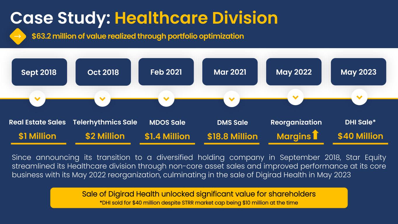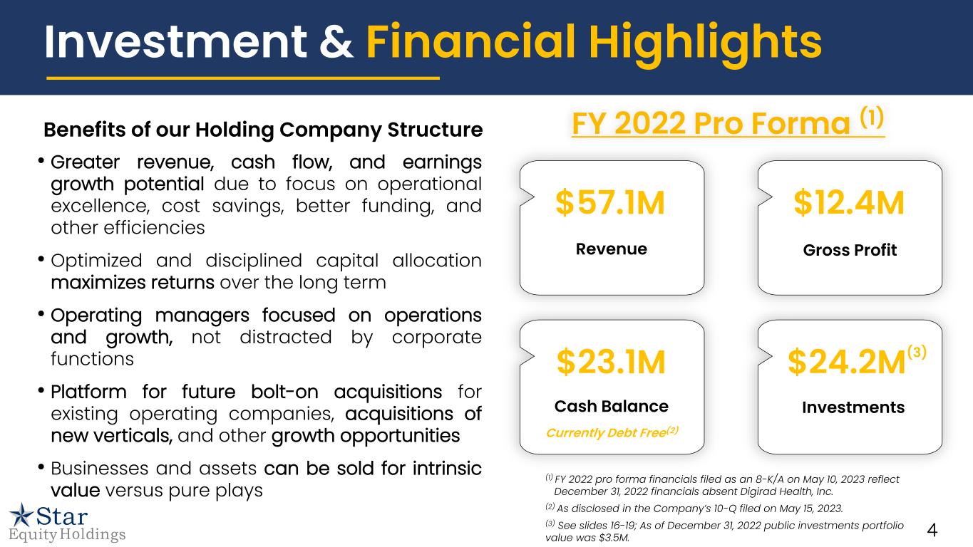 3 About Star Equity Holdings Construction Corporate HQInvestments A Diversified Holding Company with Two Divisions (1) Common Stock (Nasdaq: STRR): Stock Price 2 : $1.02 15.2 million shares outstanding 3 Series A Preferred Stock (Nasdaq: STRRP): Stock Price 2 : $9.00 1.92 million shares outstanding 3 10% annual cash dividend (2) 5/31/23 closing price. (3) As of 5/7/23. KBS EBGL Private InvestmentsPublic InvestmentsReal Estate (1) Effective May 4, 2023, Star Equity sold its Healthcare division for $40 million. See slide 6 for more information. Functions like a private equity firm and is responsible for: • Oversight of Operating Management Teams • Capital Allocation • Strategic Leadership • Restructurings & Turnarounds • M&A • Bank Relationships • Capital Markets • Investor Relations • Financial Reporting, FP&A • Compliance & Legal • Manage Investments Division • Star Equity Fund manages public equity portfolio • Makes strategic investments including potential acquisition targets or JVs • Owns, manages, and finances operating company real estate assets • Holds private company debt and equity interests • Makes strategic investments including potential acquisition targets or JVs Minneapolis-St Paul Area • Designs and manufactures wall panels and engineered wood products for commercial and residential projects • Distributes building materials and operates a lumber yard and showroom Maine / New England • Designs and manufactures modular housing units for commercial and residential projects • Owns, manages, and finances operating company real estate assets