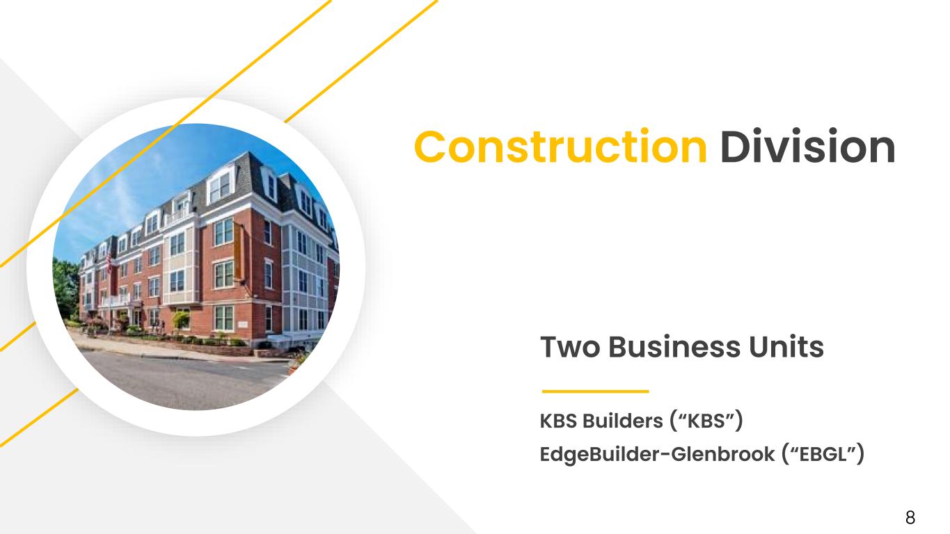 7 Case Study: Construction Division April 2023 Long-Term GoalSeptember 2019 • Approx. 145k sq. ft. of production capacity / two facilities • Approx. 230 modules/year • $55k/module average selling price • Primarily in single-family residential housing market • Approx. 235k sq. ft. of production capacity / three facilities • Approx. 350 modules/year • $90k/module average selling price • Expanded into commercial market, larger projects and multi- family buildings with a sales pipeline of approximately $50 million • Mid-teens annual organic growth • Reputation for quality and reliability • Profitability hampered by swings in commodity prices and sub- optimal contract language • Improved operational efficiencies, commodity price risk mitigation via hedging program, and project risk mitigation via protective contract language • Stronger market presence and reputation • High single-digit annual organic growth • Reputation for quality and reliability Turnaround In Numbers FY 2020 FY 2021 FY 2022 Revenue $28.9M Gross Profit $4.1M Adj. EBITDA $0.7M Revenue $48.0M Gross Profit $3.0M* Adj. EBITDA $(2.7)M* Revenue $57.1M Gross Profit $12.7M Adj. EBITDA $6.3M * FY 2021 Construction margins were affected by COVID-related raw materials price increases. Improved operating performance and strong growth has unlocked value since 2019 purchase Construction division significantly more valuable today than its 2019 purchase price