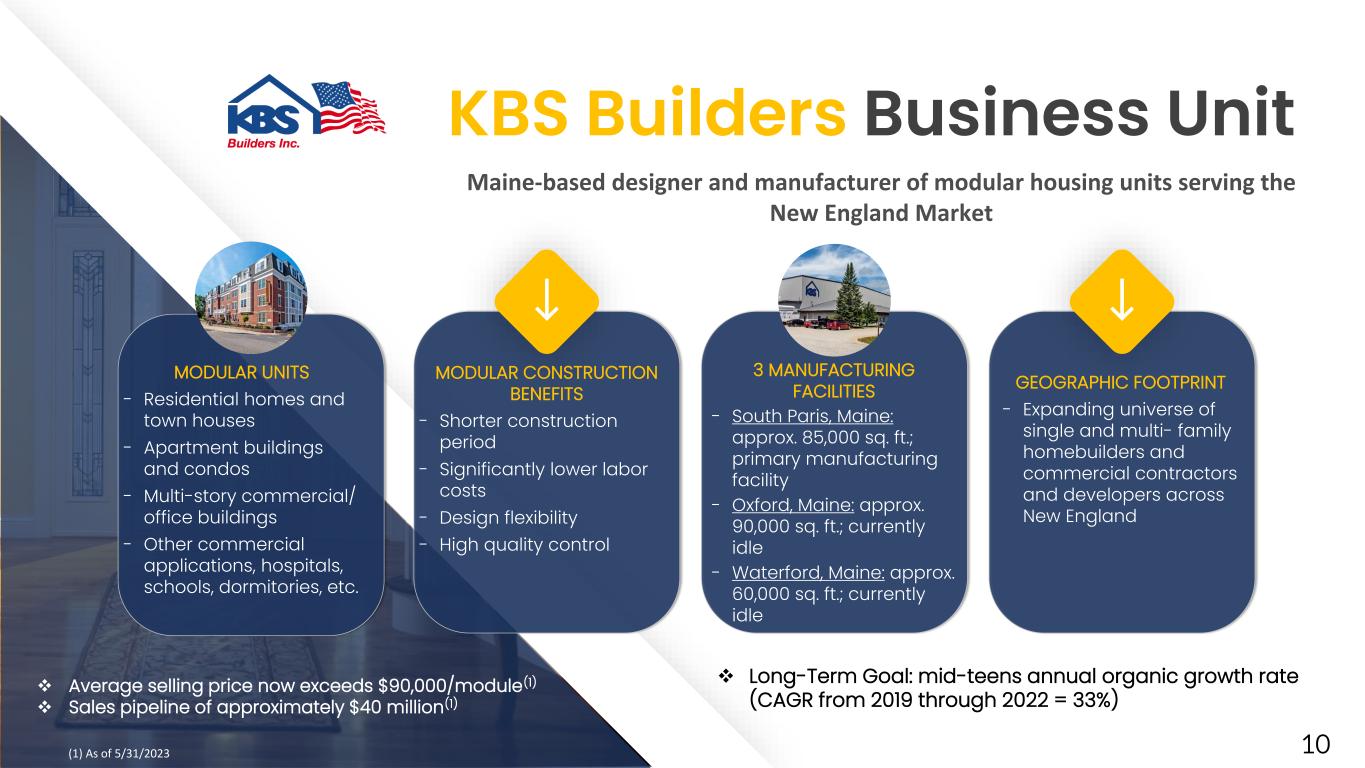 10 KBS Builders Business Unit Maine-based designer and manufacturer of modular housing units serving the New England Market MODULAR CONSTRUCTION BENEFITS - Shorter construction period - Significantly lower labor costs - Design flexibility - High quality control 3 MANUFACTURING FACILITIES - South Paris, Maine: approx. 85,000 sq. ft.; primary manufacturing facility - Oxford, Maine: approx. 90,000 sq. ft.; currently idle - Waterford, Maine: approx. 60,000 sq. ft.; currently idle GEOGRAPHIC FOOTPRINT - Expanding universe of single and multi- family homebuilders and commercial contractors and developers across New England ❖ Average selling price now exceeds $90,000/module(1) ❖ Sales pipeline of approximately $40 million(1) ❖ Long-Term Goal: mid-teens annual organic growth rate (CAGR from 2019 through 2022 = 33%) MODULAR UNITS - Residential homes and town houses - Apartment buildings and condos - Multi-story commercial/ office buildings - Other commercial applications, hospitals, schools, dormitories, etc. (1) As of 5/31/2023