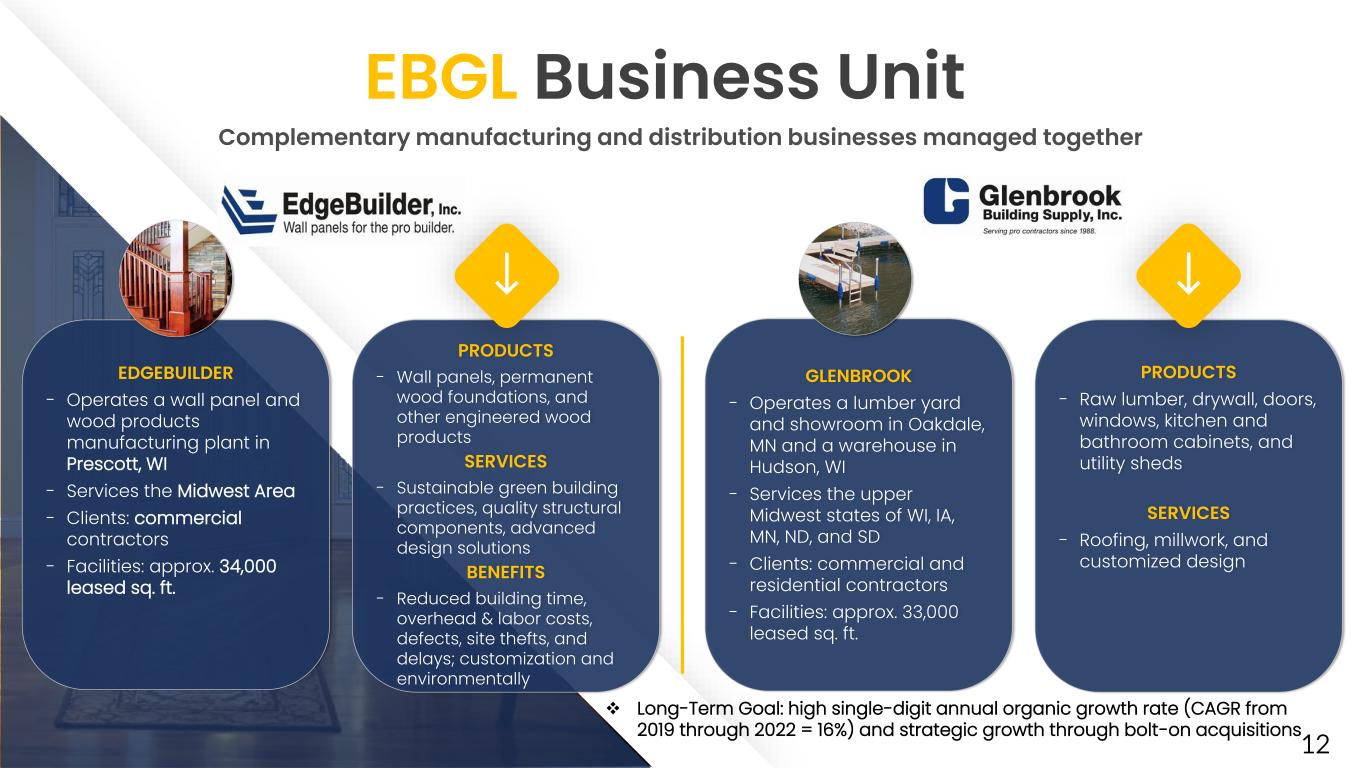 12 EBGL Business Unit Complementary manufacturing and distribution businesses managed together ❖ Long-Term Goal: high single-digit annual organic growth rate (CAGR from 2019 through 2022 = 16%) and strategic growth through bolt-on acquisitions GLENBROOK - Operates a lumber yard and showroom in Oakdale, MN and a warehouse in Hudson, WI - Services the upper Midwest states of WI, IA, MN, ND, and SD - Clients: commercial and residential contractors - Facilities: approx. 33,000 leased sq. ft. EDGEBUILDER - Operates a wall panel and wood products manufacturing plant in Prescott, WI - Services the Midwest Area - Clients: commercial contractors - Facilities: approx. 34,000 leased sq. ft. PRODUCTS - Wall panels, permanent wood foundations, and other engineered wood products SERVICES - Sustainable green building practices, quality structural components, advanced design solutions BENEFITS - Reduced building time, overhead & labor costs, defects, site thefts, and delays; customization and environmentally PRODUCTS - Raw lumber, drywall, doors, windows, kitchen and bathroom cabinets, and utility sheds SERVICES - Roofing, millwork, and customized design