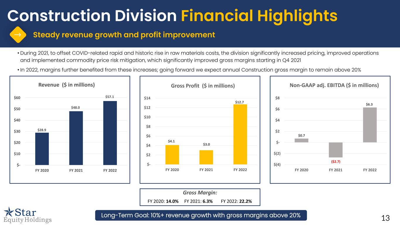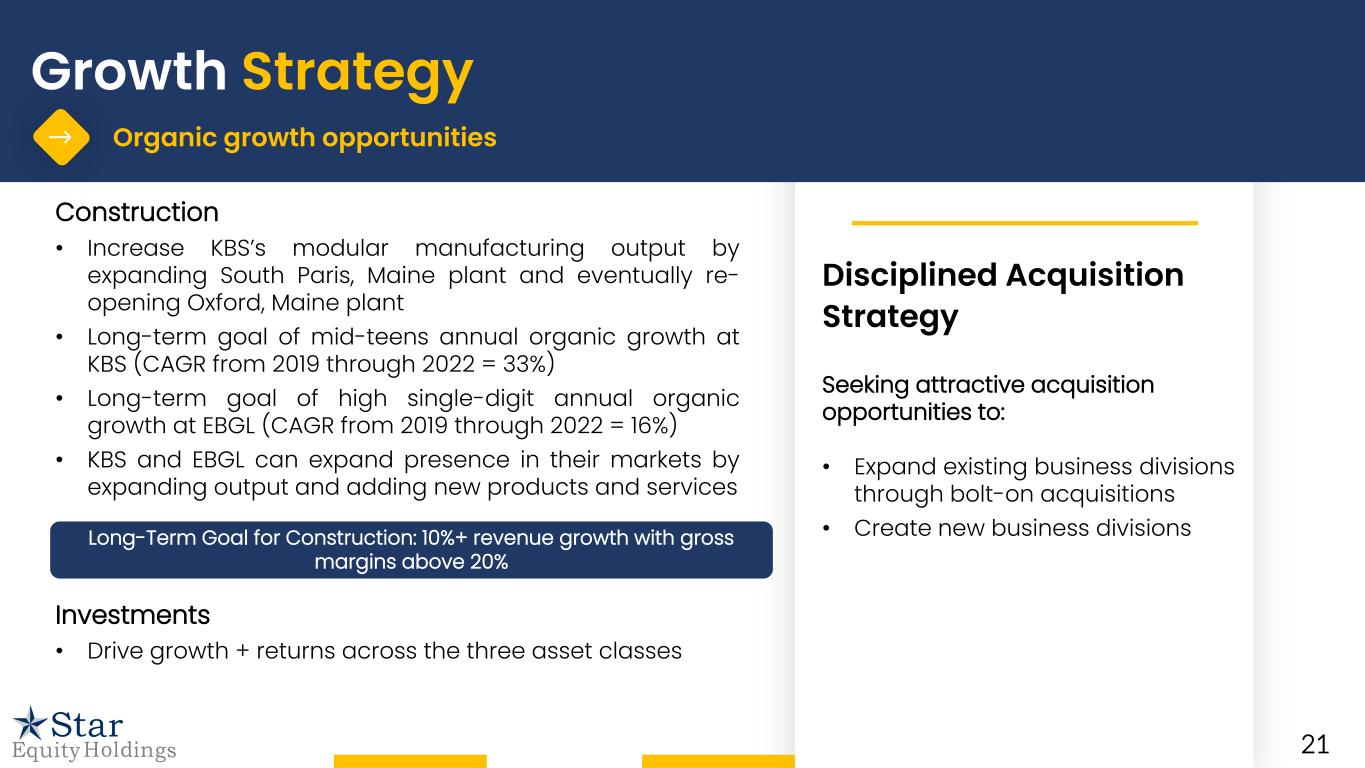 21 Disciplined Acquisition Strategy Seeking attractive acquisition opportunities to: • Expand existing business divisions through bolt-on acquisitions • Create new business divisions Construction • Increase KBS’s modular manufacturing output by expanding South Paris, Maine plant and eventually re- opening Oxford, Maine plant • Long-term goal of mid-teens annual organic growth at KBS (CAGR from 2019 through 2022 = 33%) • Long-term goal of high single-digit annual organic growth at EBGL (CAGR from 2019 through 2022 = 16%) • KBS and EBGL can expand presence in their markets by expanding output and adding new products and services Investments • Drive growth + returns across the three asset classes Growth Strategy Organic growth opportunities Long-Term Goal for Construction: 10%+ revenue growth with gross margins above 20%