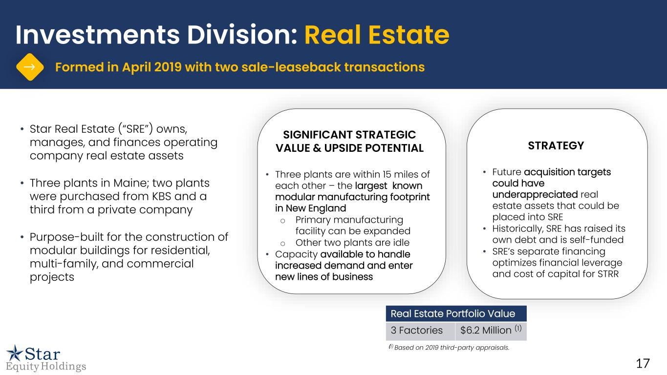 17 Investments Division: Real Estate STRATEGY • Future acquisition targets could have underappreciated real estate assets that could be placed into SRE • Historically, SRE has raised its own debt and is self-funded • SRE’s separate financing optimizes financial leverage and cost of capital for STRR SIGNIFICANT STRATEGIC VALUE & UPSIDE POTENTIAL • Three plants are within 15 miles of each other – the largest known modular manufacturing footprint in New England o Primary manufacturing facility can be expanded o Other two plants are idle • Capacity available to handle increased demand and enter new lines of business • Star Real Estate (“SRE”) owns, manages, and finances operating company real estate assets • Three plants in Maine; two plants were purchased from KBS and a third from a private company • Purpose-built for the construction of modular buildings for residential, multi-family, and commercial projects Real Estate Portfolio Value 3 Factories $6.2 Million (1) (1) Based on 2019 third-party appraisals. Formed in April 2019 with two sale-leaseback transactions