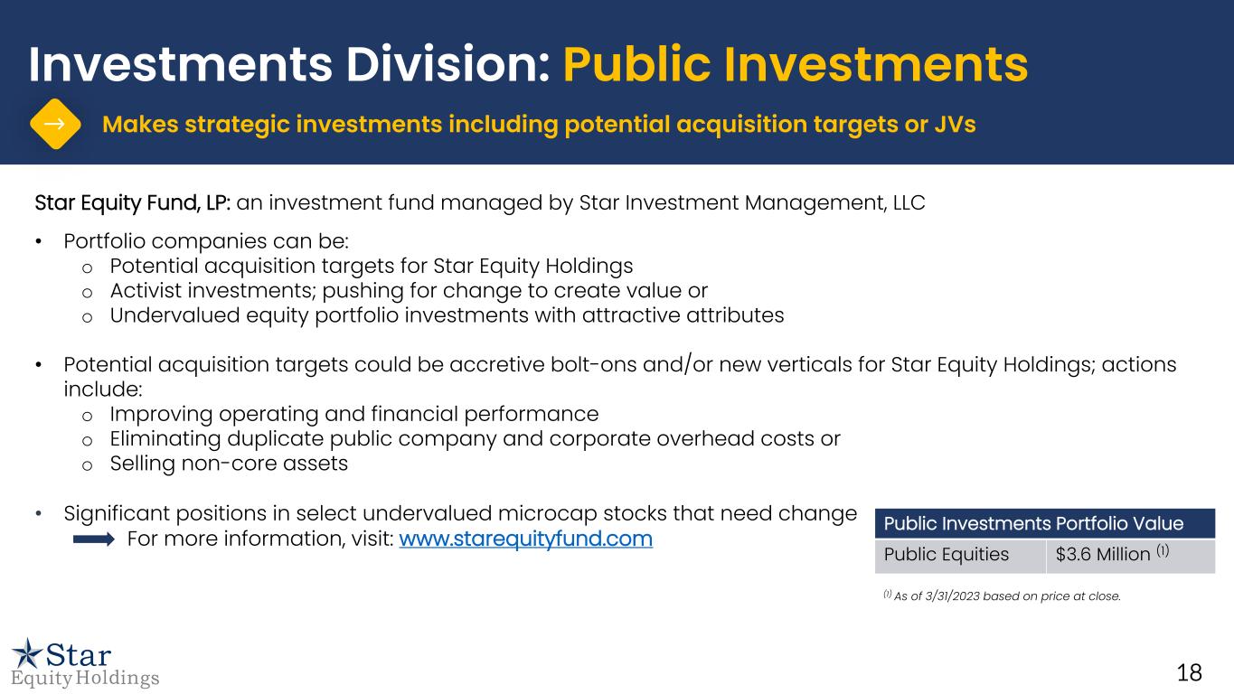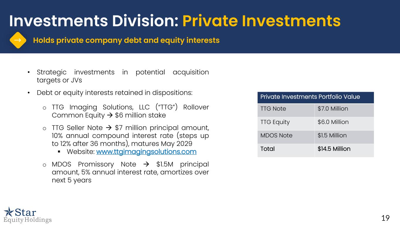 18 Investments Division: Public Investments Star Equity Fund, LP: an investment fund managed by Star Investment Management, LLC • Portfolio companies can be: o Potential acquisition targets for Star Equity Holdings o Activist investments; pushing for change to create value or o Undervalued equity portfolio investments with attractive attributes • Potential acquisition targets could be accretive bolt-ons and/or new verticals for Star Equity Holdings; actions include: o Improving operating and financial performance o Eliminating duplicate public company and corporate overhead costs or o Selling non-core assets • Significant positions in select undervalued microcap stocks that need change For more information, visit: www.starequityfund.com Public Investments Portfolio Value Public Equities $3.6 Million (1) (1) As of 3/31/2023 based on price at close. Makes strategic investments including potential acquisition targets or JVs