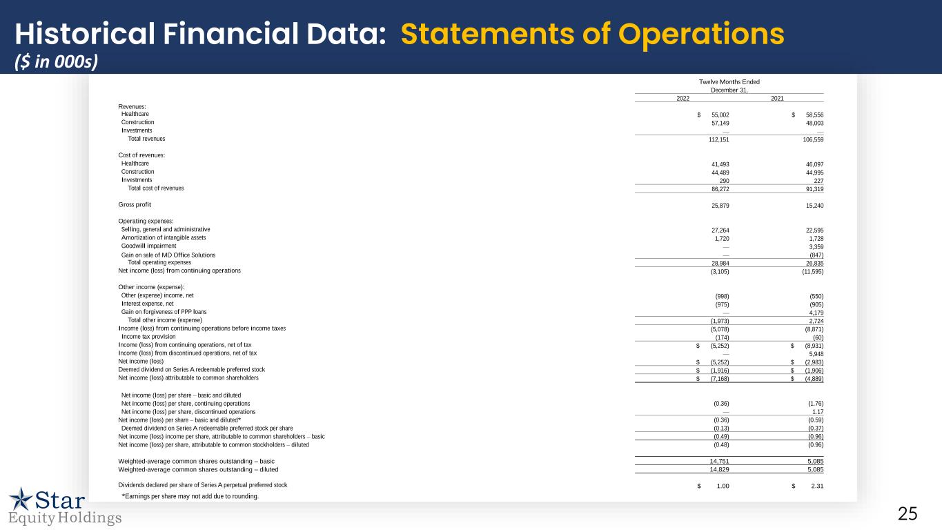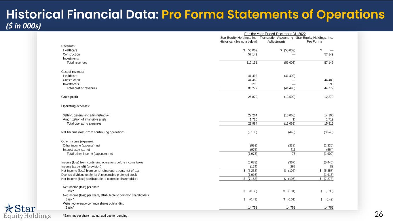 25 Historical Financial Data: Statements of Operations ($ in 000s) Twelve Months Ended December 31, 2022 2021 Revenues: Healthcare $ 55,002 $ 58,556 Construction 57,149 48,003 Investments — — Total revenues 112,151 106,559 Cost of revenues: Healthcare 41,493 46,097 Construction 44,489 44,995 Investments 290 227 Total cost of revenues 86,272 91,319 Gross profit 25,879 15,240 Operating expenses: Selling, general and administrative 27,264 22,595 Amortization of intangible assets 1,720 1,728 Goodwill impairment — 3,359 Gain on sale of MD Office Solutions — (847) Total operating expenses 28,984 26,835 Net income (loss) from continuing operations (3,105) (11,595) Other income (expense): Other (expense) income, net (998) (550) Interest expense, net (975) (905) Gain on forgiveness of PPP loans — 4,179 Total other income (expense) (1,973) 2,724 Income (loss) from continuing operations before income taxes (5,078) (8,871) Income tax provision (174) (60) Income (loss) from continuing operations, net of tax $ (5,252) $ (8,931) Income (loss) from discontinued operations, net of tax — 5,948 Net income (loss) $ (5,252) $ (2,983) Deemed dividend on Series A redeemable preferred stock $ (1,916) $ (1,906) Net income (loss) attributable to common shareholders $ (7,168) $ (4,889) Net income (loss) per share – basic and diluted Net income (loss) per share, continuing operations (0.36) (1.76) Net income (loss) per share, discontinued operations — 1.17 Net income (loss) per share – basic and diluted* (0.36) (0.59) Deemed dividend on Series A redeemable preferred stock per share (0.13) (0.37) Net income (loss) income per share, attributable to common shareholders – basic (0.49) (0.96) Net income (loss) per share, attributable to common stockholders – diluted (0.48) (0.96) Weighted-average common shares outstanding – basic 14,751 5,085 Weighted-average common shares outstanding – diluted 14,829 5,085 Dividends declared per share of Series A perpetual preferred stock $ 1.00 $ 2.31 *Earnings per share may not add due to rounding.