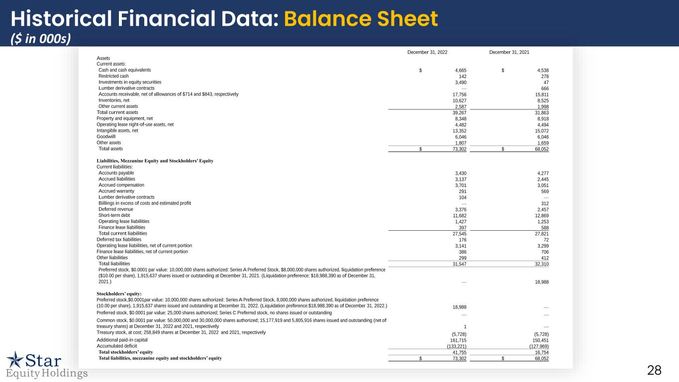 28 Historical Financial Data: Balance Sheet ($ in 000s) December 31, 2022 December 31, 2021 Assets Current assets: Cash and cash equivalents $ 4,665 $ 4,538 Restricted cash 142 278 Investments in equity securities 3,490 47 Lumber derivative contracts — 666 Accounts receivable, net of allowances of $714 and $843, respectively 17,756 15,811 Inventories, net 10,627 8,525 Other current assets 2,587 1,998 Total current assets 39,267 31,863 Property and equipment, net 8,348 8,918 Operating lease right-of-use assets, net 4,482 4,494 Intangible assets, net 13,352 15,072 Goodwill 6,046 6,046 Other assets 1,807 1,659 Total assets $ 73,302 $ 68,052 Liabilities, Mezzanine Equity and Stockholders’ Equity Current liabilities: Accounts payable 3,430 4,277 Accrued liabilities 3,137 2,445 Accrued compensation 3,701 3,051 Accrued warranty 291 569 Lumber derivative contracts 104 — Billings in excess of costs and estimated profit — 312 Deferred revenue 3,376 2,457 Short-term debt 11,682 12,869 Operating lease liabilities 1,427 1,253 Finance lease liabilities 397 588 Total current liabilities 27,545 27,821 Deferred tax liabilities 176 72 Operating lease liabilities, net of current portion 3,141 3,299 Finance lease liabilities, net of current portion 386 706 Other liabilities 299 412 Total liabilities 31,547 32,310 Preferred stock, $0.0001 par value: 10,000,000 shares authorized: Series A Preferred Stock, $8,000,000 shares authorized, liquidation preference ($10.00 per share), 1,915,637 shares issued or outstanding at December 31, 2021. (Liquidation preference: $18,988,390 as of December 31, 2021.) — 18,988 Stockholders’ equity: Preferred stock,$0.0001par value: 10,000,000 shares authorized: Series A Preferred Stock, 8,000,000 shares authorized, liquidation preference (10.00 per share), 1,915,637 shares issued and outstanding at December 31, 2022. (Liquidation preference:$18,988,390 as of December 31, 2022.) 18,988 — Preferred stock, $0.0001 par value: 25,000 shares authorized; Series C Preferred stock, no shares issued or outstanding — — Common stock, $0.0001 par value: 50,000,000 and 30,000,000 shares authorized; 15,177,919 and 5,805,916 shares issued and outstanding (net of treasury shares) at December 31, 2022 and 2021, respectively 1 — Treasury stock, at cost; 258,849 shares at December 31, 2022 and 2021, respectively (5,728) (5,728) Additional paid-in capital 161,715 150,451 Accumulated deficit (133,221) (127,969) Total stockholders’ equity 41,755 16,754 Total liabilities, mezzanine equity and stockholders’ equity $ 73,302 $ 68,052