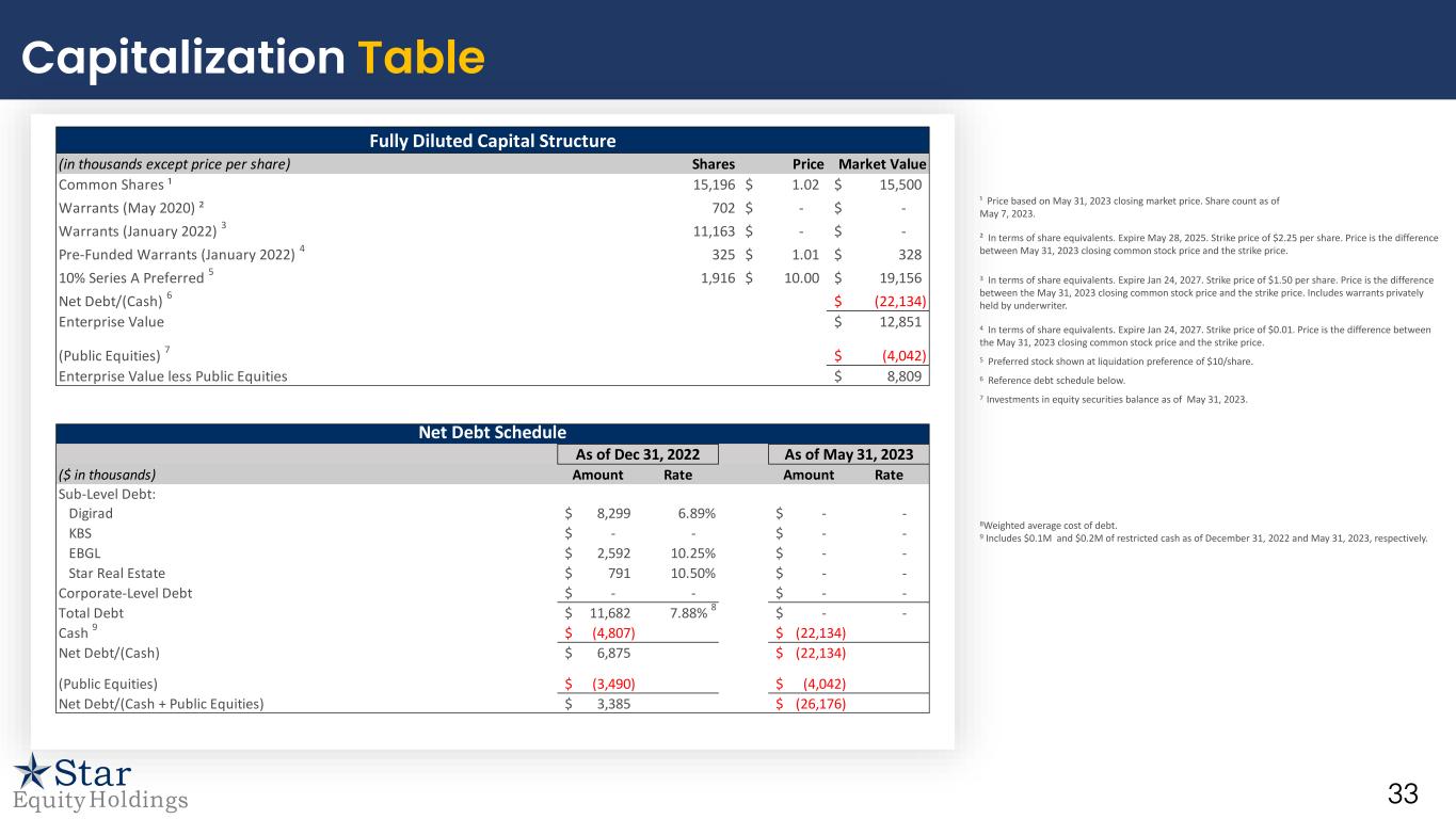 33 Capitalization Table 8Weighted average cost of debt. 9 Includes $0.1M and $0.2M of restricted cash as of December 31, 2022 and May 31, 2023, respectively. ¹ Price based on May 31, 2023 closing market price. Share count as of May 7, 2023. ² In terms of share equivalents. Expire May 28, 2025. Strike price of $2.25 per share. Price is the difference between May 31, 2023 closing common stock price and the strike price. 3 In terms of share equivalents. Expire Jan 24, 2027. Strike price of $1.50 per share. Price is the difference between the May 31, 2023 closing common stock price and the strike price. Includes warrants privately held by underwriter. 4 In terms of share equivalents. Expire Jan 24, 2027. Strike price of $0.01. Price is the difference between the May 31, 2023 closing common stock price and the strike price. 5 Preferred stock shown at liquidation preference of $10/share. 6 Reference debt schedule below. 7 Investments in equity securities balance as of May 31, 2023. (in thousands except price per share) Shares Price Market Value Common Shares ¹ 15,196 1.02$ 15,500$ Warrants (May 2020) ² 702 -$ -$ Warrants (January 2022) 3 11,163 -$ -$ Pre-Funded Warrants (January 2022) 4 325 1.01$ 328$ 10% Series A Preferred 5 1,916 10.00$ 19,156$ Net Debt/(Cash) 6 (22,134)$ Enterprise Value 12,851$ (Public Equities) 7 (4,042)$ Enterprise Value less Public Equities 8,809$ Fully Diluted Capital Structure ($ in thousands) Amount Rate Amount Rate Sub-Level Debt: Digirad 8,299$ 6.89% -$ - KBS -$ - -$ - EBGL 2,592$ 10.25% -$ - Star Real Estate 791$ 10.50% -$ - Corporate-Level Debt -$ - -$ - Total Debt 11,682$ 7.88% 8 -$ - Cash 9 (4,807)$ (22,134)$ Net Debt/(Cash) 6,875$ (22,134)$ (Public Equities) (3,490)$ (4,042)$ Net Debt/(Cash + Public Equities) 3,385$ (26,176)$ As of May 31, 2023As of Dec 31, 2022 Net Debt Schedule